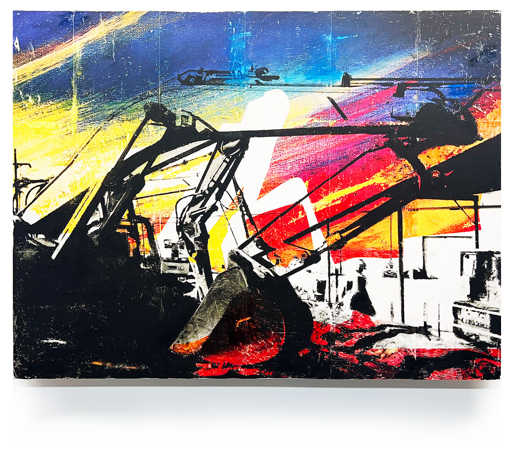 Commissioned pieces for Scott Equipment headquarters office building. I shot images of their equipment, created compositions digitally, then transferred them onto canvas, then used acrylic paint on top to finish. Also created 3 collage pieces, printed them and mounted on wood panel and wrapped in clear packing tape. April 2024. Various sizes.
