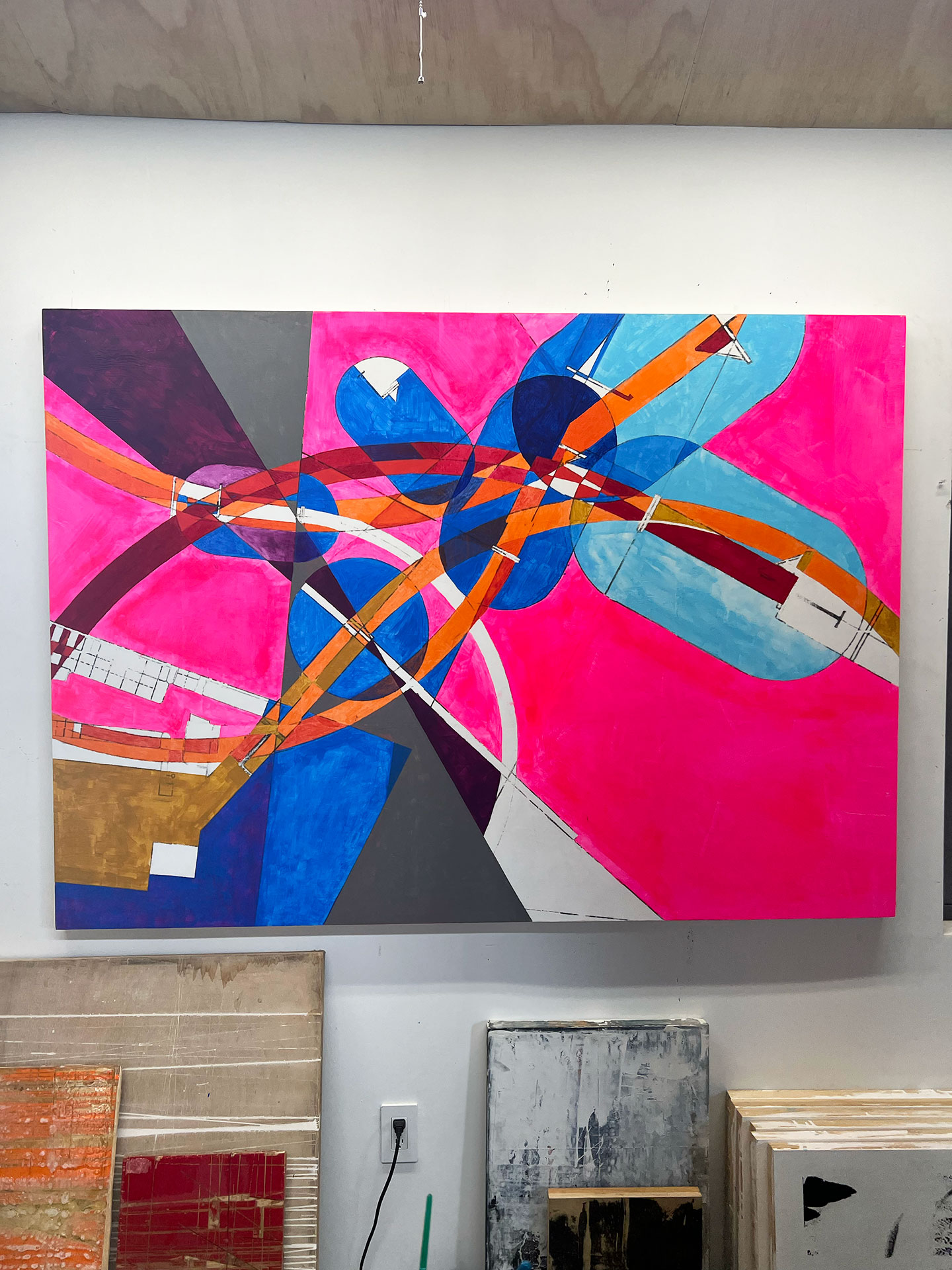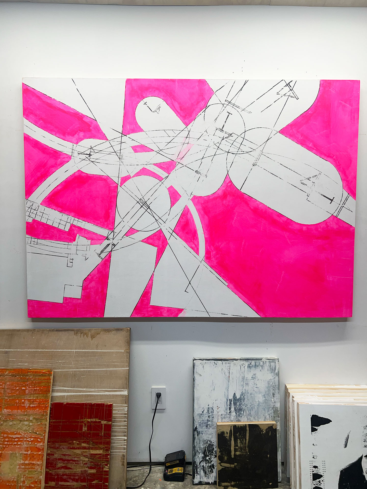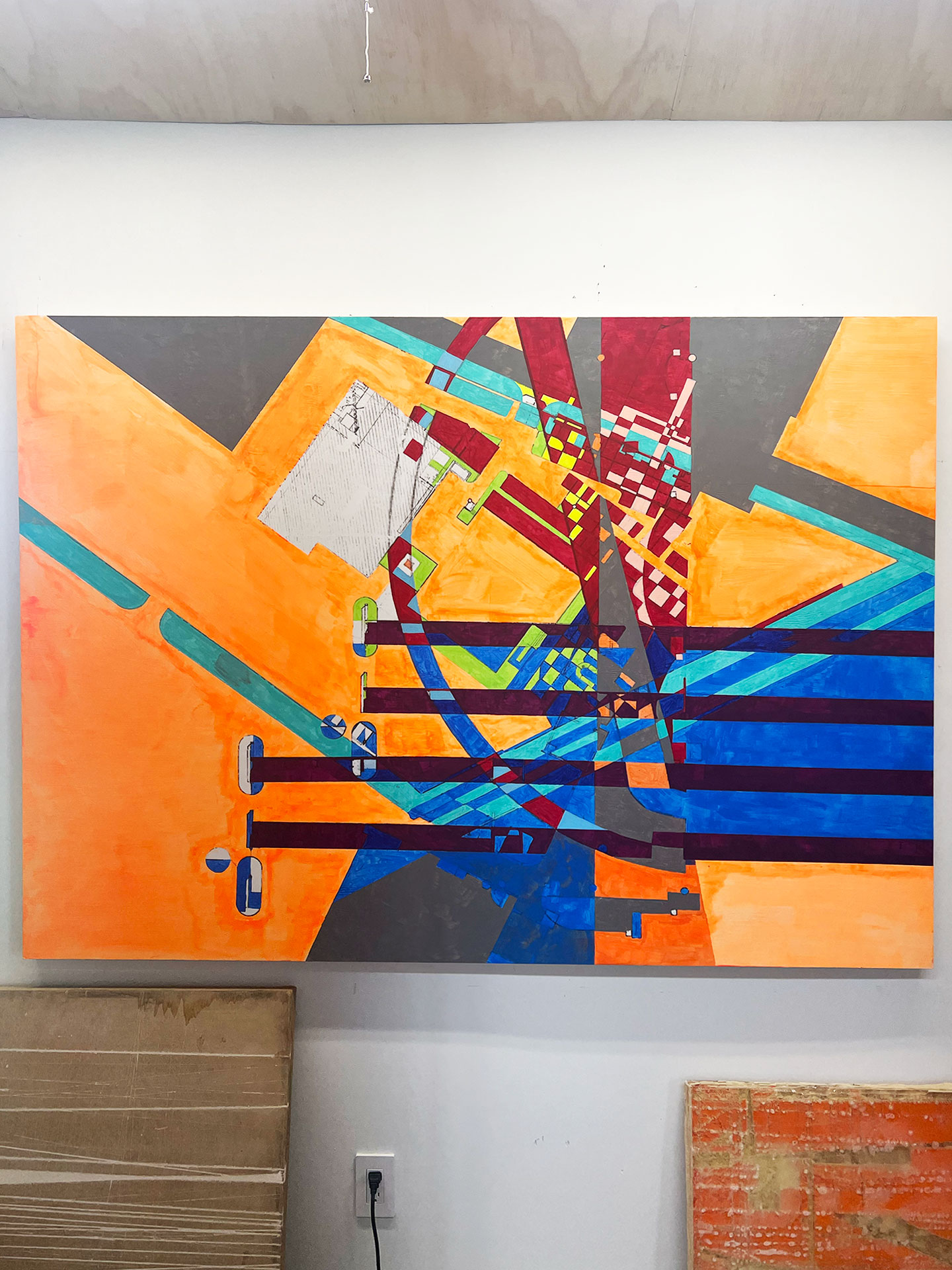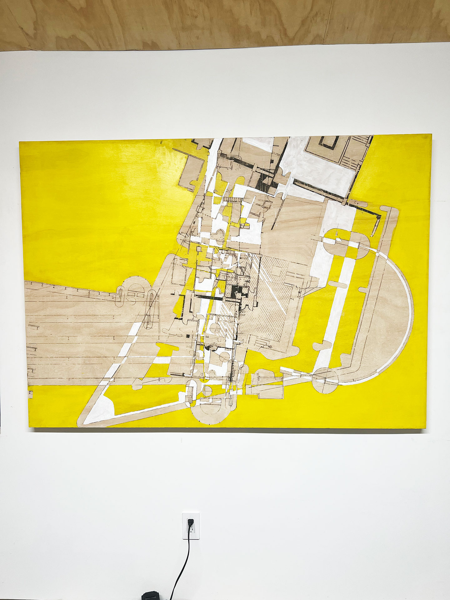A series of commissioned paintings for 1500 Tower Place, a multi-story office building. They are derived from the building's floor plans. I photographed the floor plans, created a composition digitally by layering them on top of each other, then transferred the line work onto a wood panel, then painted in the shapes the overlapping plans created. Acrylic on wood panel – 4'x5'– March 2024.