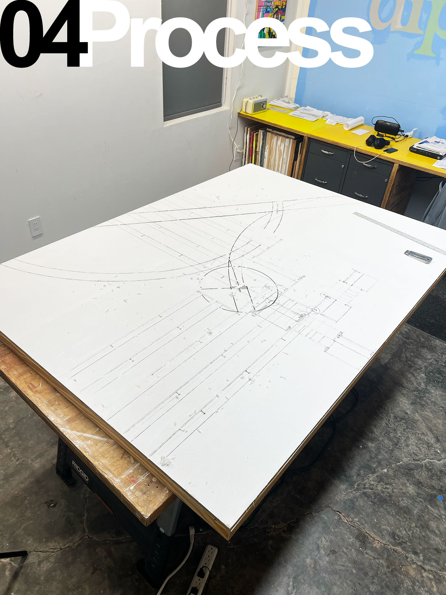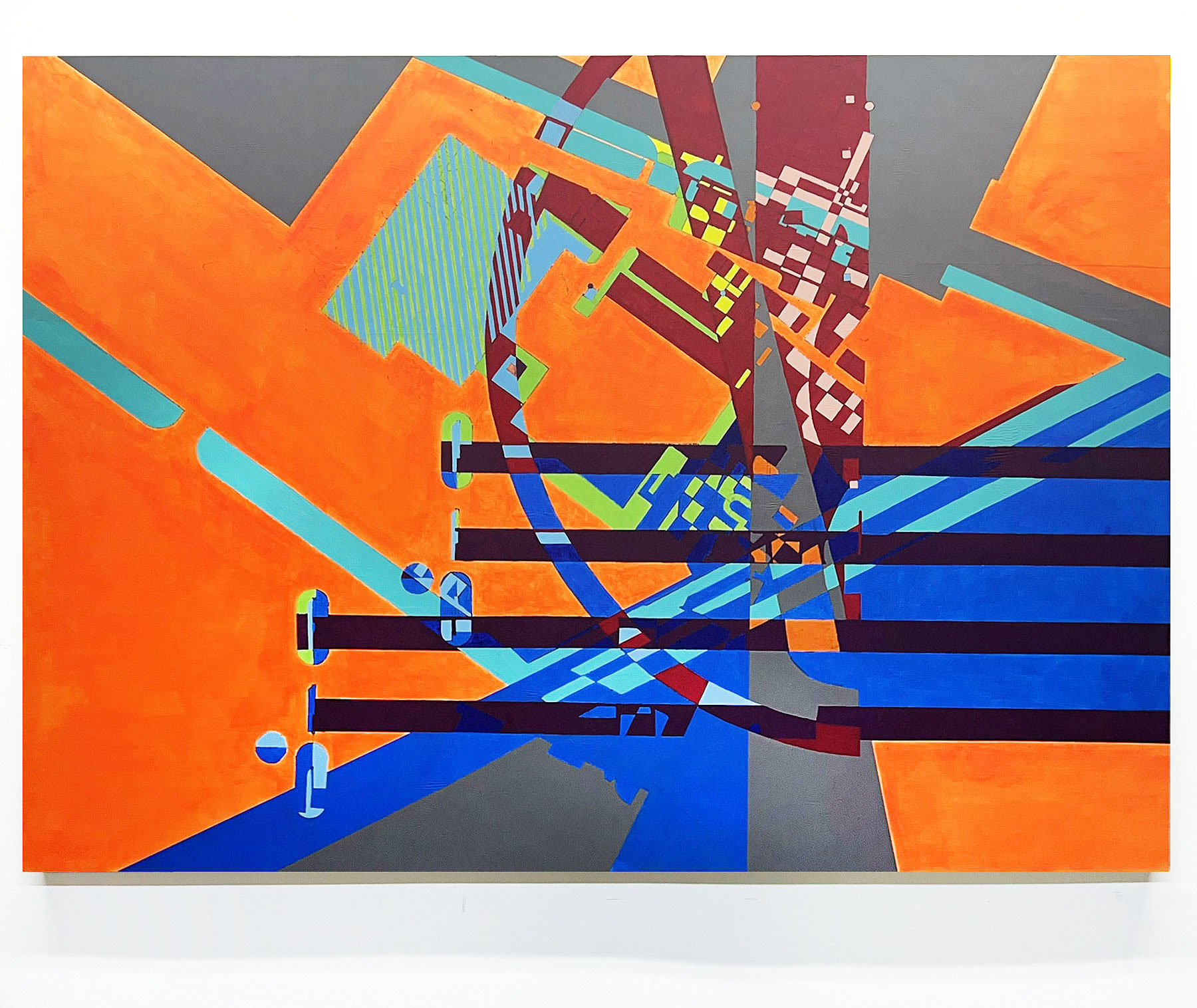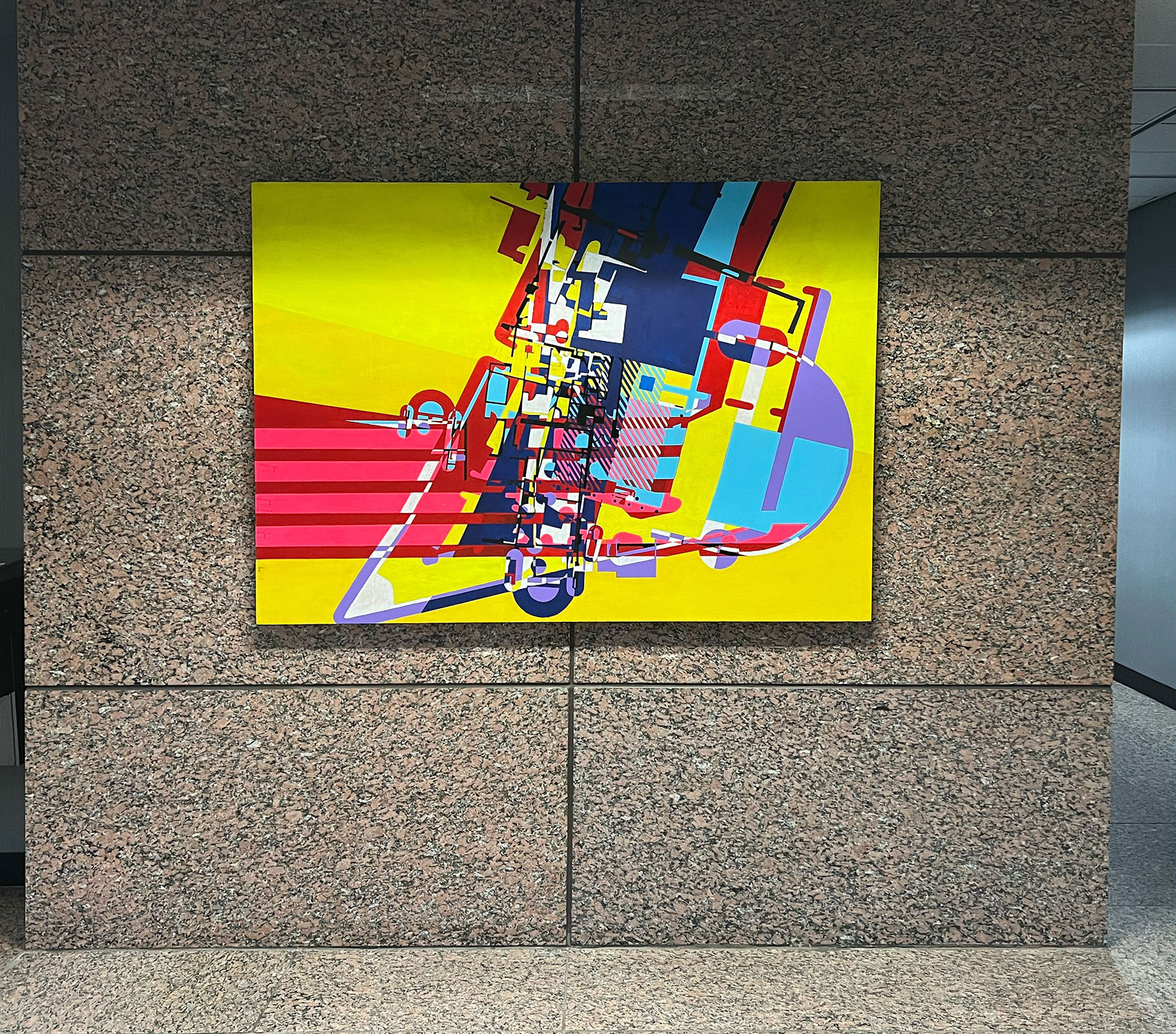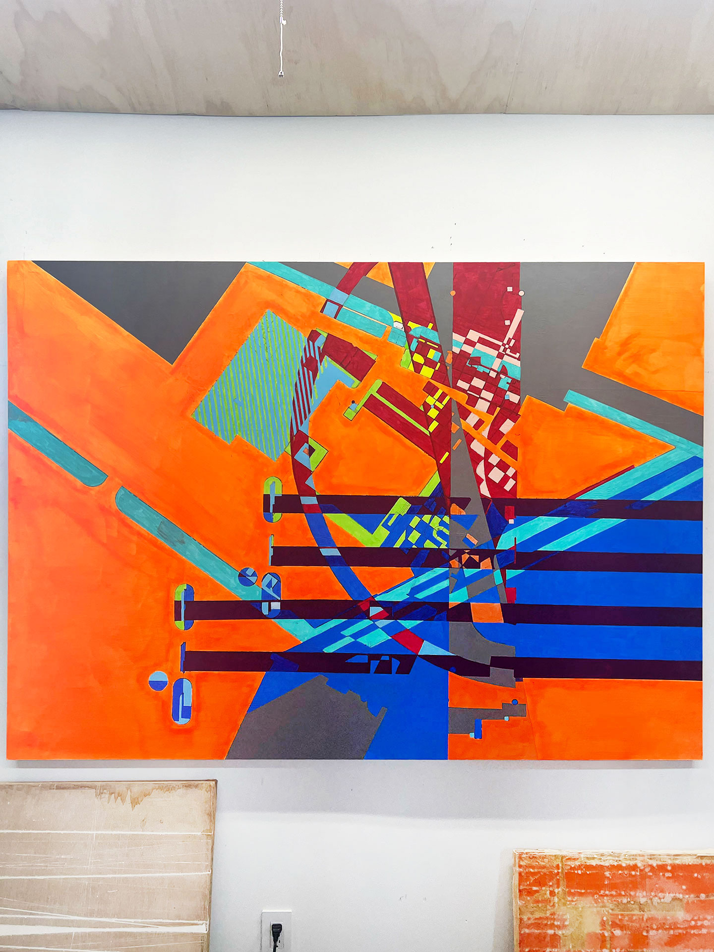 A series of commissioned paintings for 1500 Tower Place, a multi-story office building. They are derived from the building's floor plans. I photographed the floor plans, created a composition digitally by layering them on top of each other, then transferred the line work onto a wood panel, then painted in the shapes the overlapping plans created. Acrylic on wood panel – 4'x5'– March 2024.