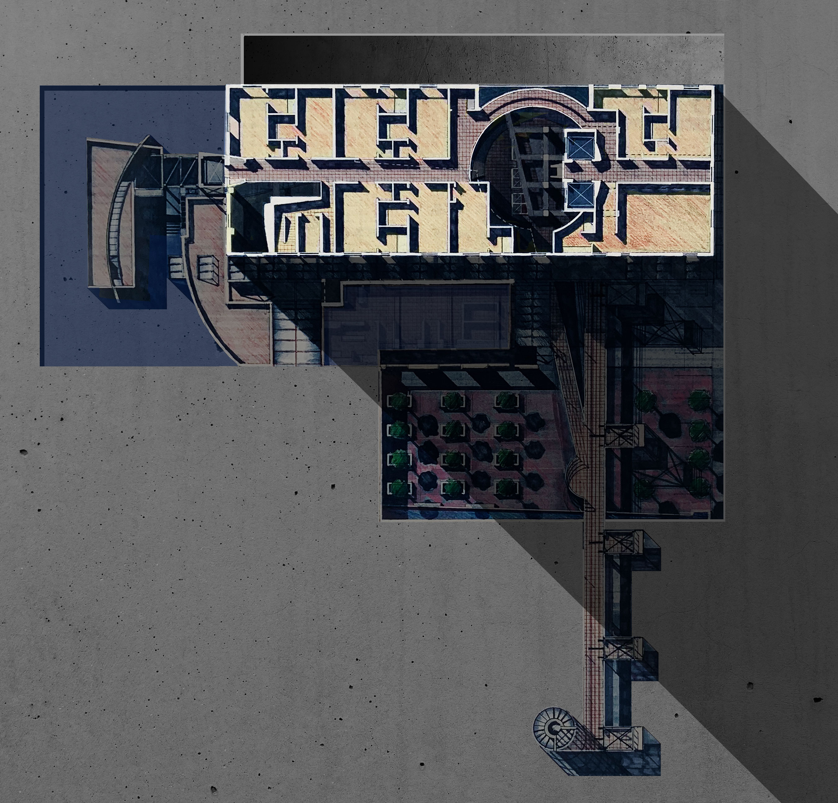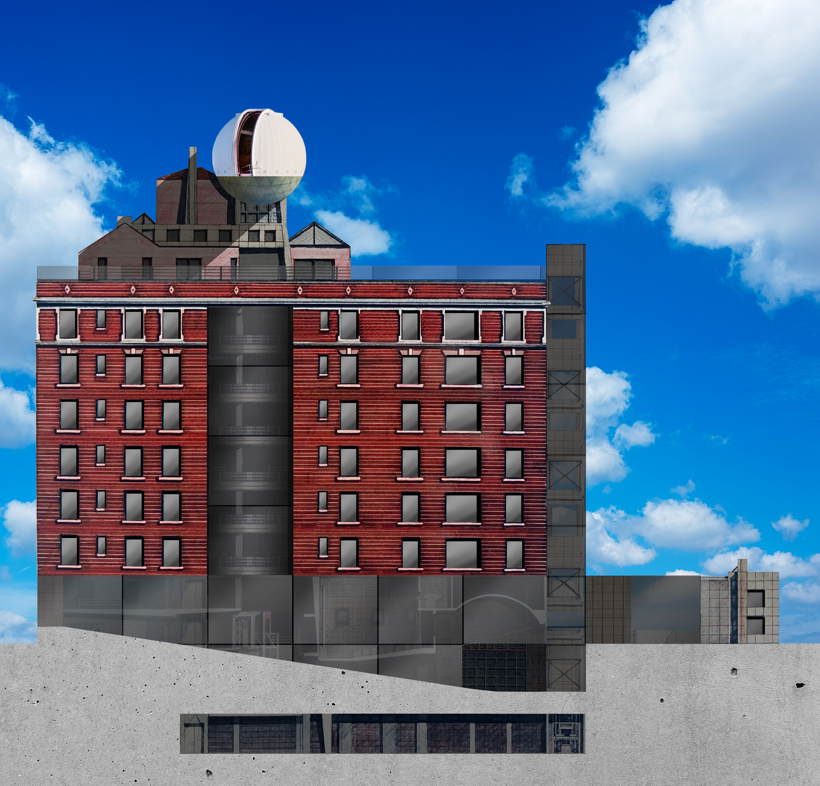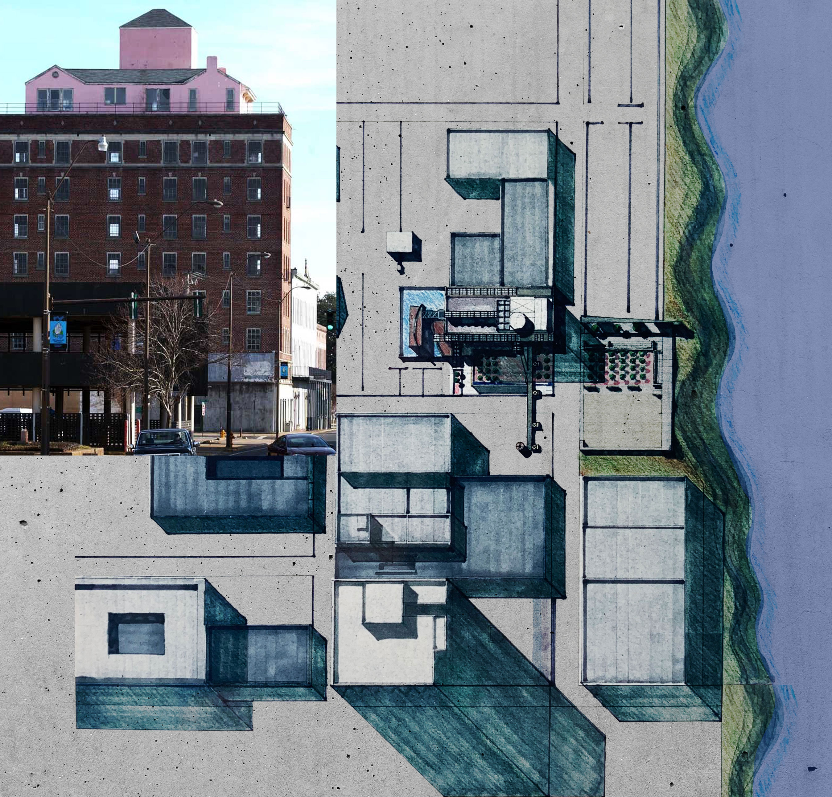 Thesis project at Louisiana Tech University architecture school, 1993. The redesign of an existing 1920′s hotel building, bringing it into modern times. This building actually exists in my hometown and has a pink suburban house on the rooftop.