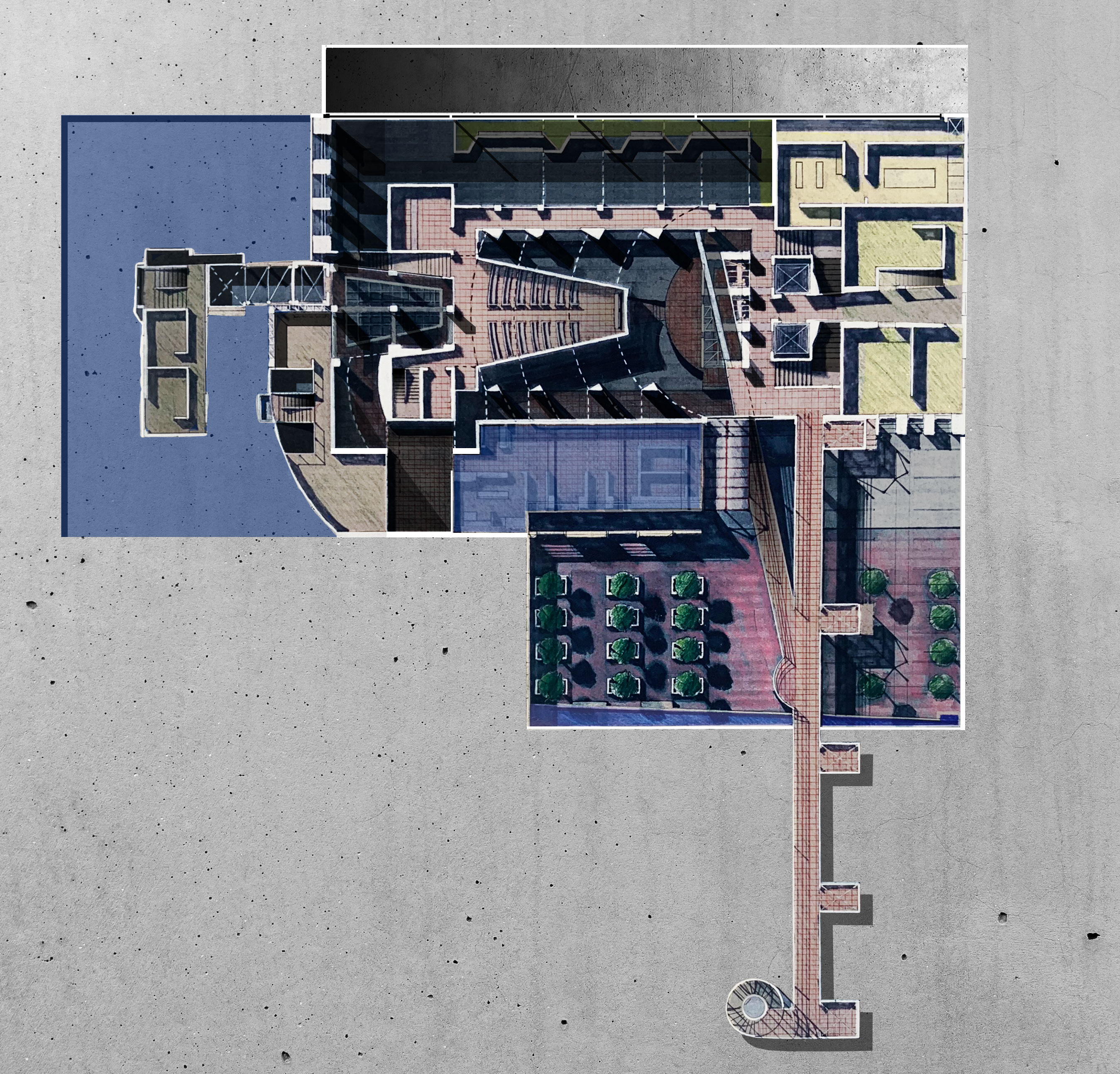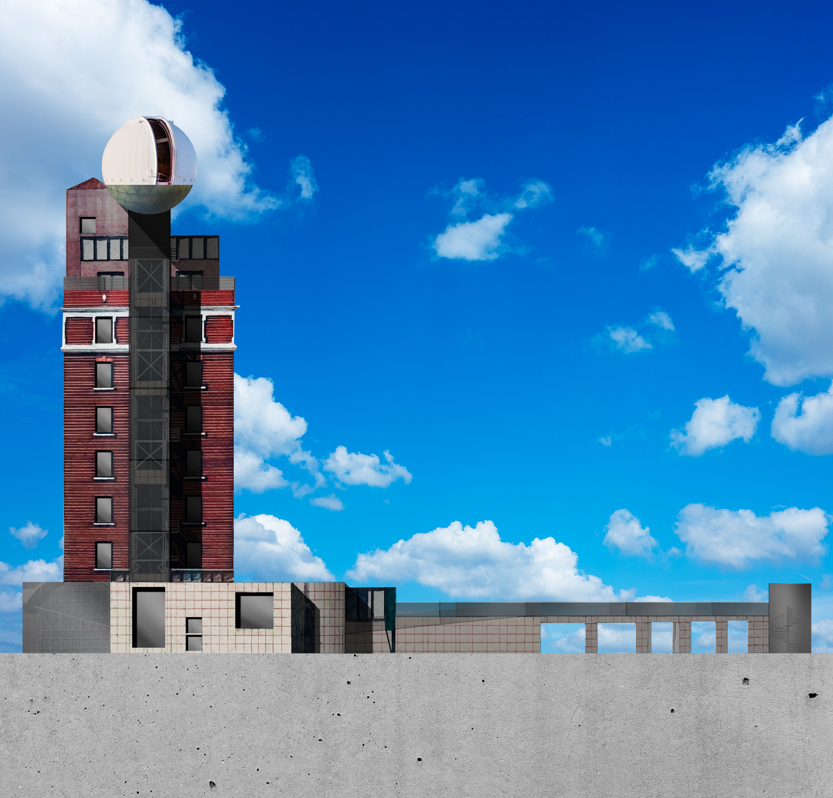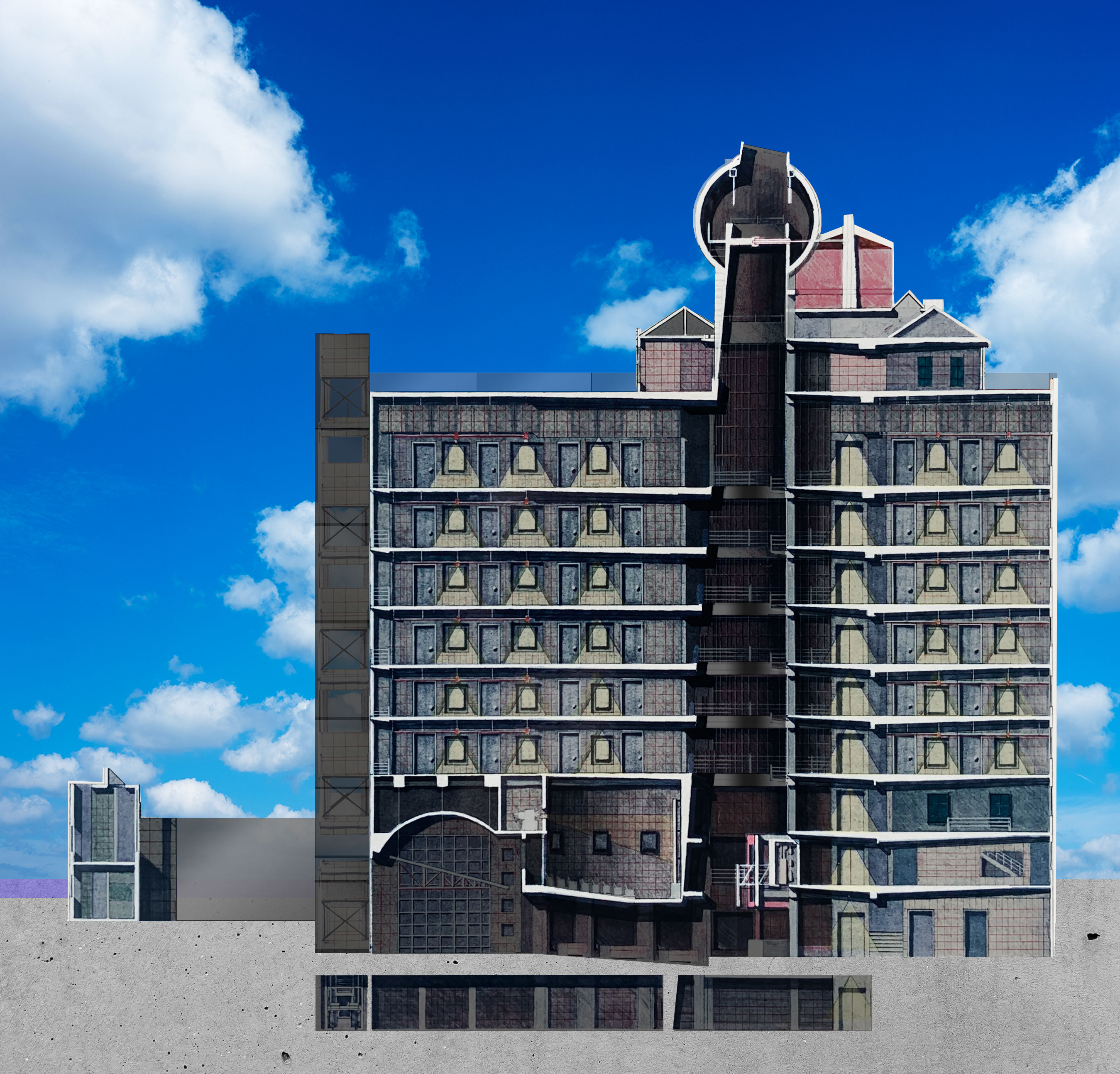 Thesis project at Louisiana Tech University architecture school, 1993. The redesign of an existing 1920′s hotel building, bringing it into modern times. This building actually exists in my hometown and has a pink suburban house on the rooftop.