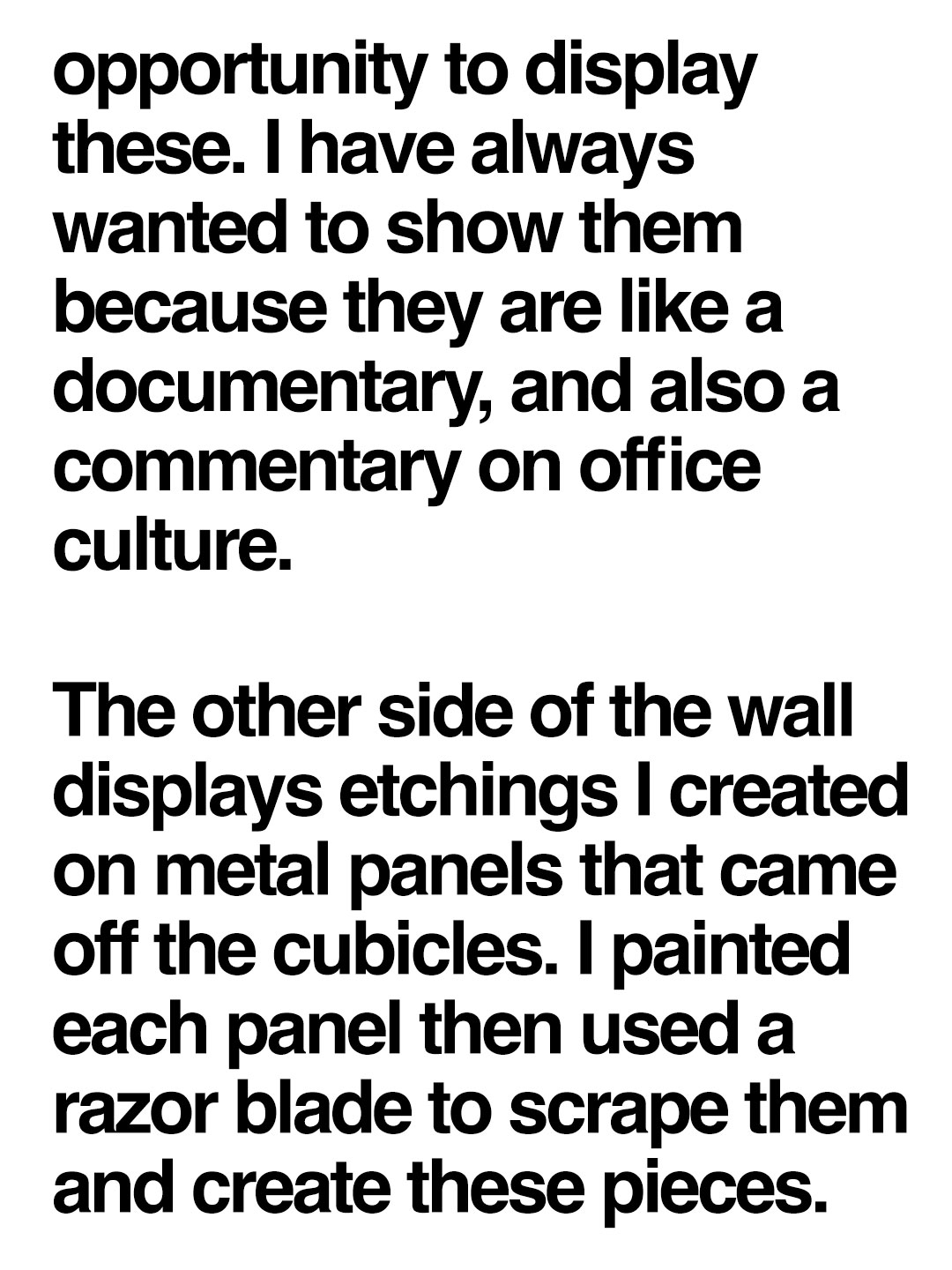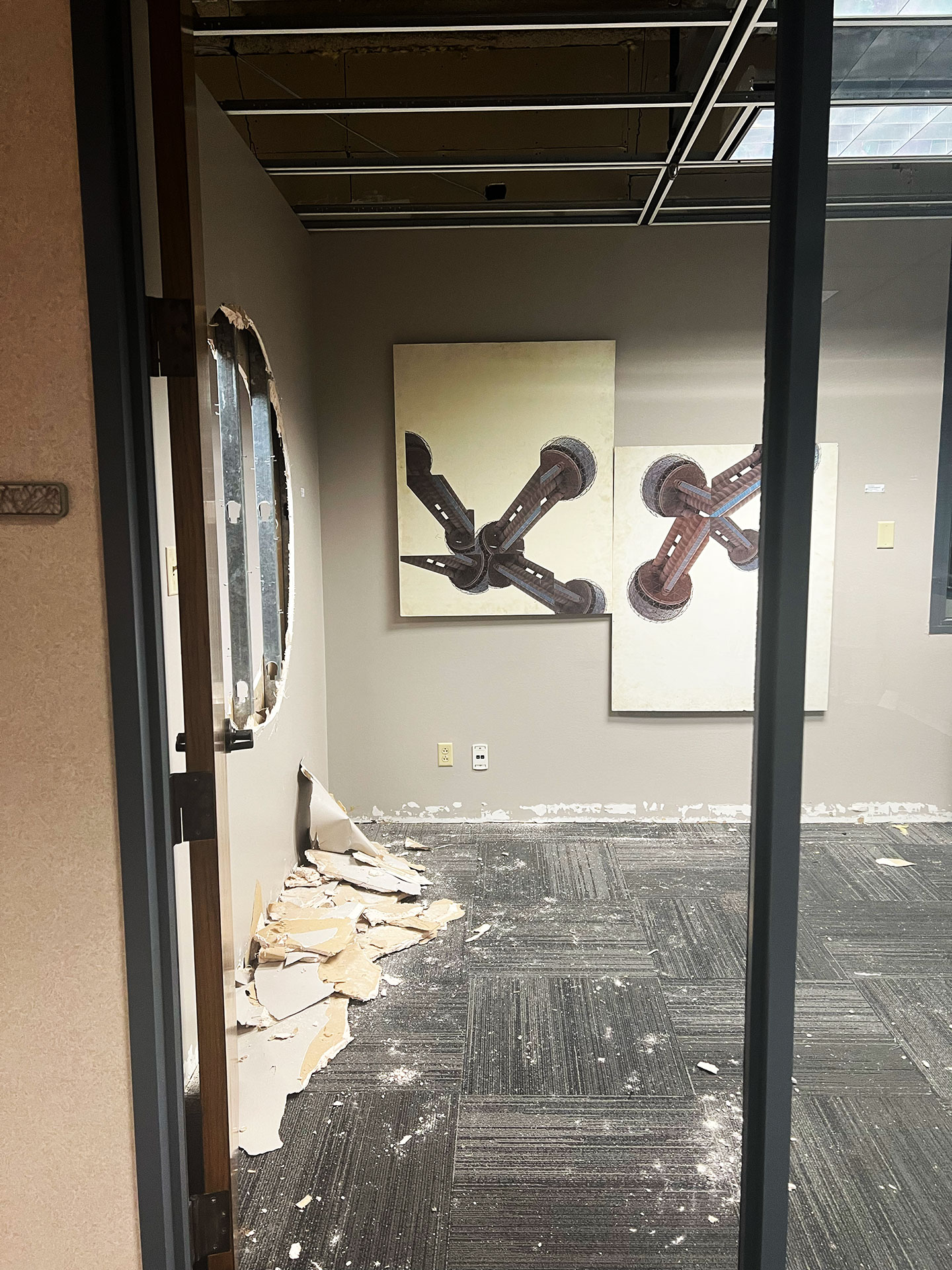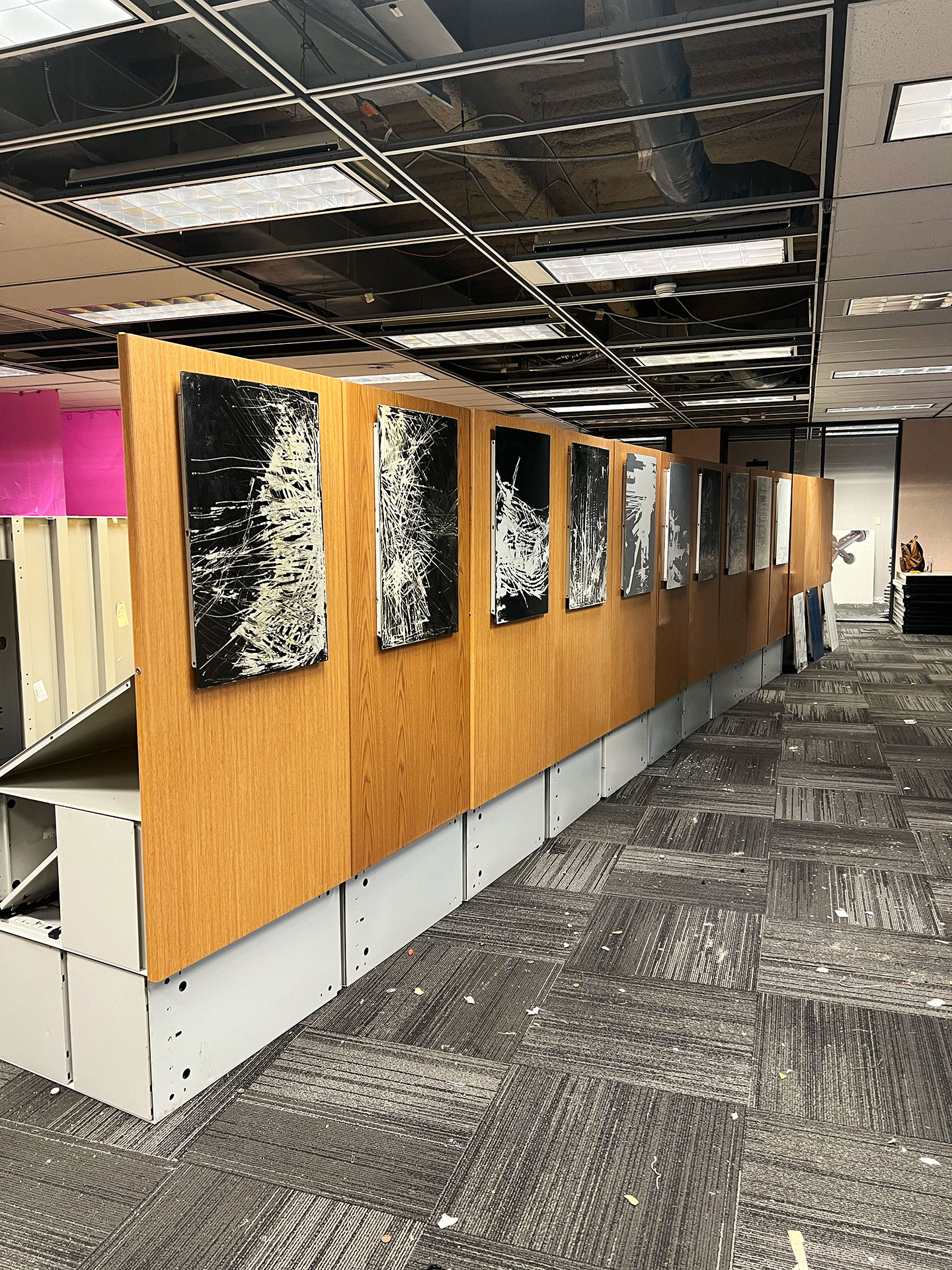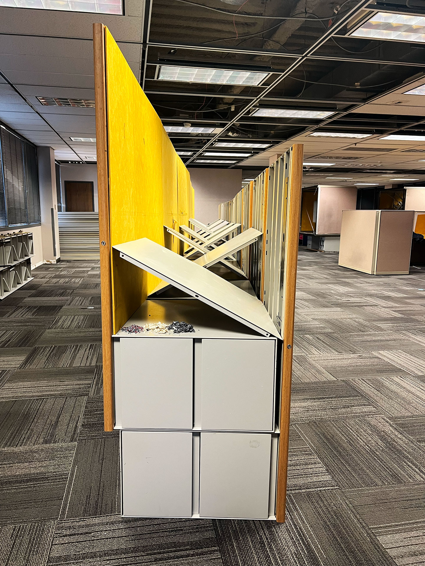 A group show titled Office Space. The concept was to turn an office floor full of old 1980's cubicles into an art space. Instead of just using them as displays, I took the cubicles apart and used the pieces to transform them into sculptures and installations. November 2023.