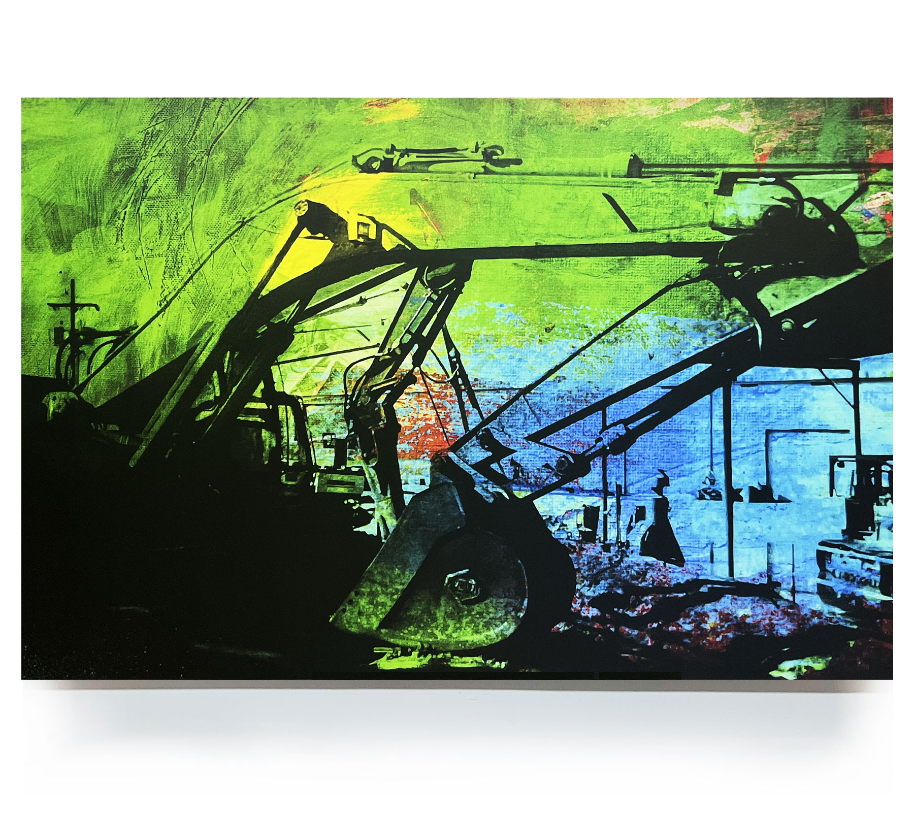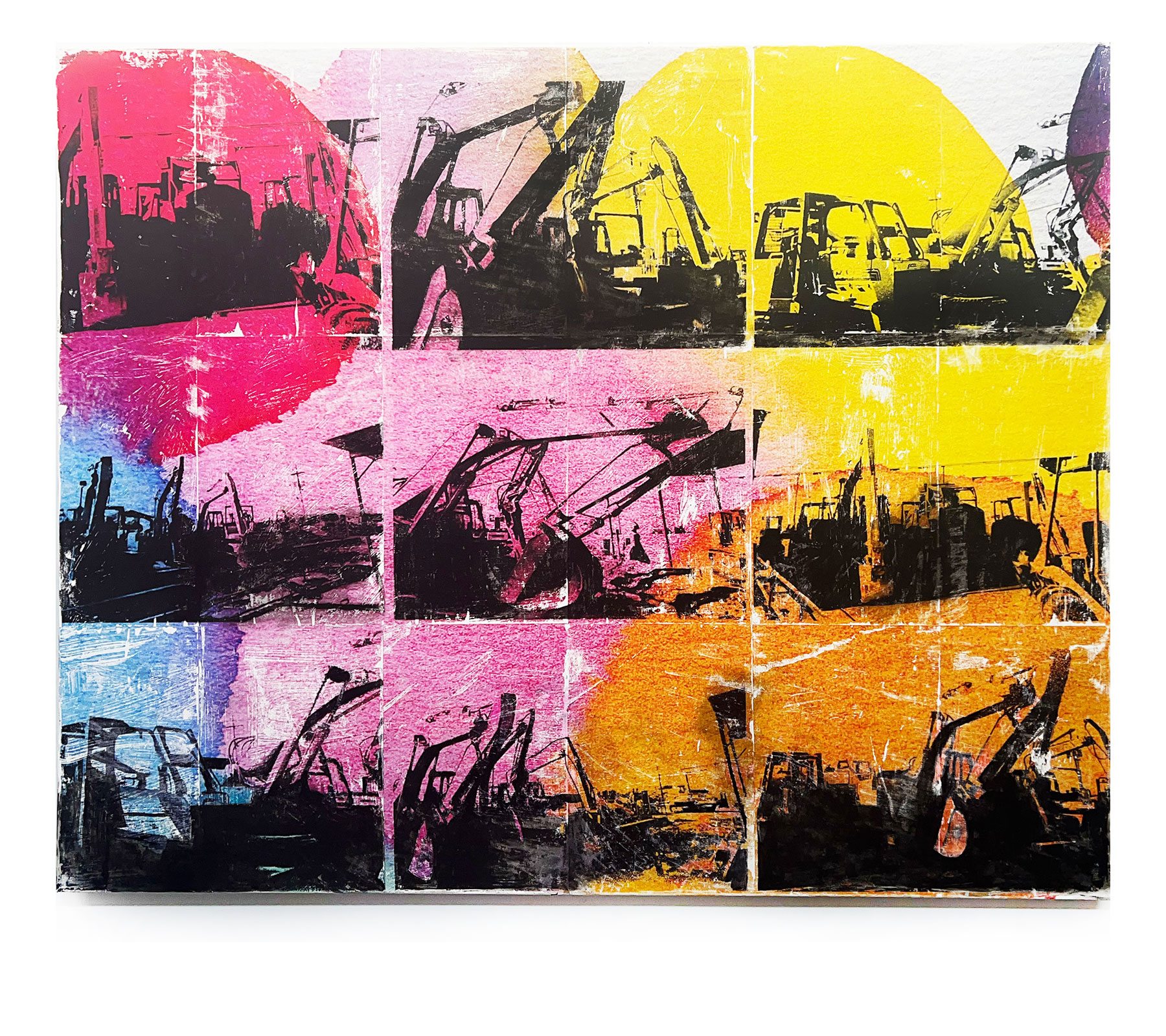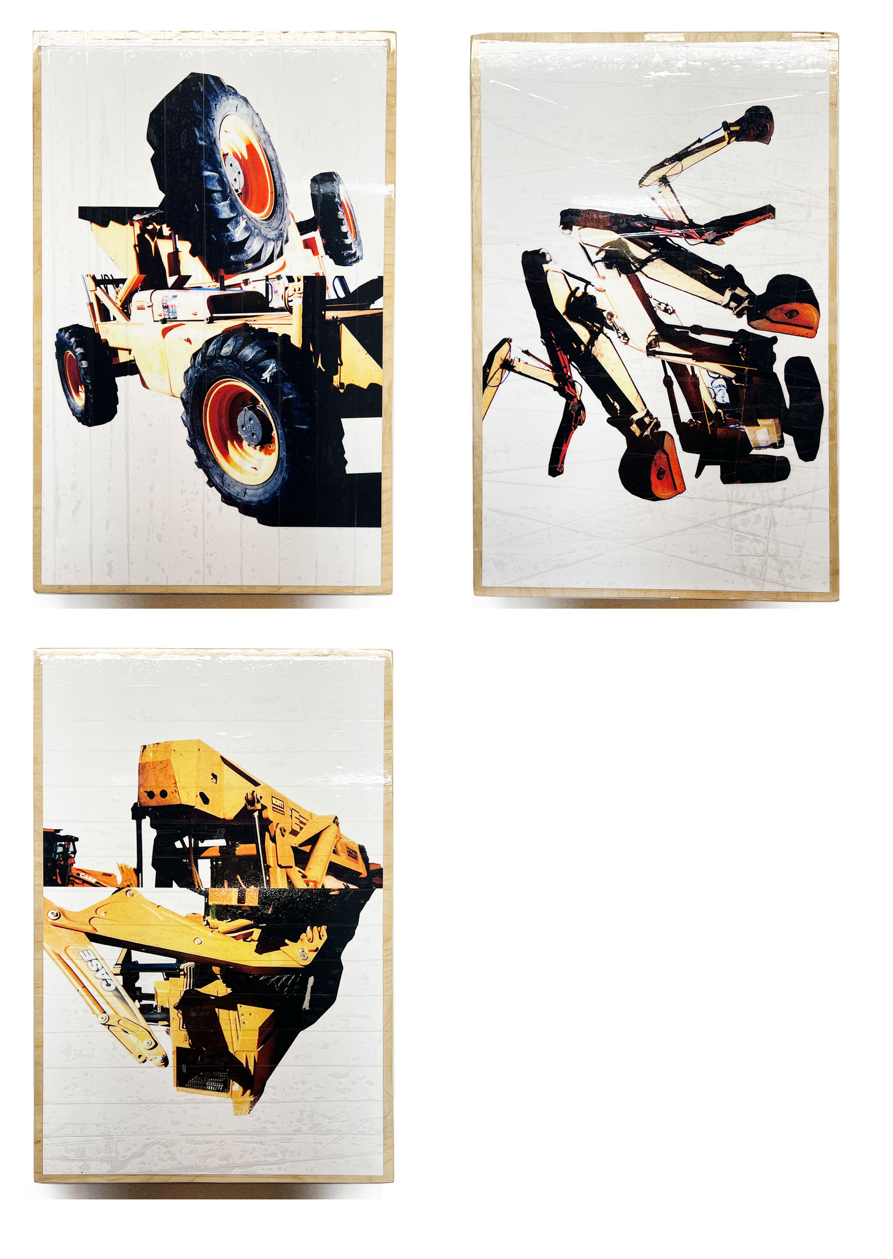 Commissioned pieces for Scott Equipment headquarters office building. I shot images of their equipment, created compositions digitally, then transferred them onto canvas, then used acrylic paint on top to finish. Also created 3 collage pieces, printed them and mounted on wood panel and wrapped in clear packing tape. April 2024. Various sizes.