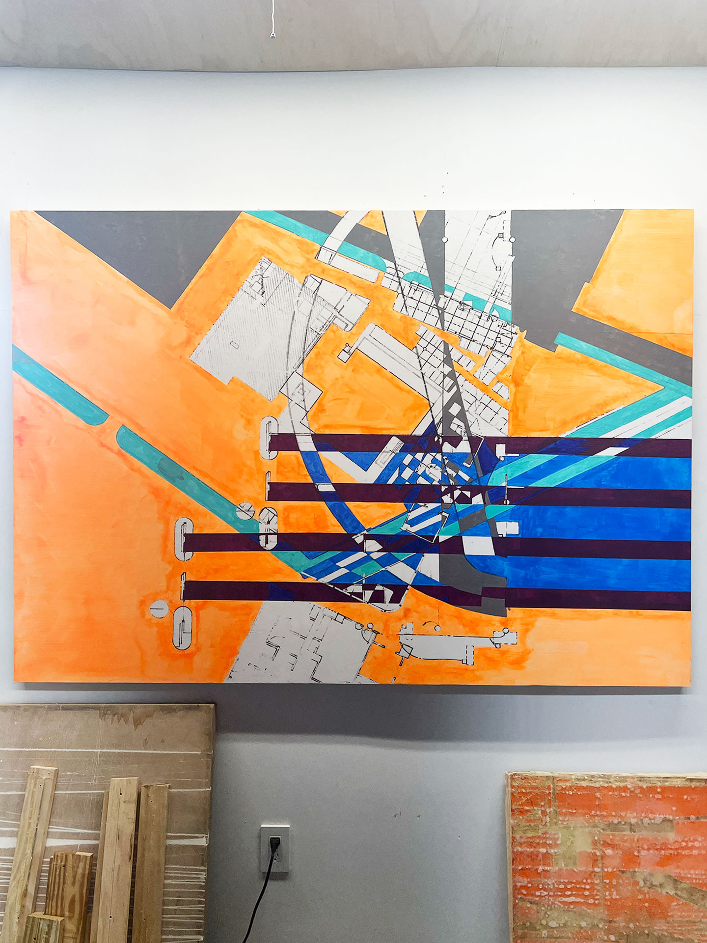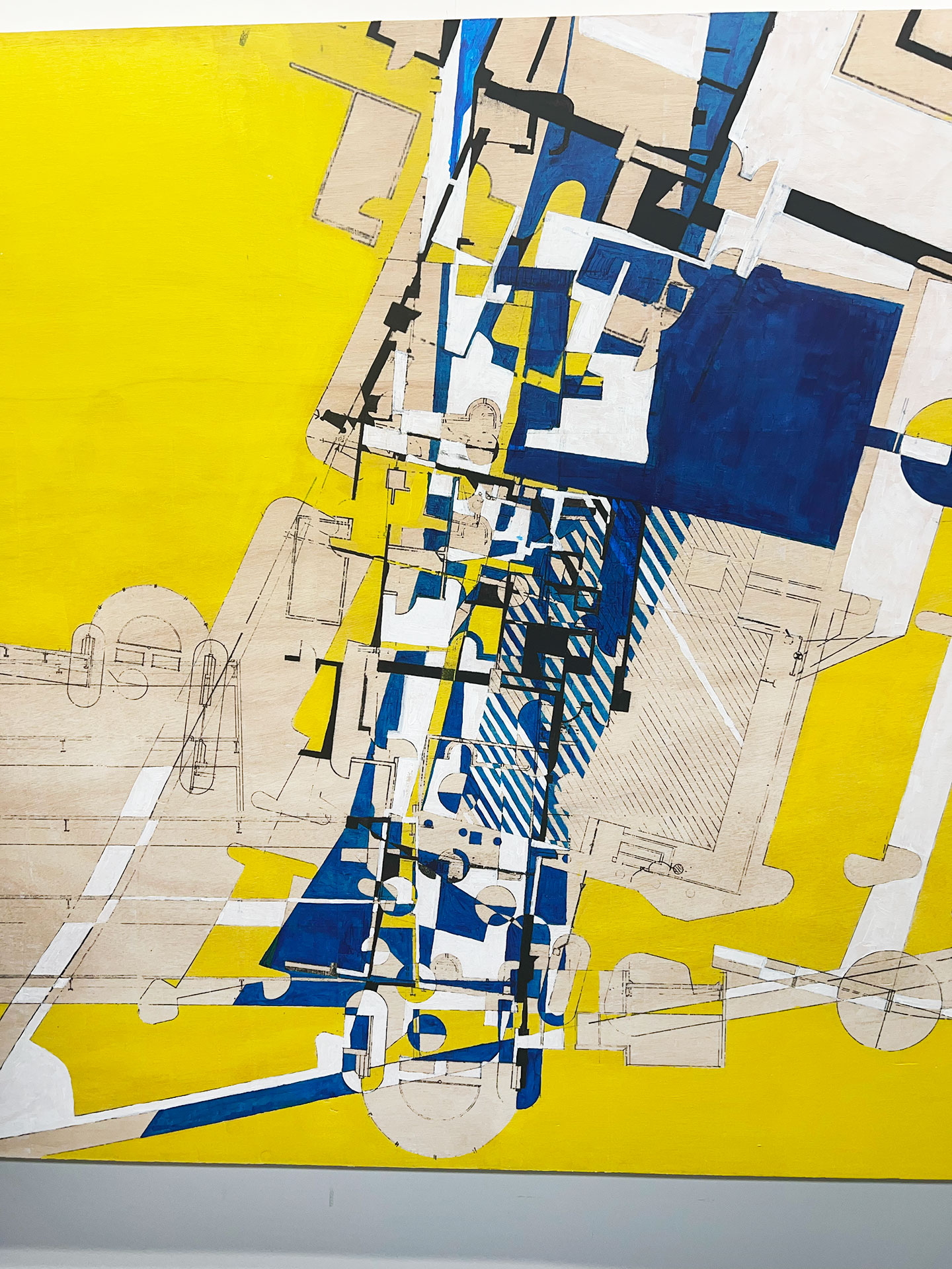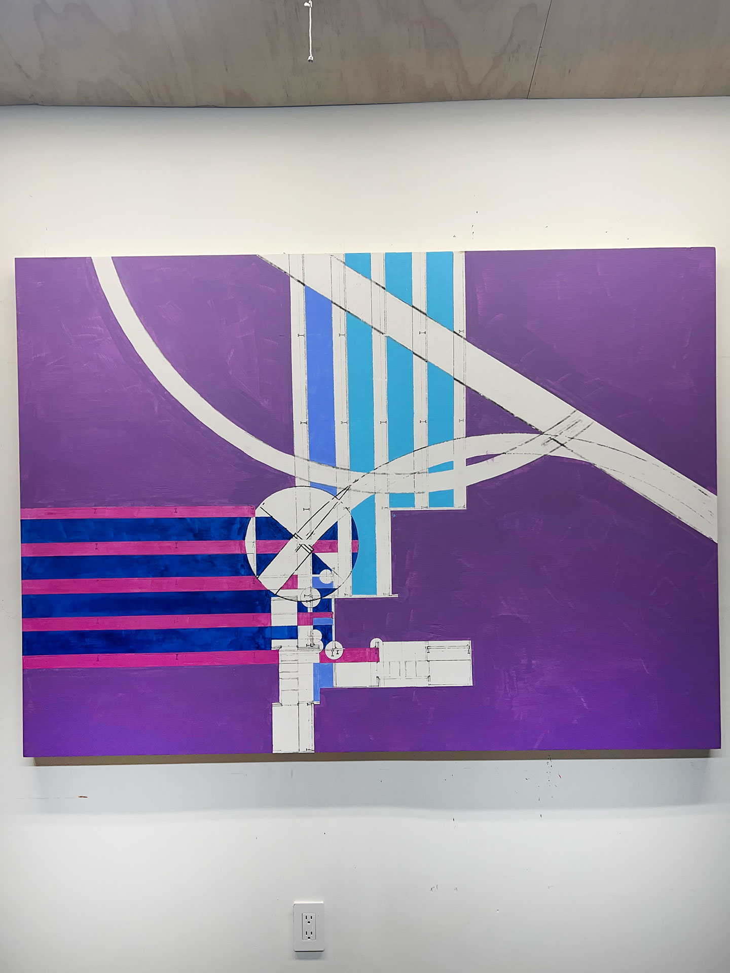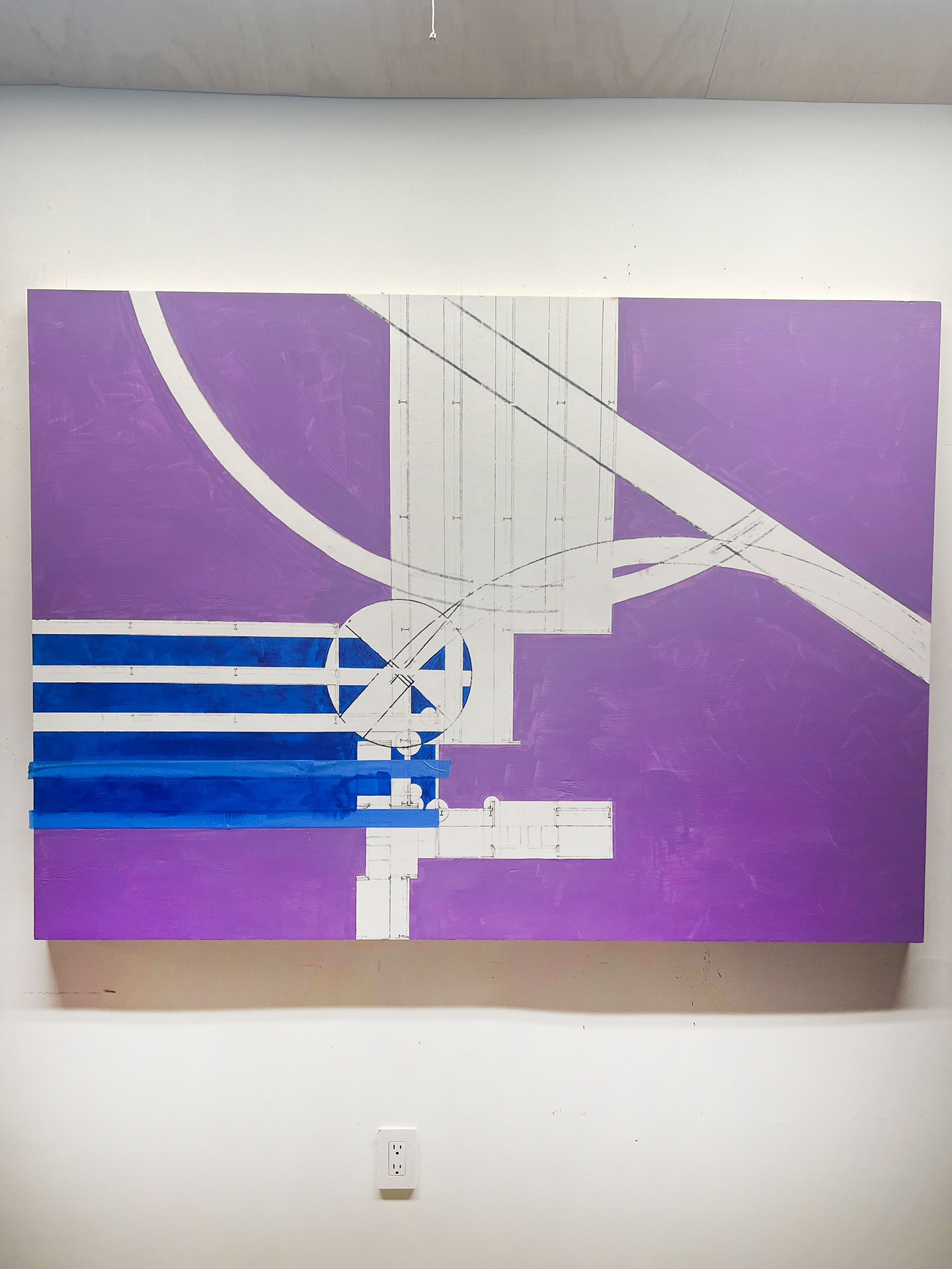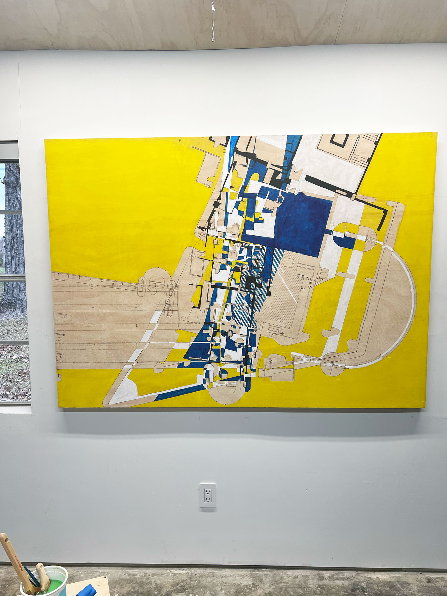 A series of commissioned paintings for 1500 Tower Place, a multi-story office building. They are derived from the building's floor plans. I photographed the floor plans, created a composition digitally by layering them on top of each other, then transferred the line work onto a wood panel, then painted in the shapes the overlapping plans created. Acrylic on wood panel – 4'x5'– March 2024.
