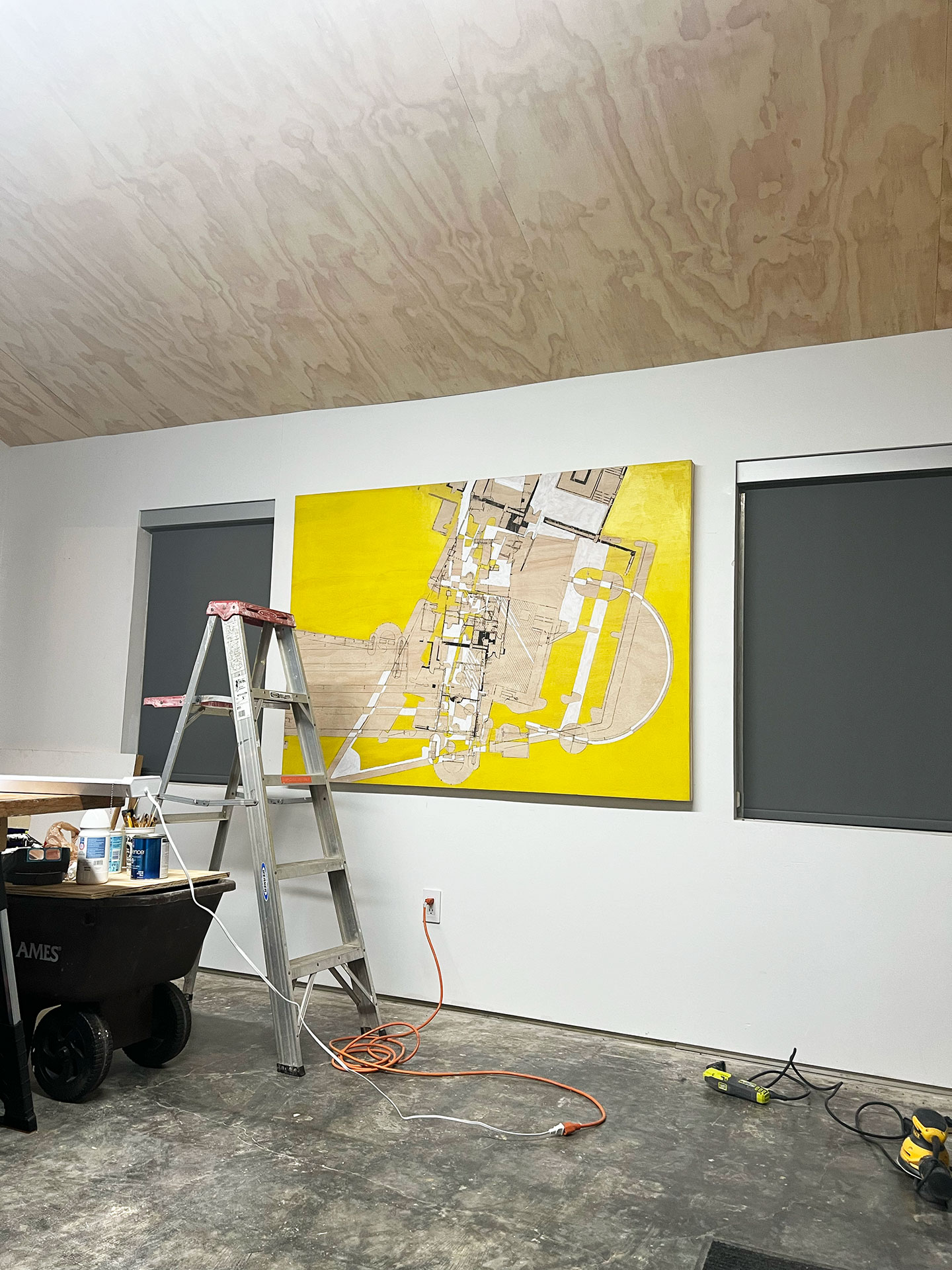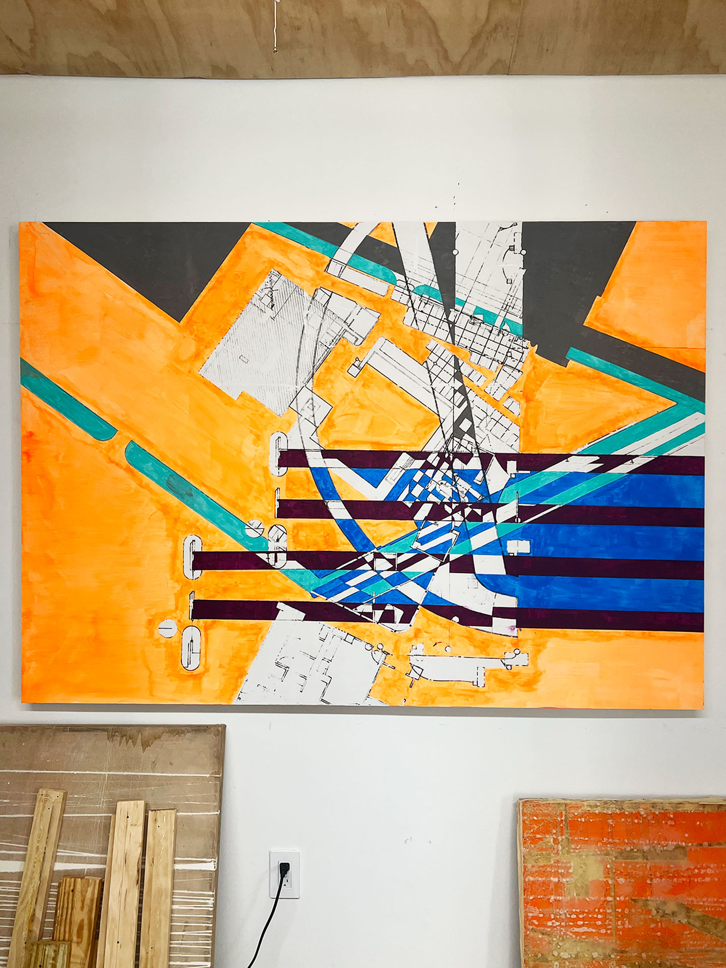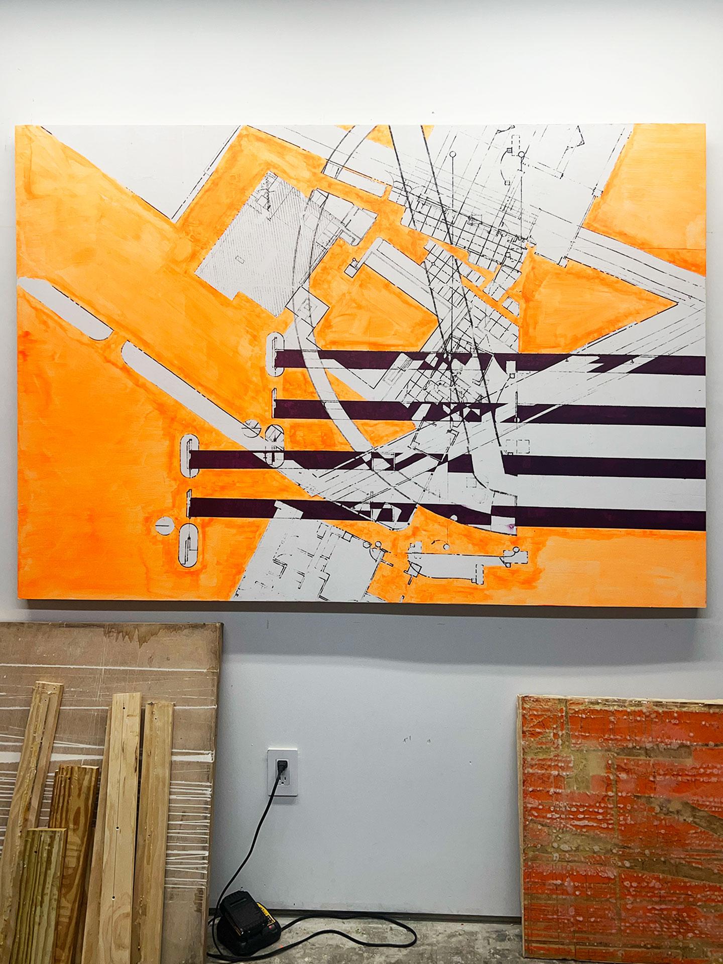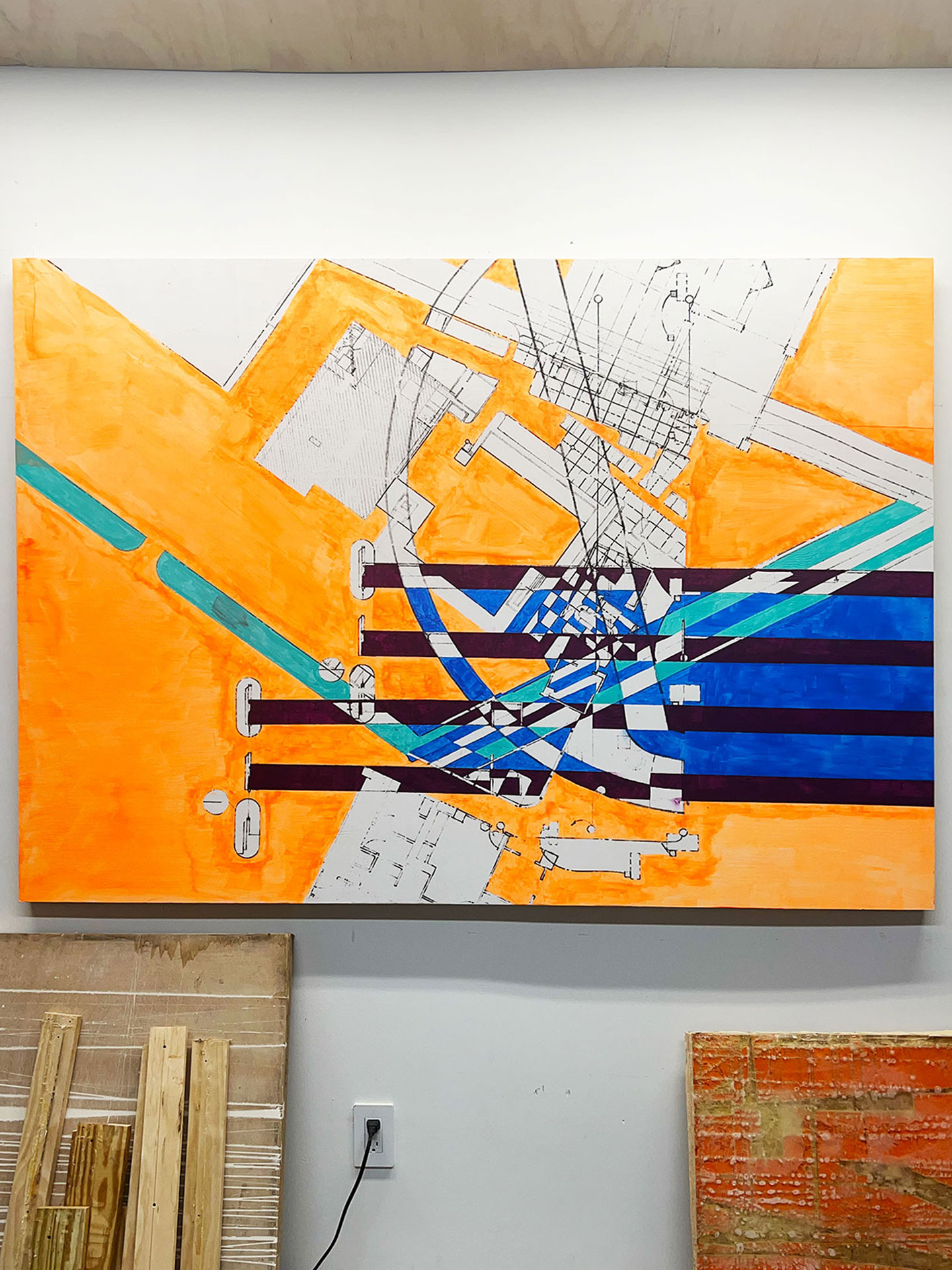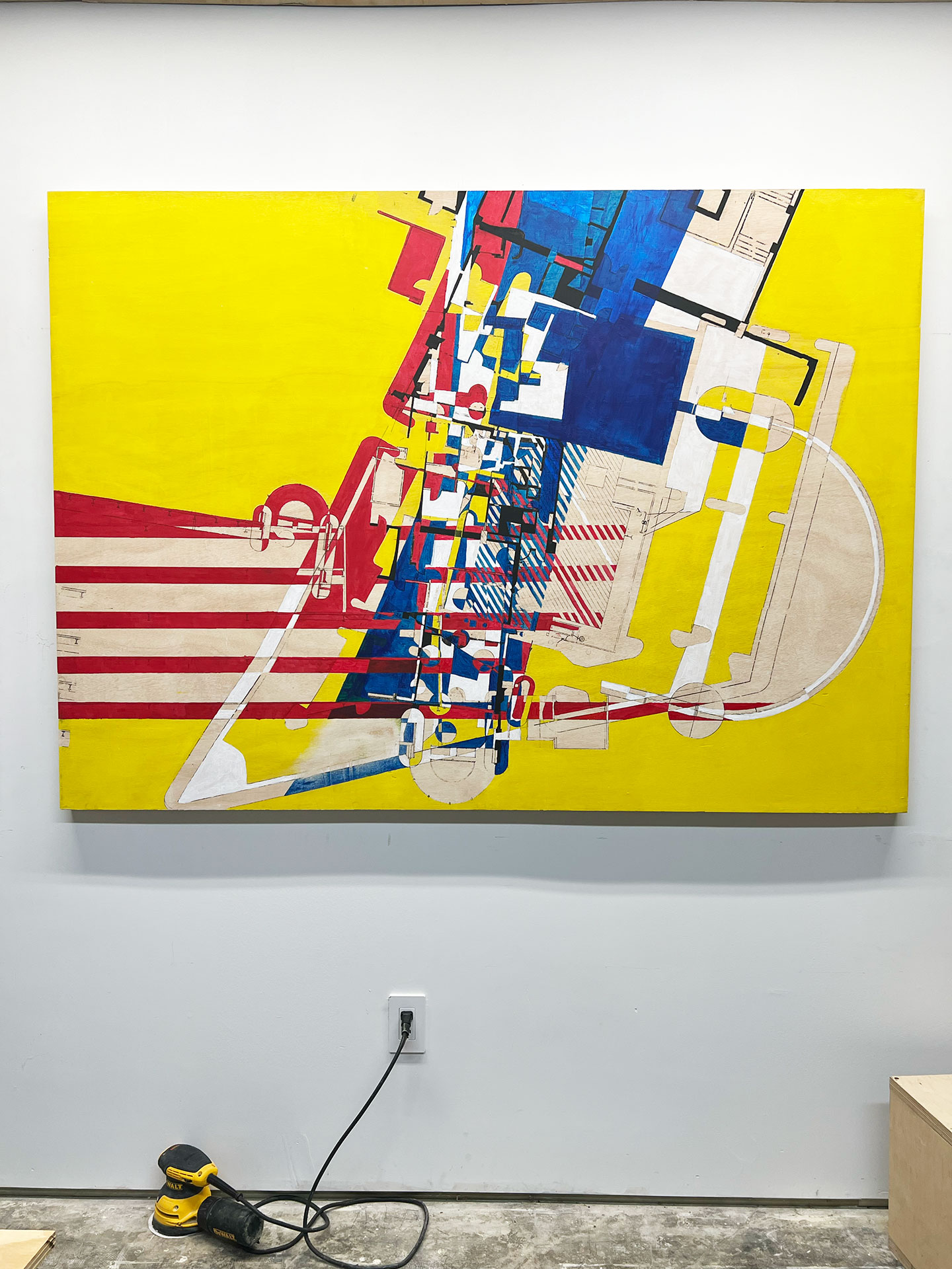 A series of commissioned paintings for 1500 Tower Place, a multi-story office building. They are derived from the building's floor plans. I photographed the floor plans, created a composition digitally by layering them on top of each other, then transferred the line work onto a wood panel, then painted in the shapes the overlapping plans created. Acrylic on wood panel – 4'x5'– March 2024.