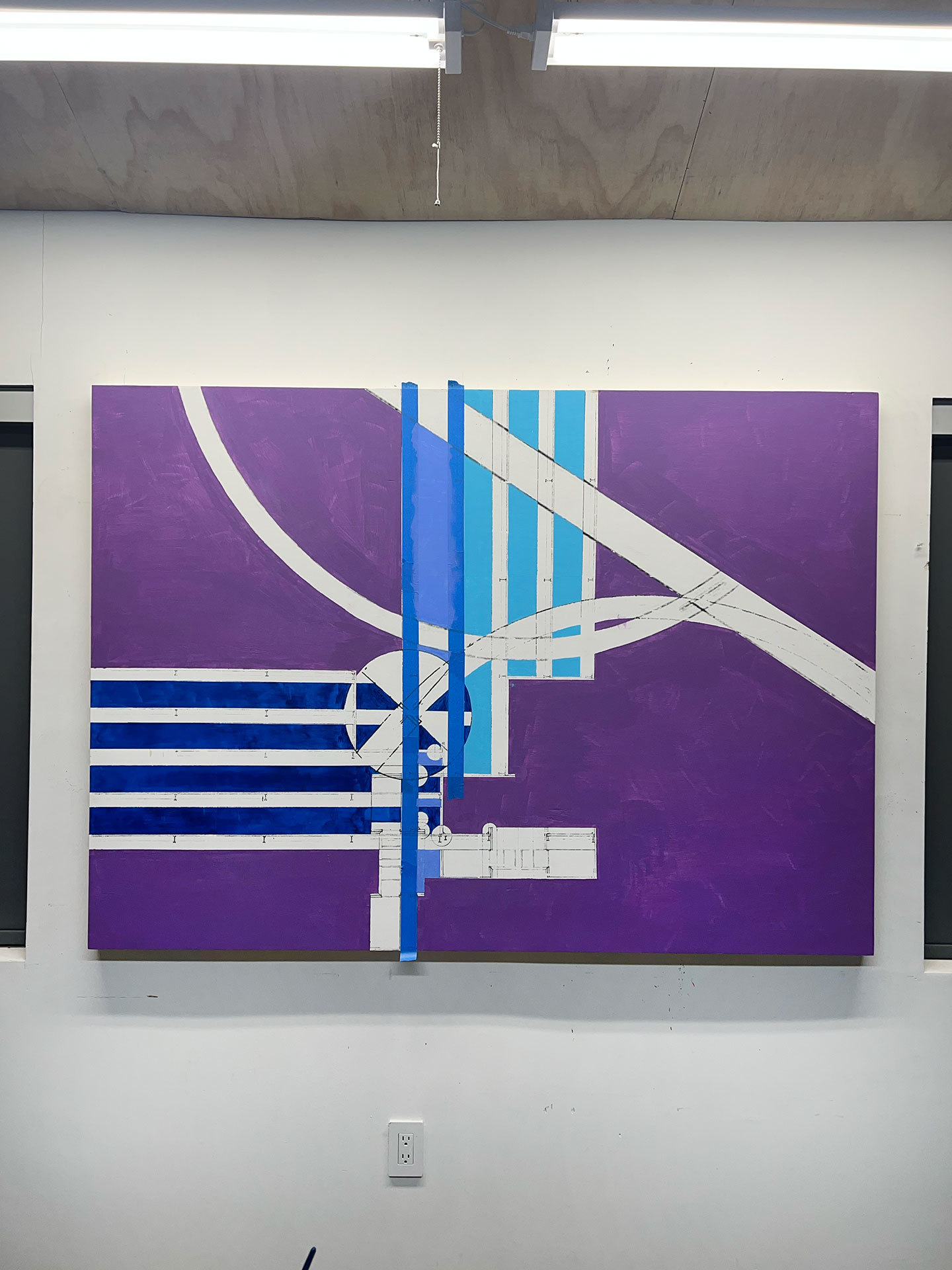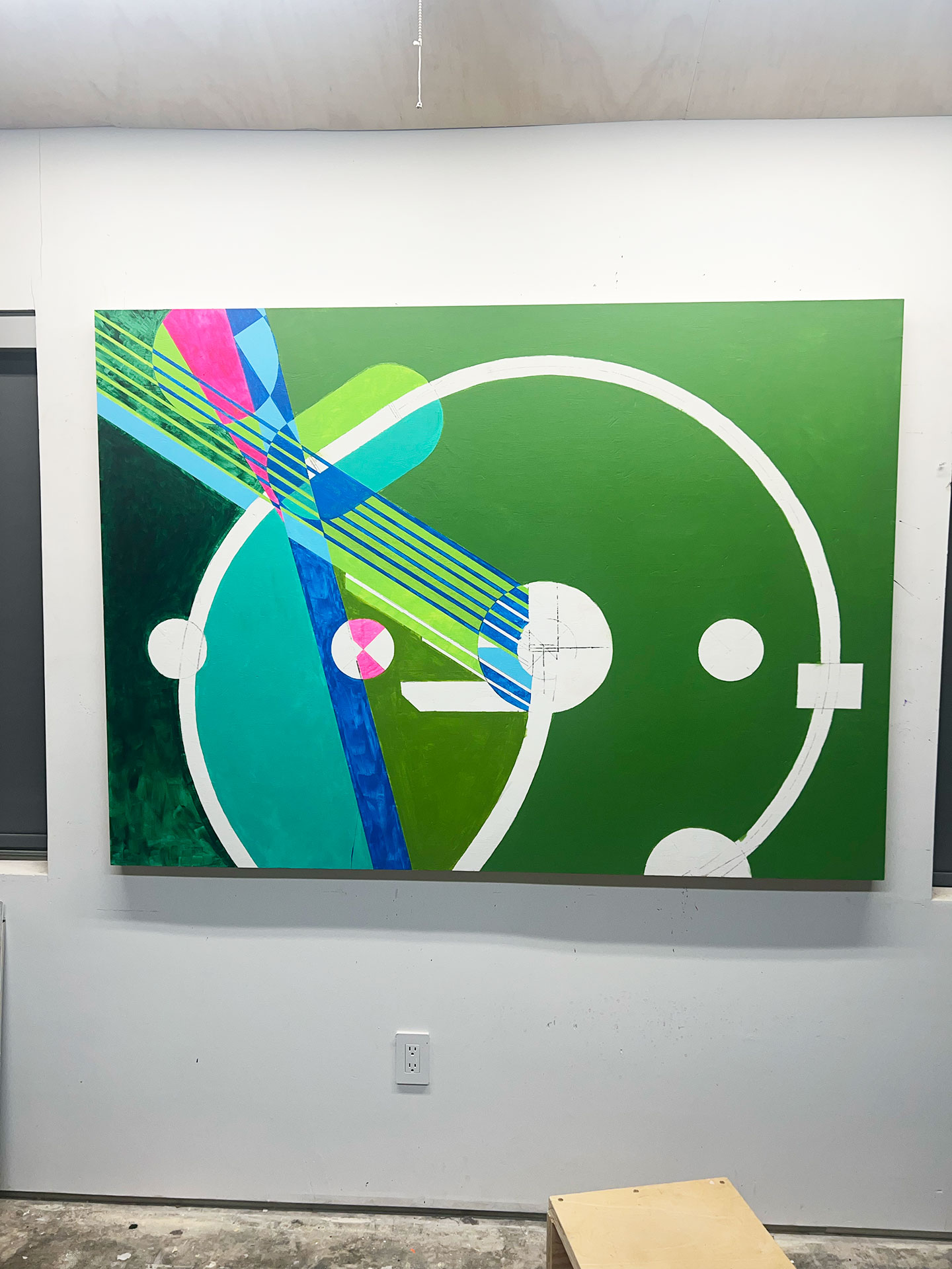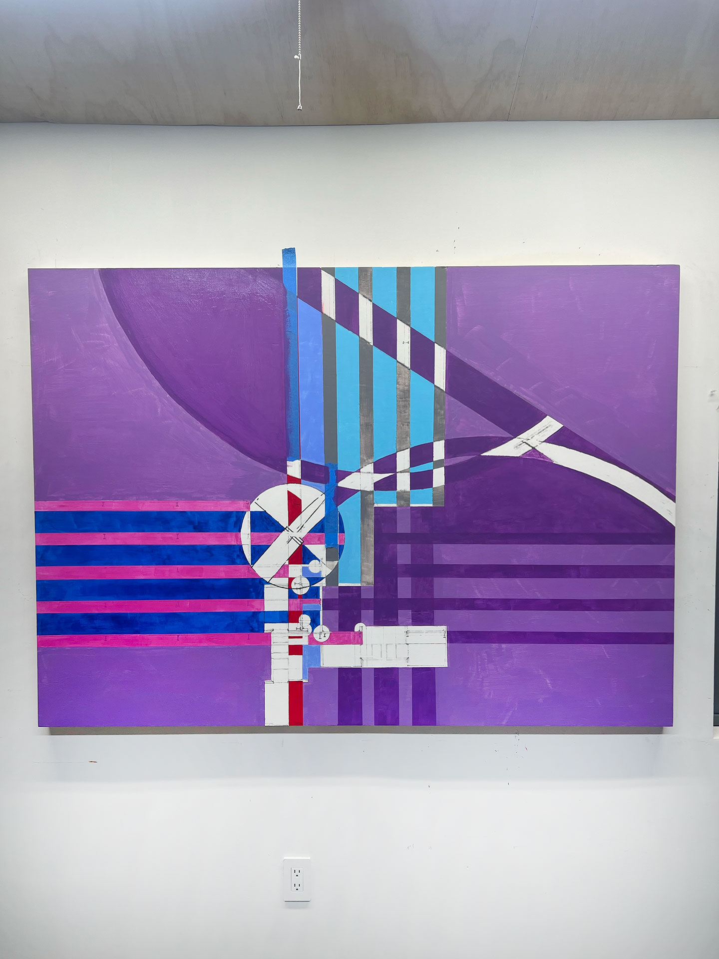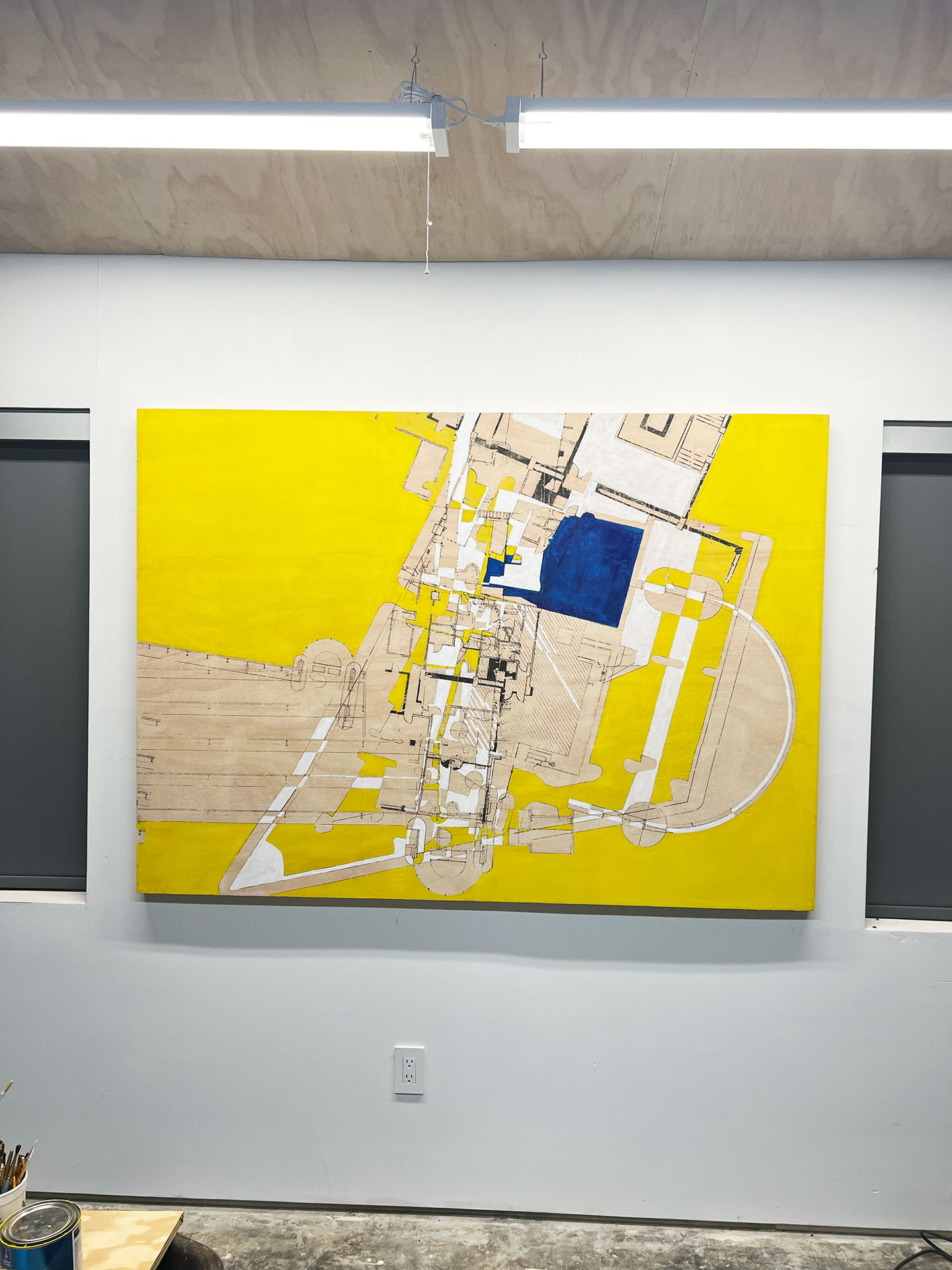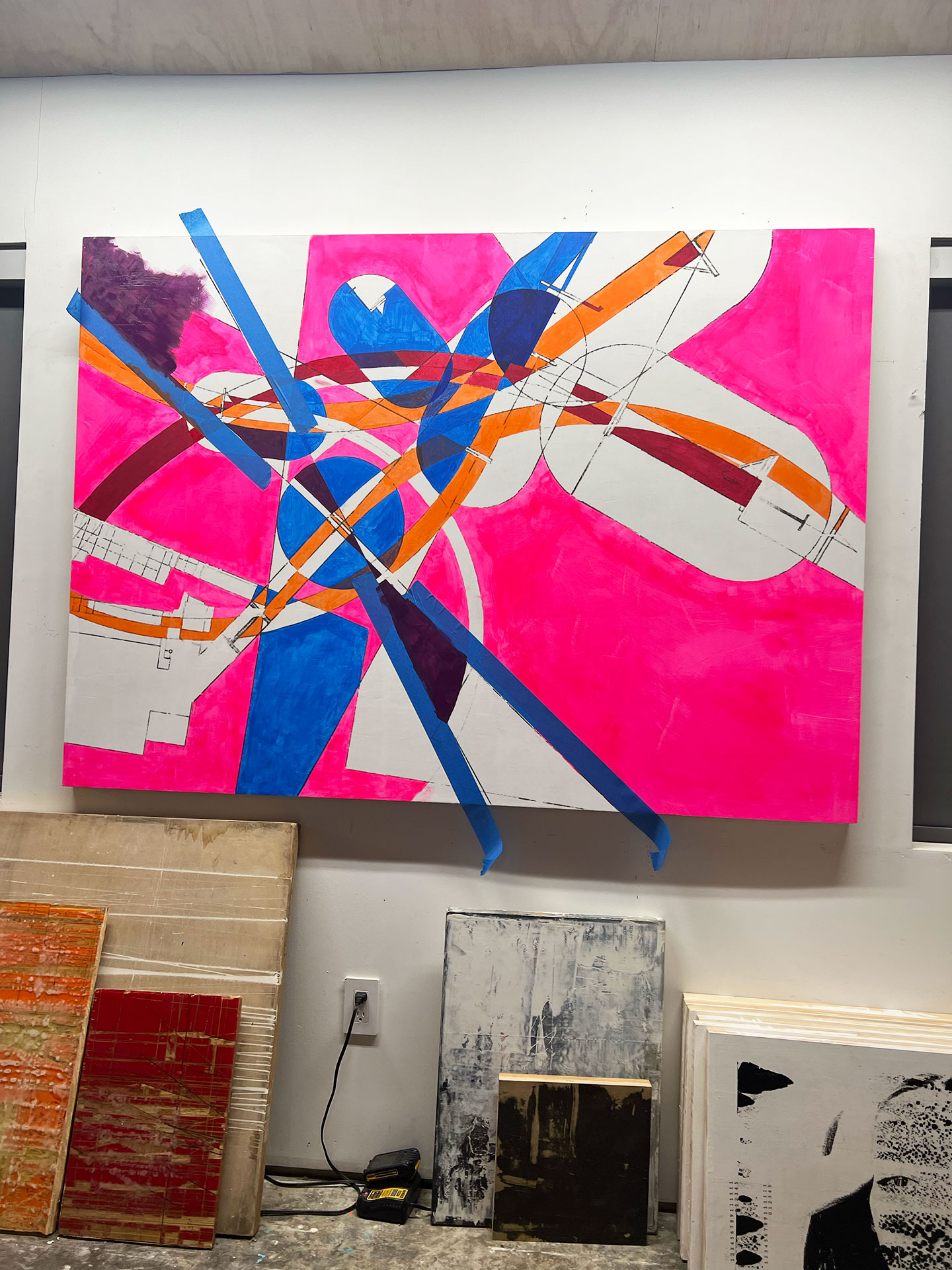 A series of commissioned paintings for 1500 Tower Place, a multi-story office building. They are derived from the building's floor plans. I photographed the floor plans, created a composition digitally by layering them on top of each other, then transferred the line work onto a wood panel, then painted in the shapes the overlapping plans created. Acrylic on wood panel – 4'x5'– March 2024.