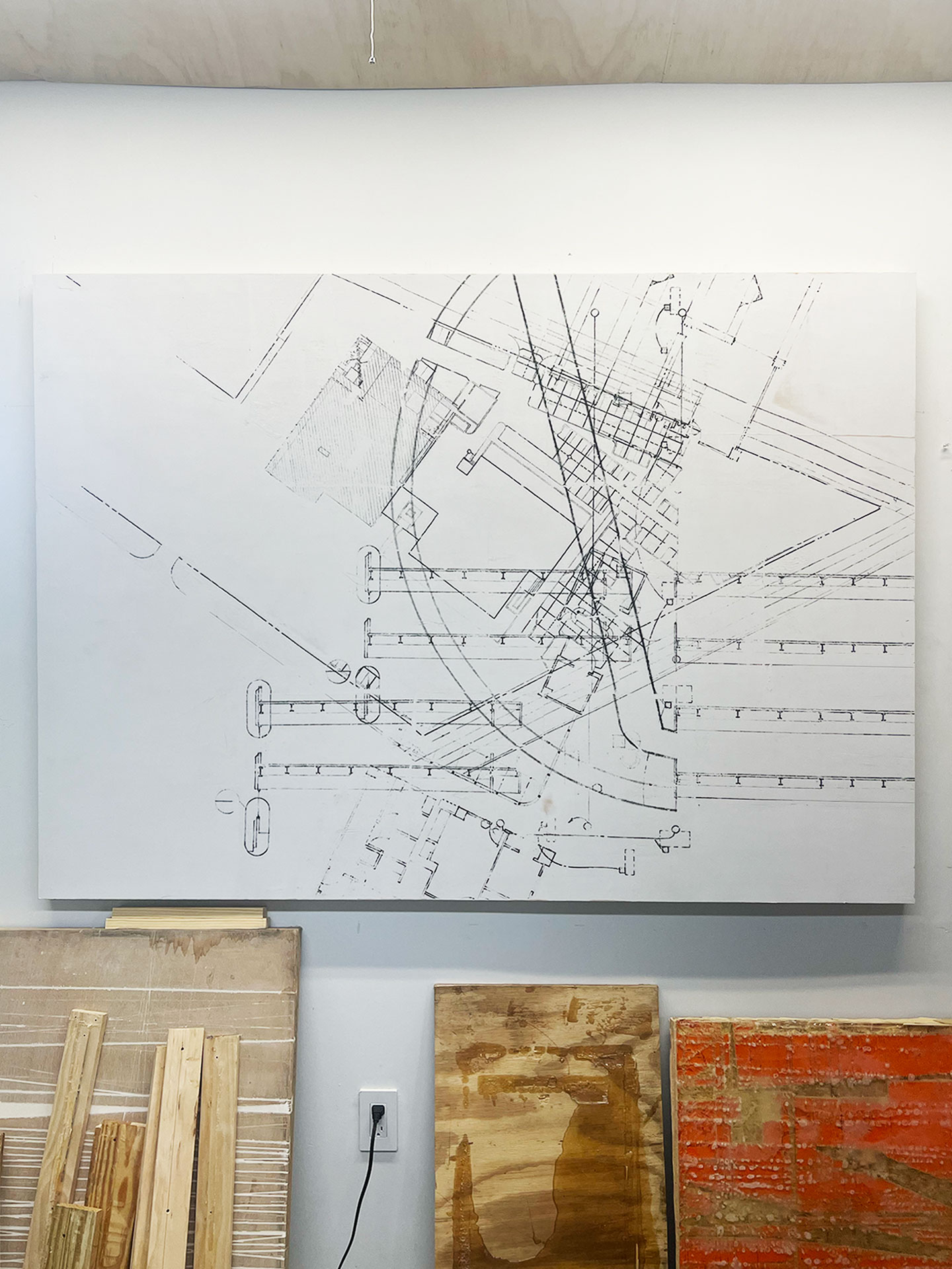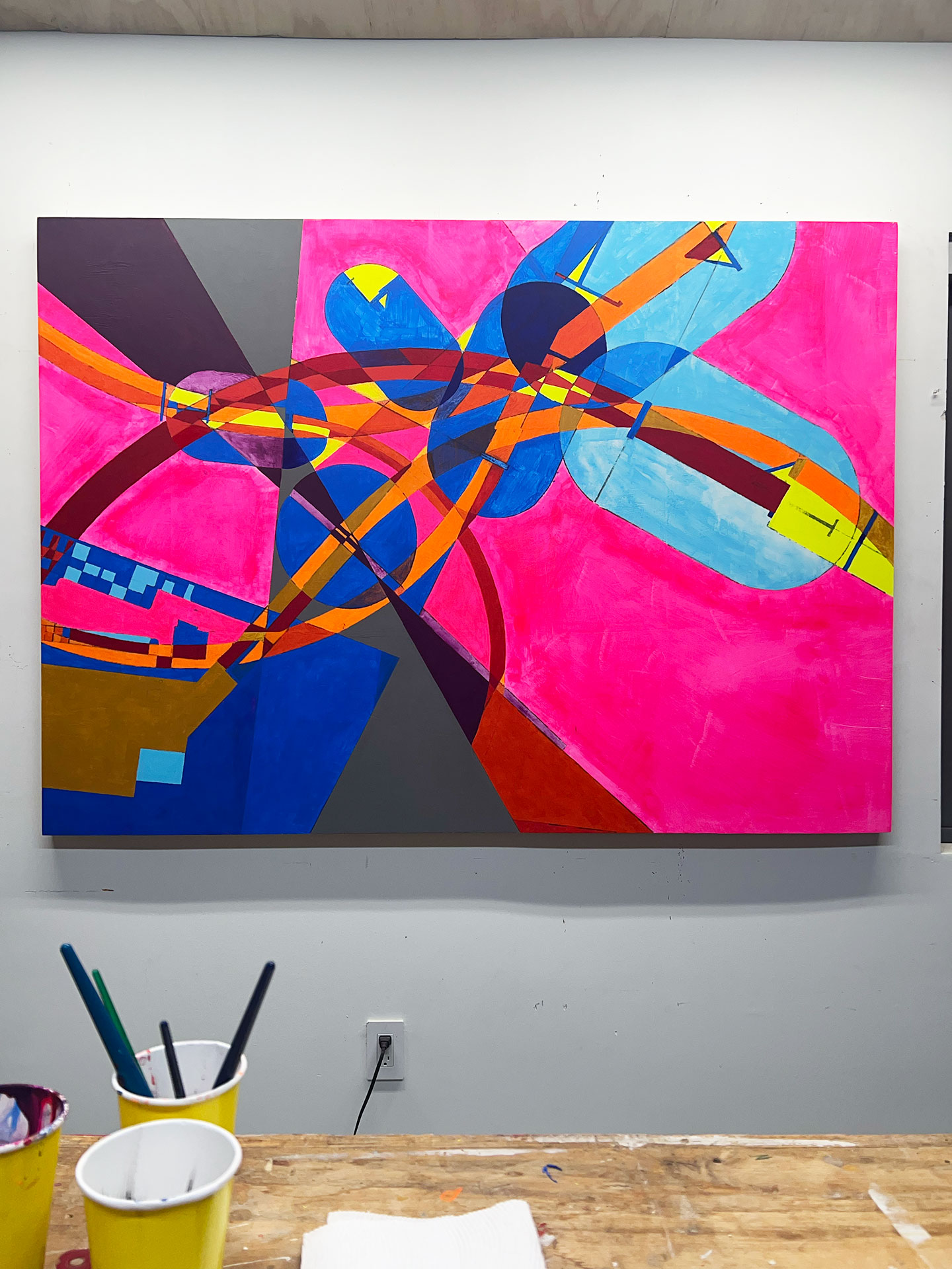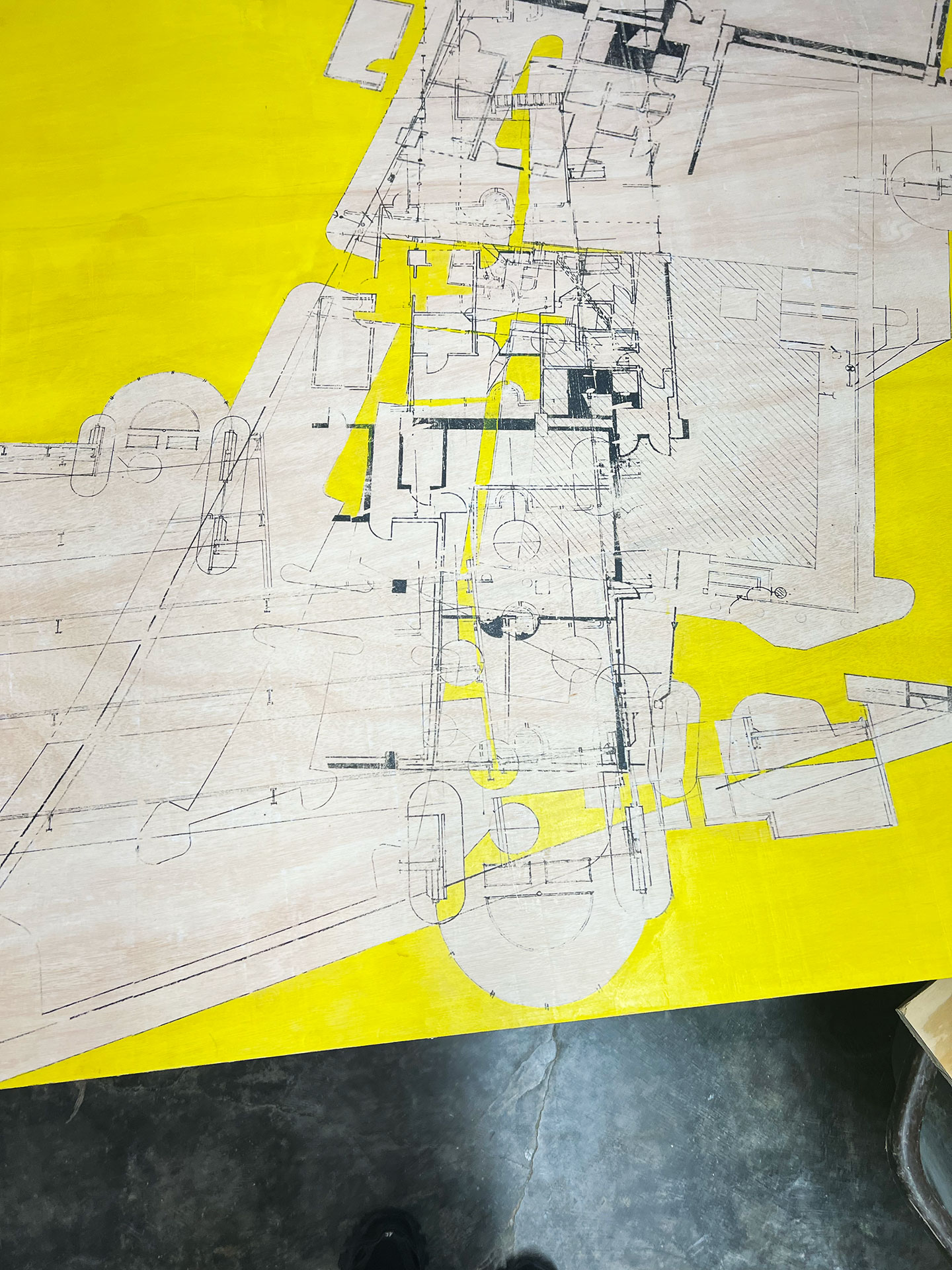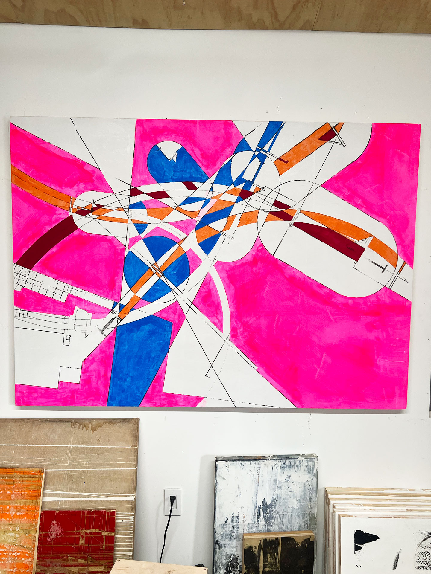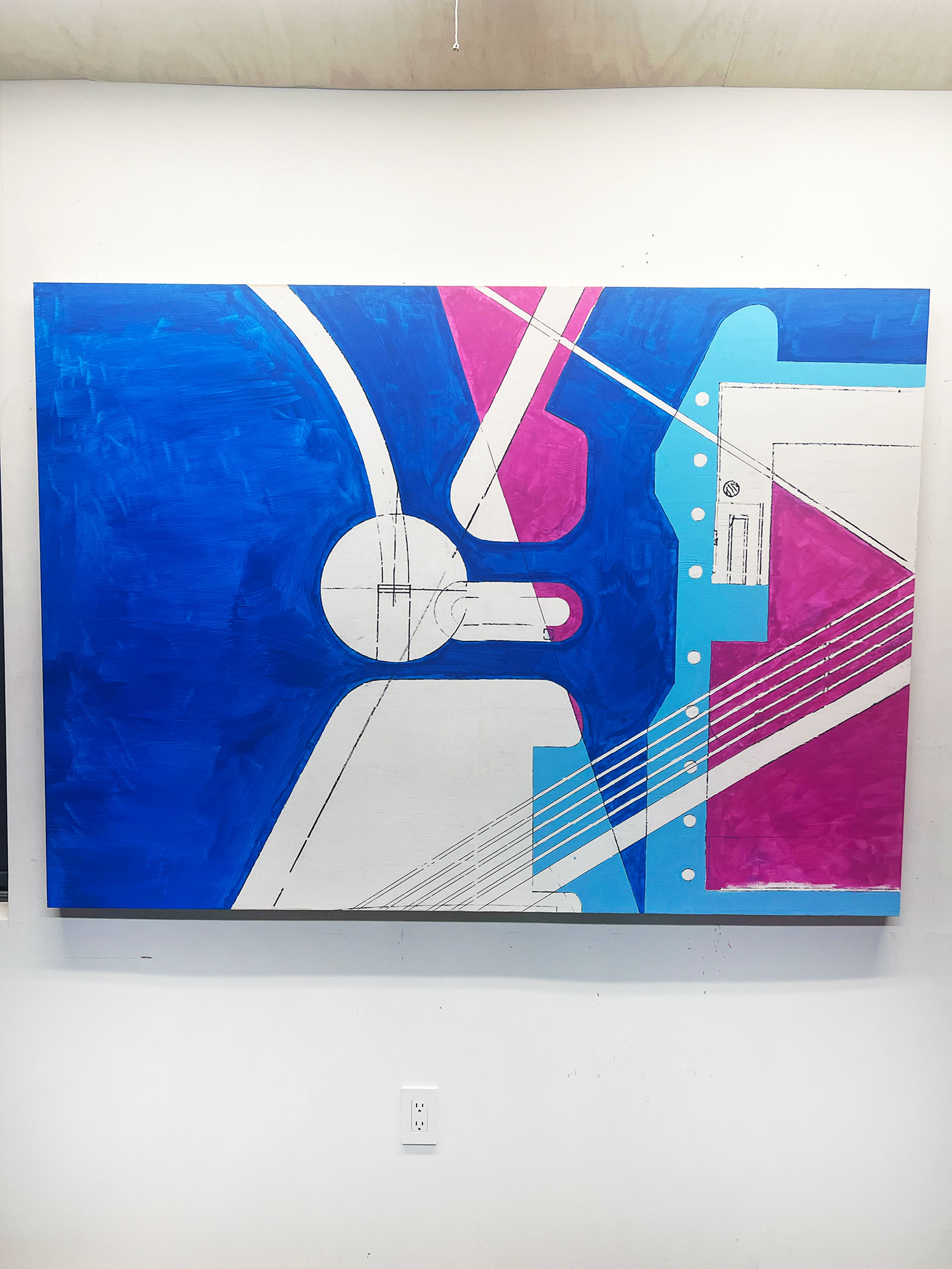 A series of commissioned paintings for 1500 Tower Place, a multi-story office building. They are derived from the building's floor plans. I photographed the floor plans, created a composition digitally by layering them on top of each other, then transferred the line work onto a wood panel, then painted in the shapes the overlapping plans created. Acrylic on wood panel – 4'x5'– March 2024.