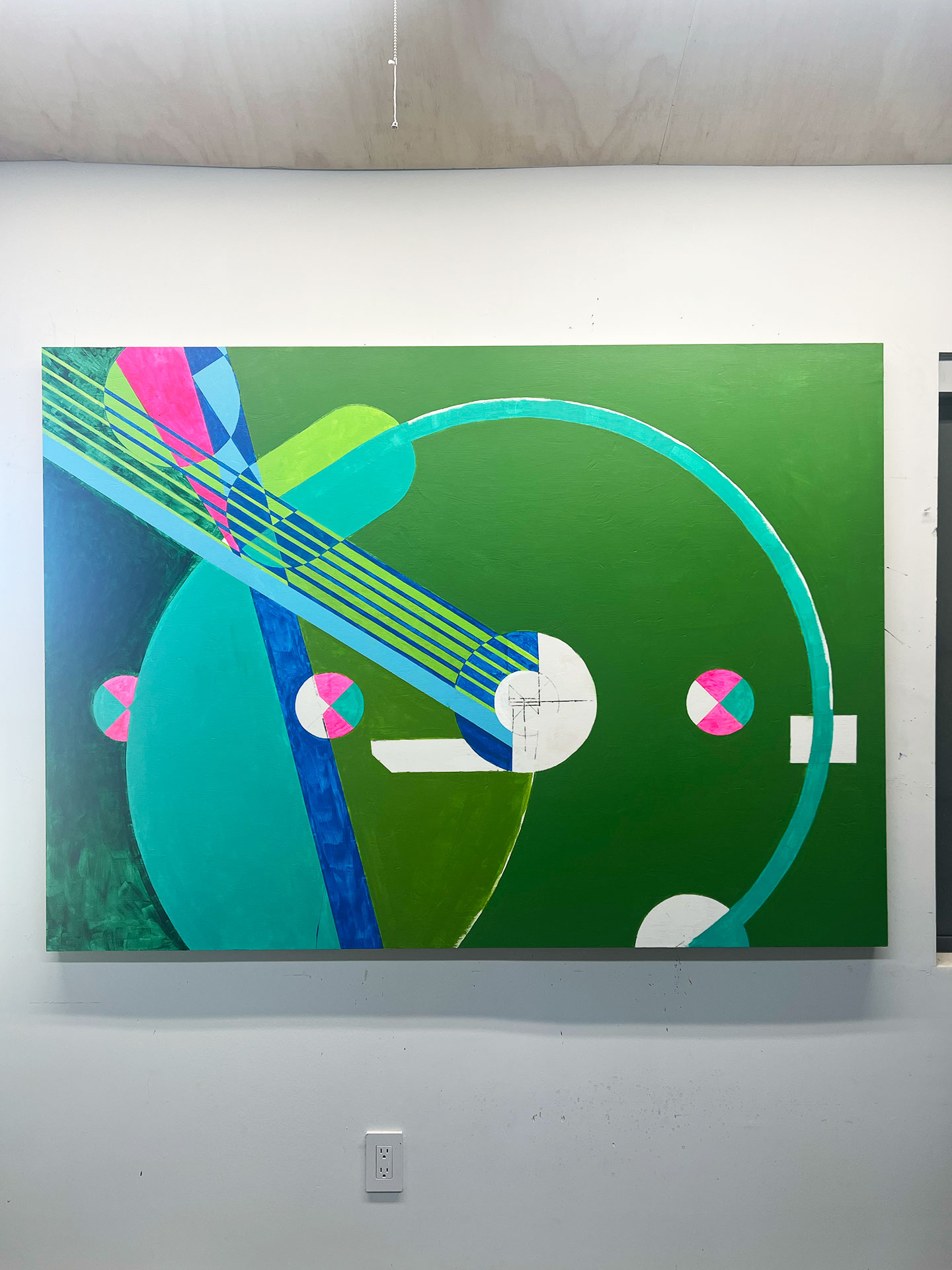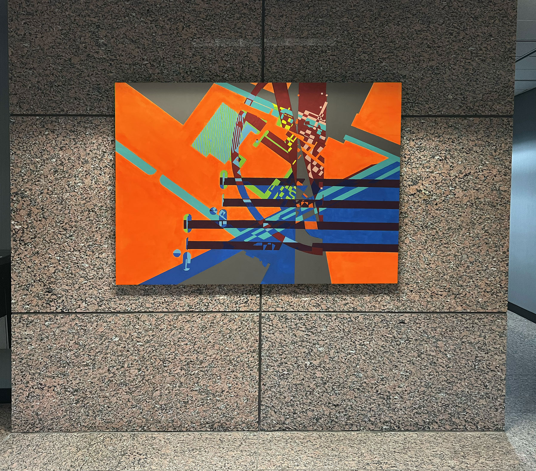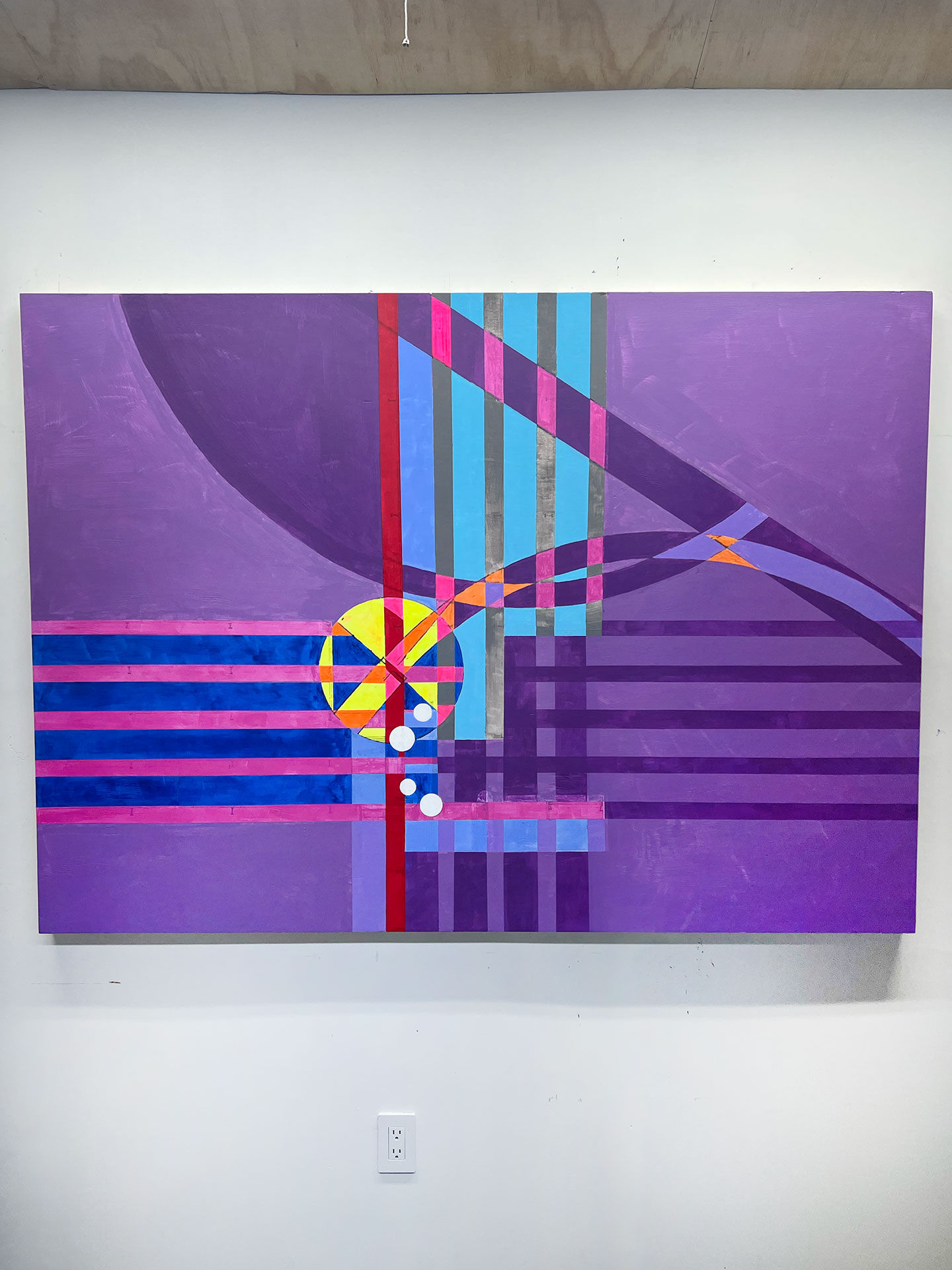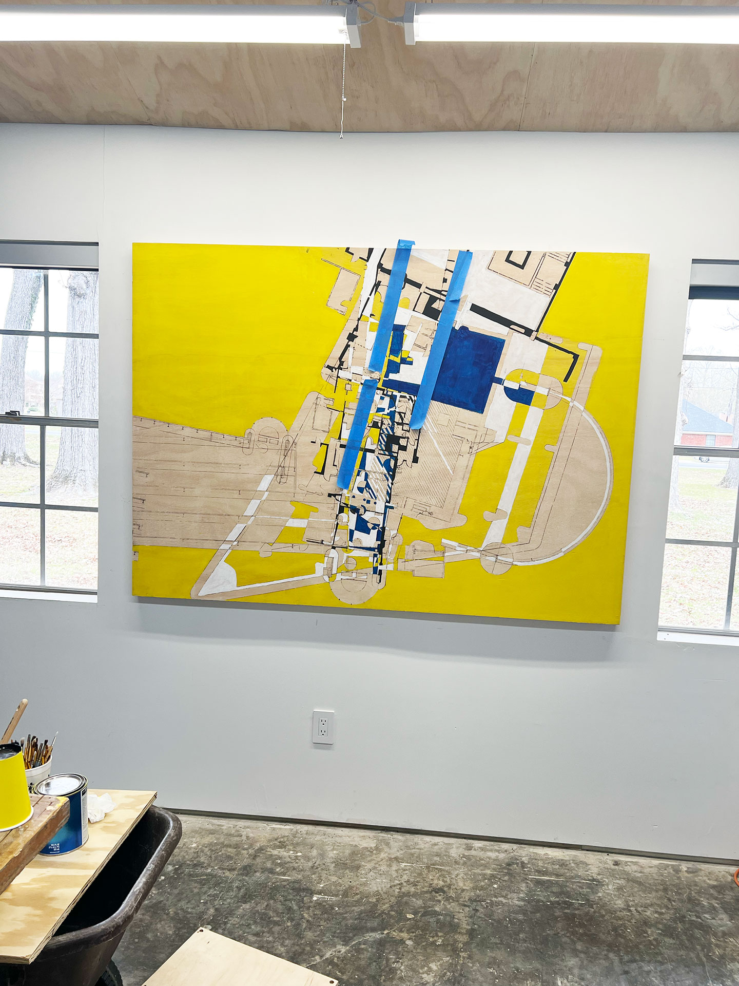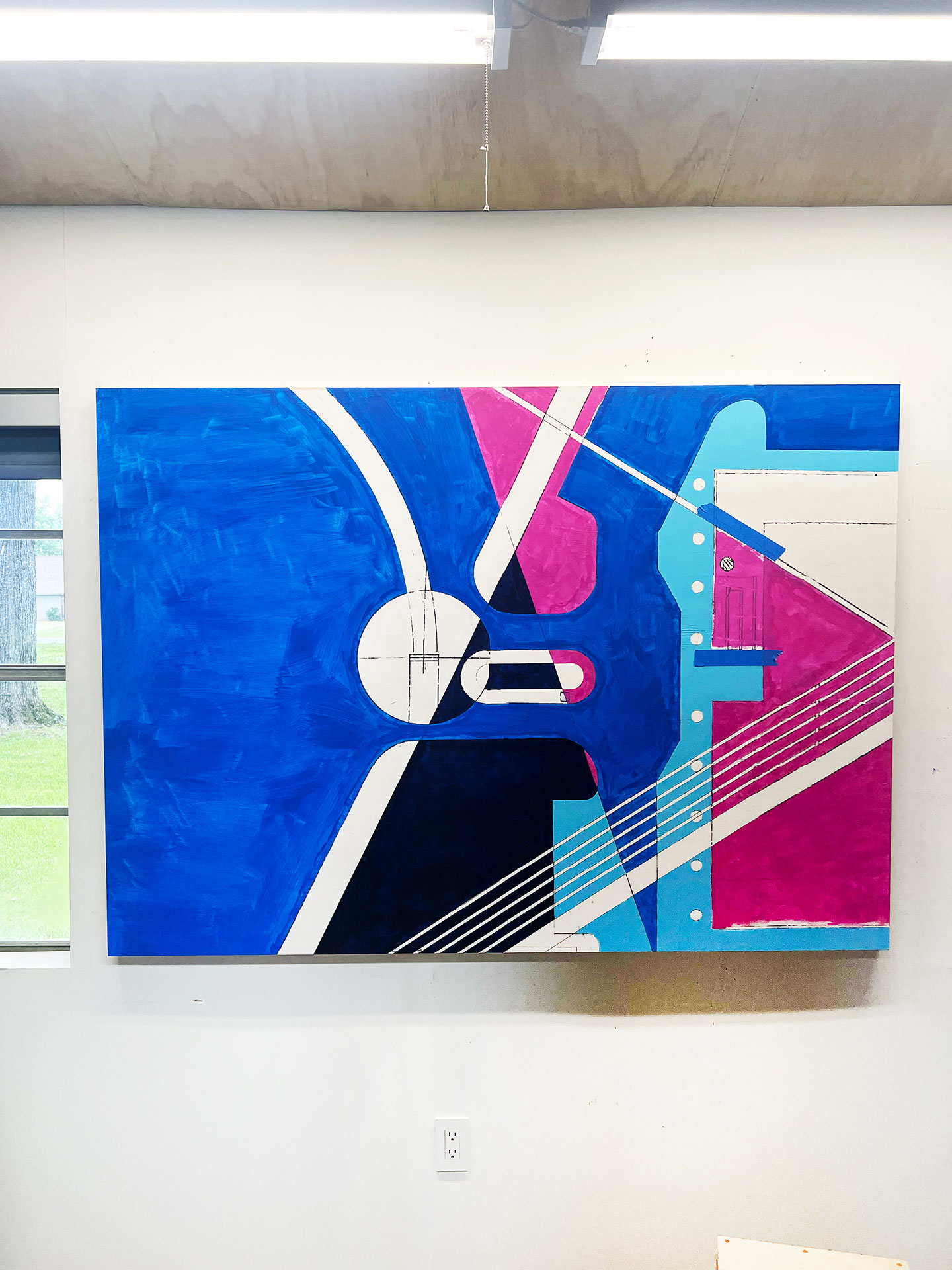 A series of commissioned paintings for 1500 Tower Place, a multi-story office building. They are derived from the building's floor plans. I photographed the floor plans, created a composition digitally by layering them on top of each other, then transferred the line work onto a wood panel, then painted in the shapes the overlapping plans created. Acrylic on wood panel – 4'x5'– March 2024.