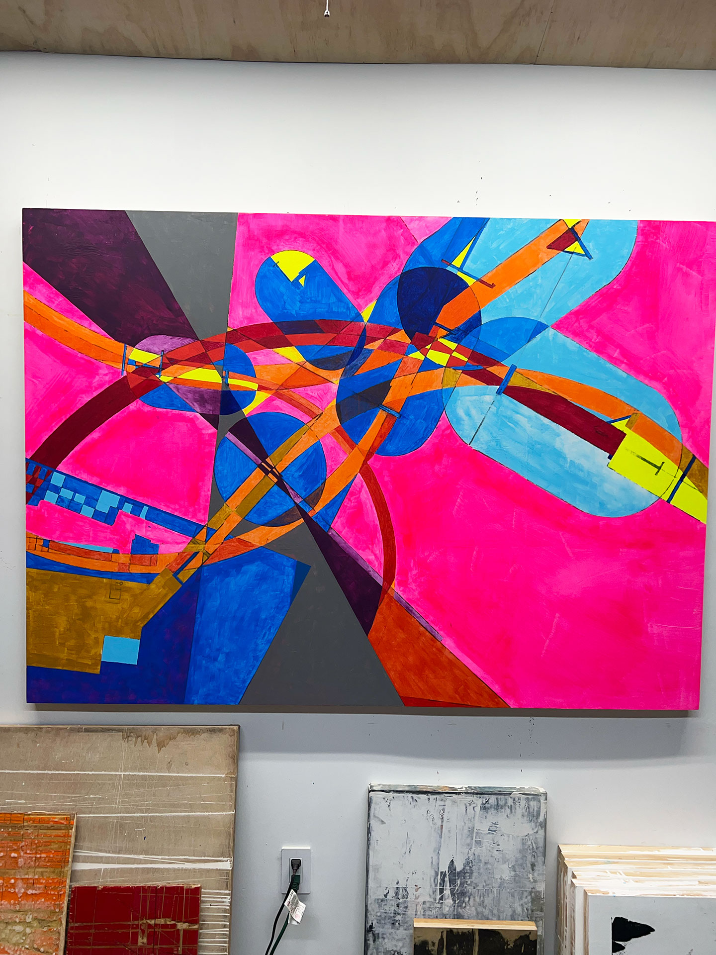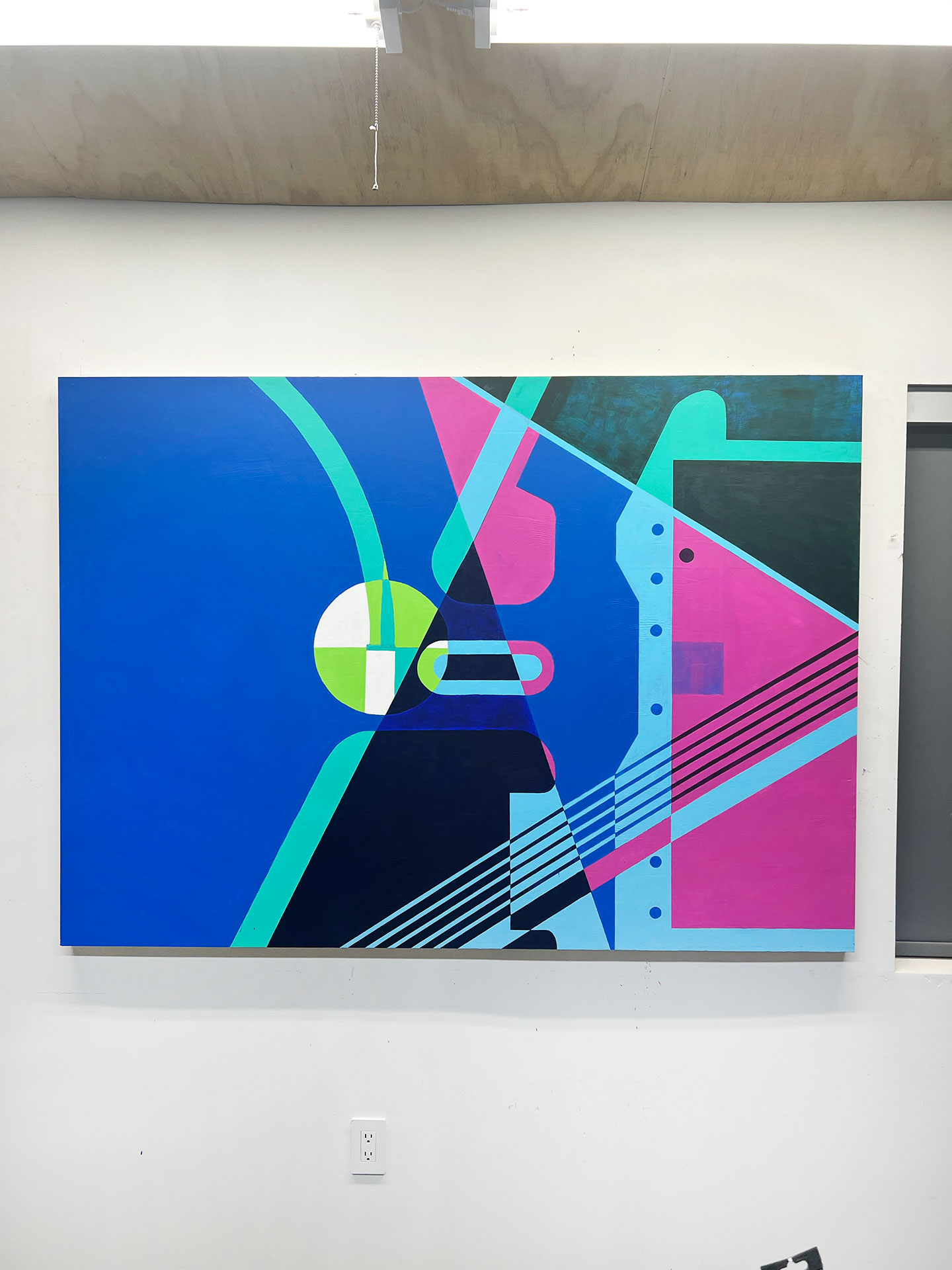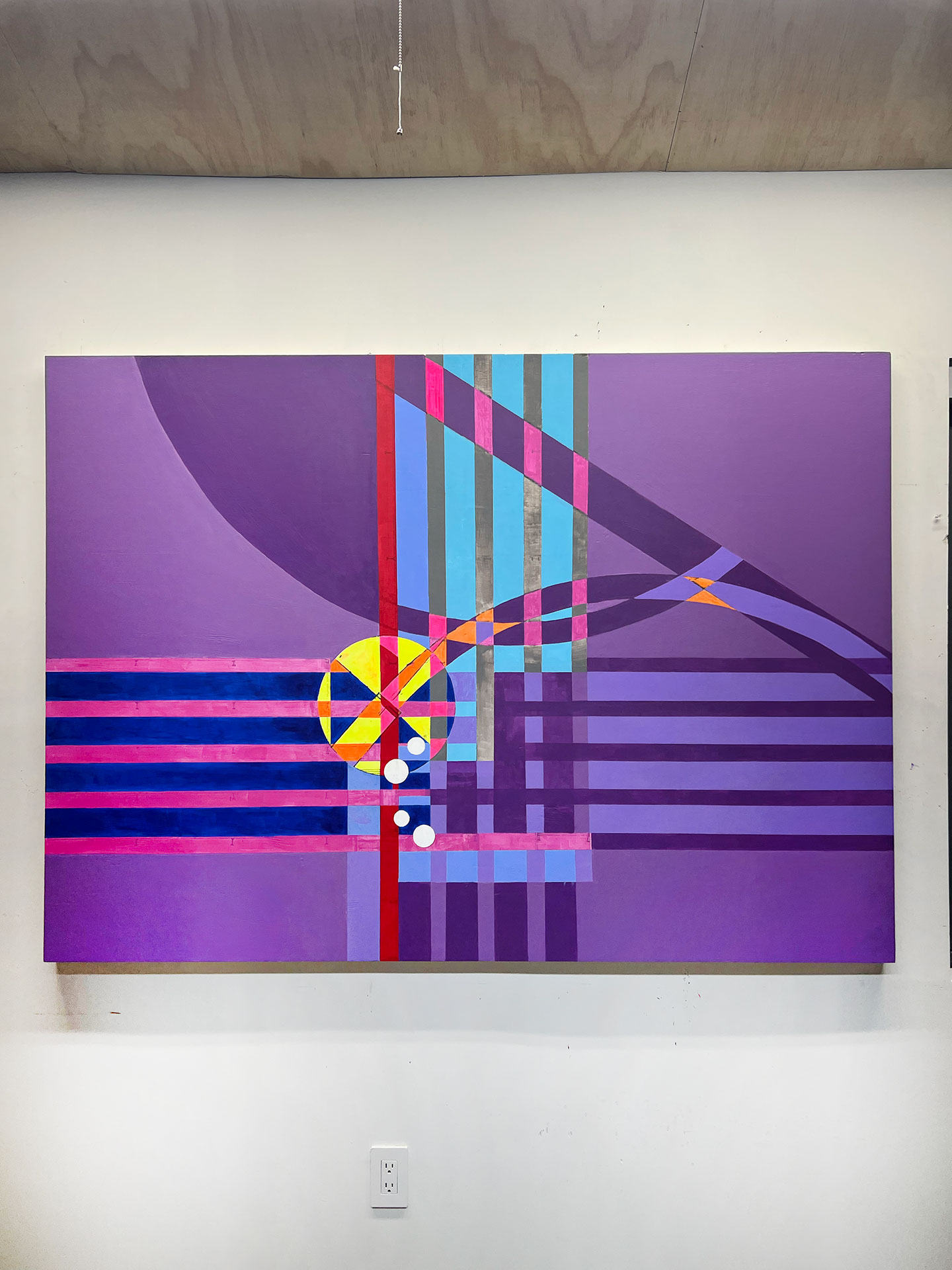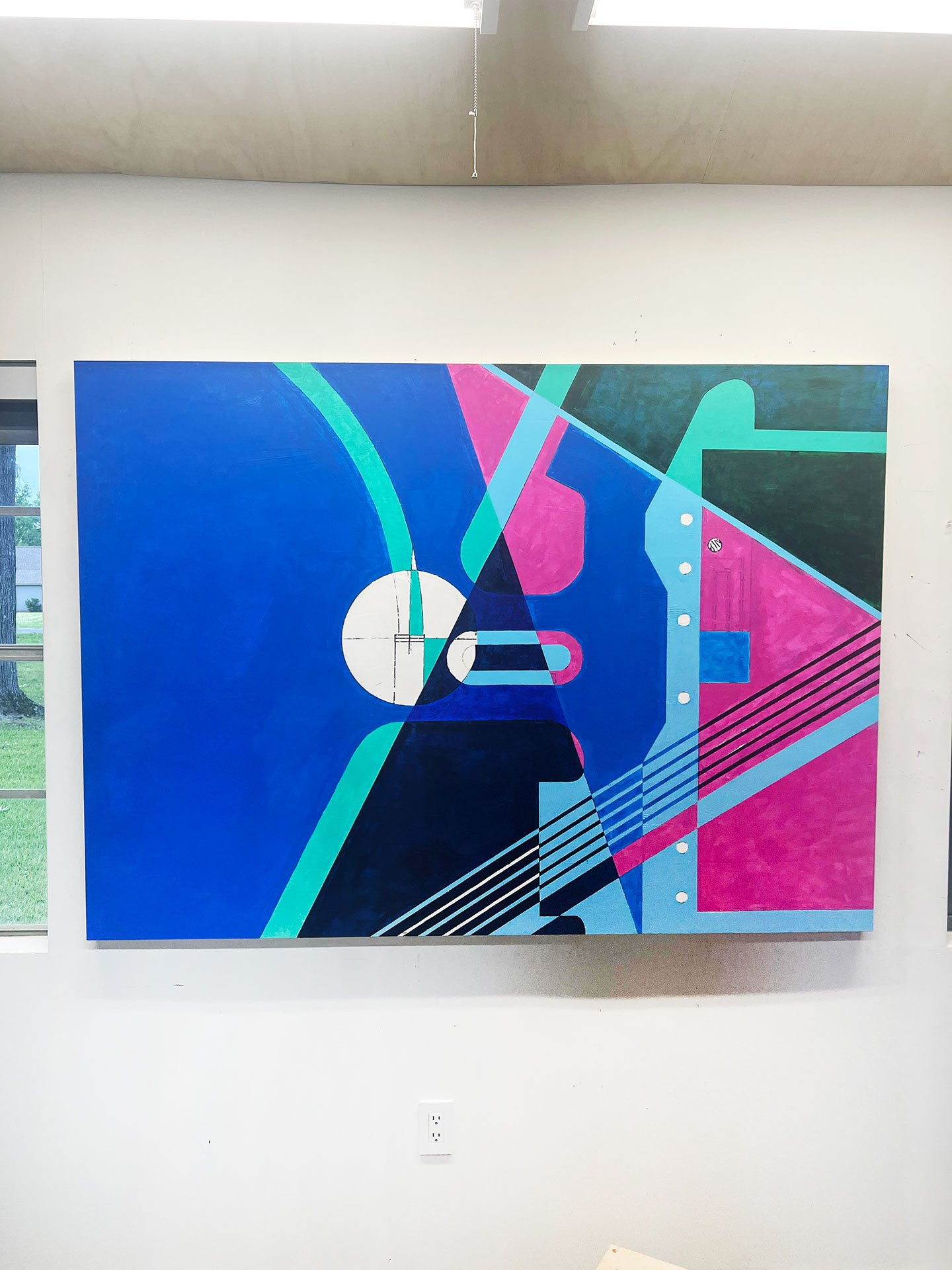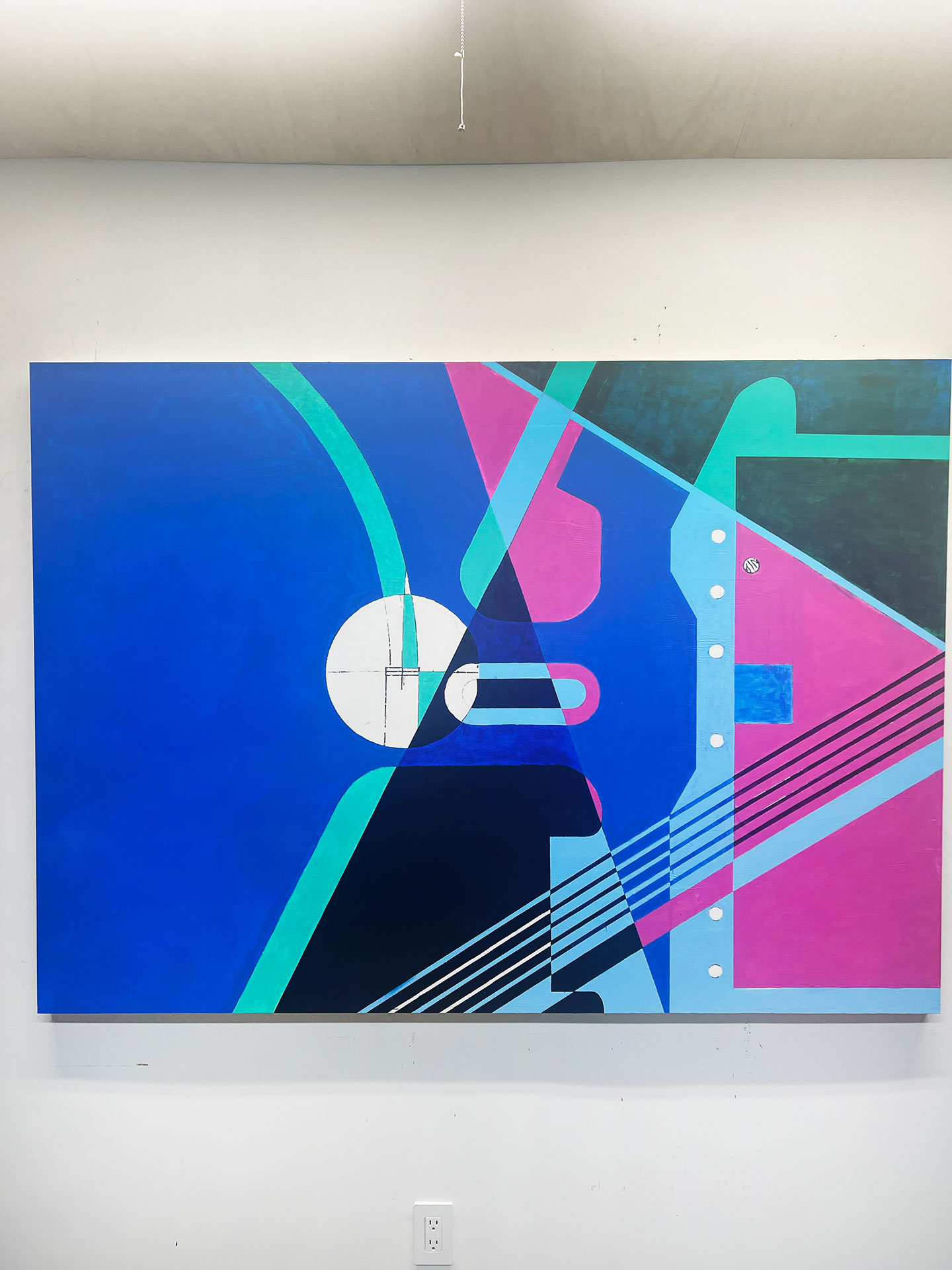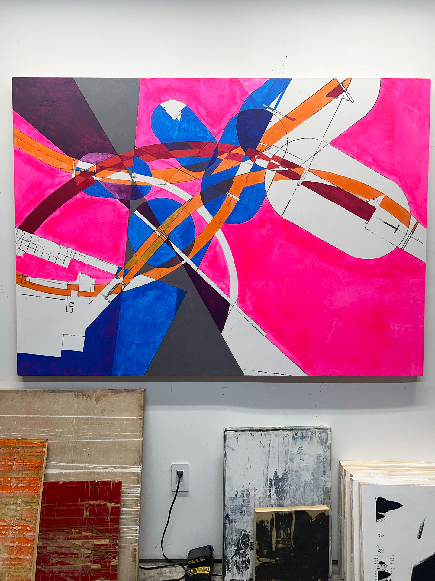 A series of commissioned paintings for 1500 Tower Place, a multi-story office building. They are derived from the building's floor plans. I photographed the floor plans, created a composition digitally by layering them on top of each other, then transferred the line work onto a wood panel, then painted in the shapes the overlapping plans created. Acrylic on wood panel – 4'x5'– March 2024.