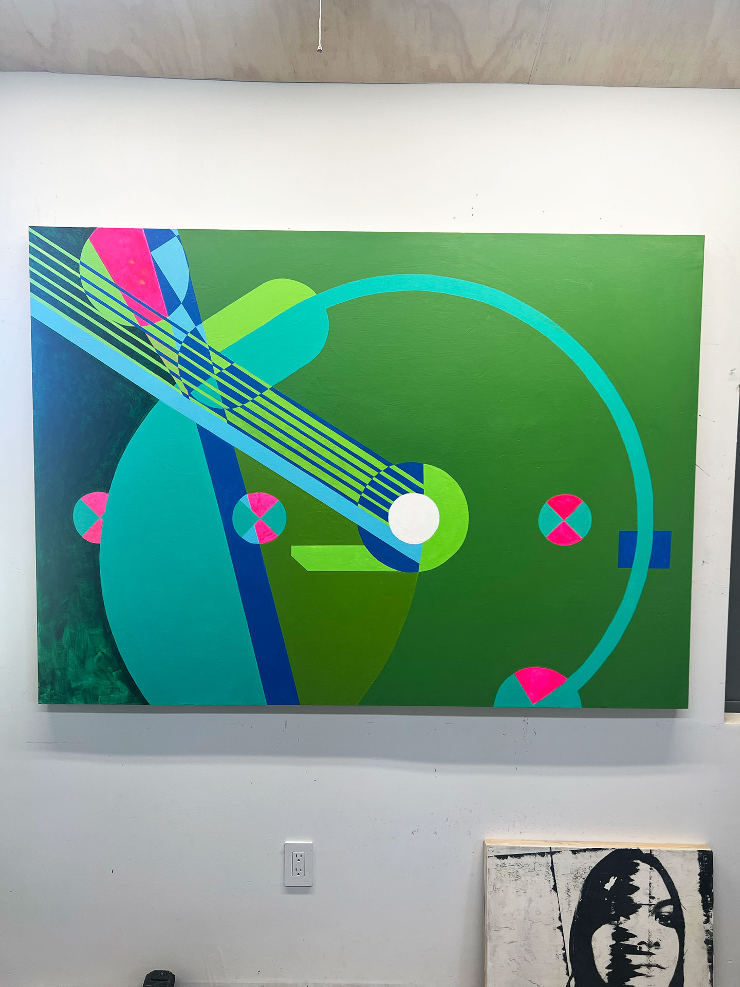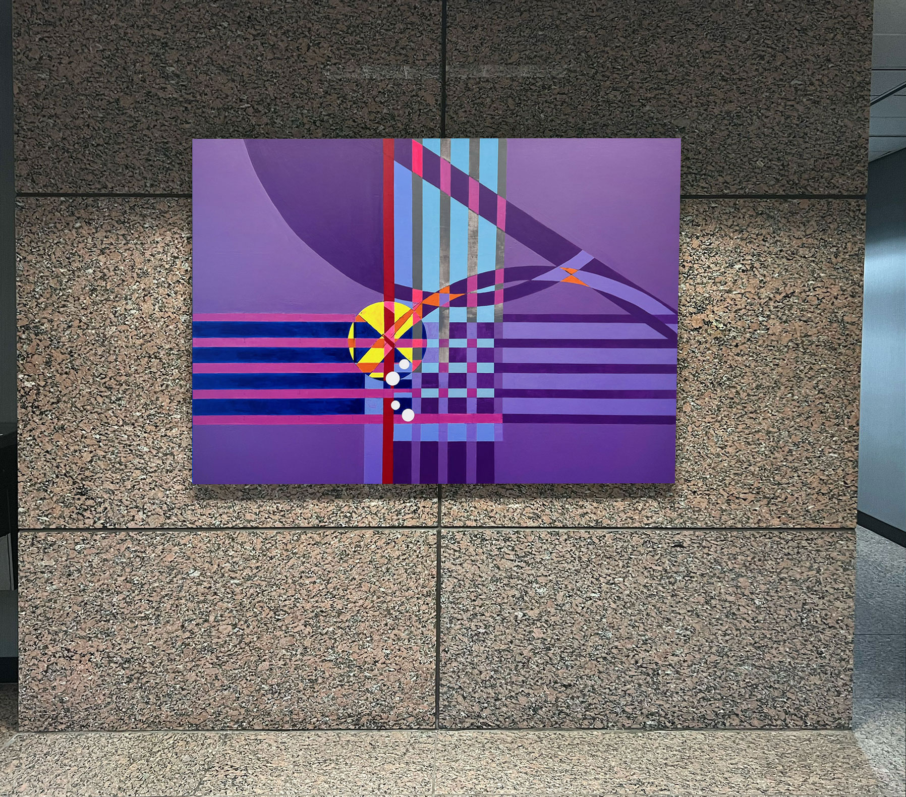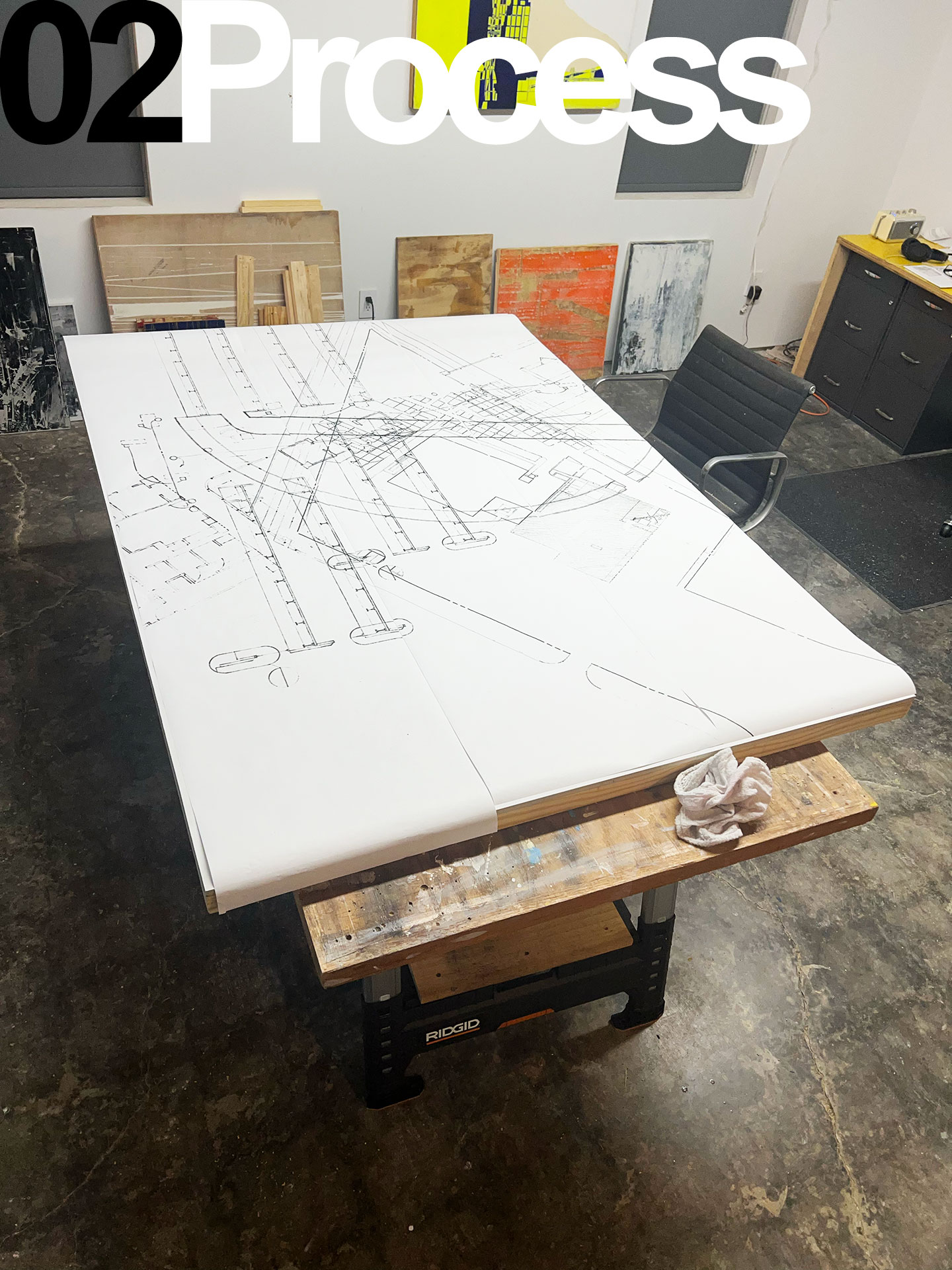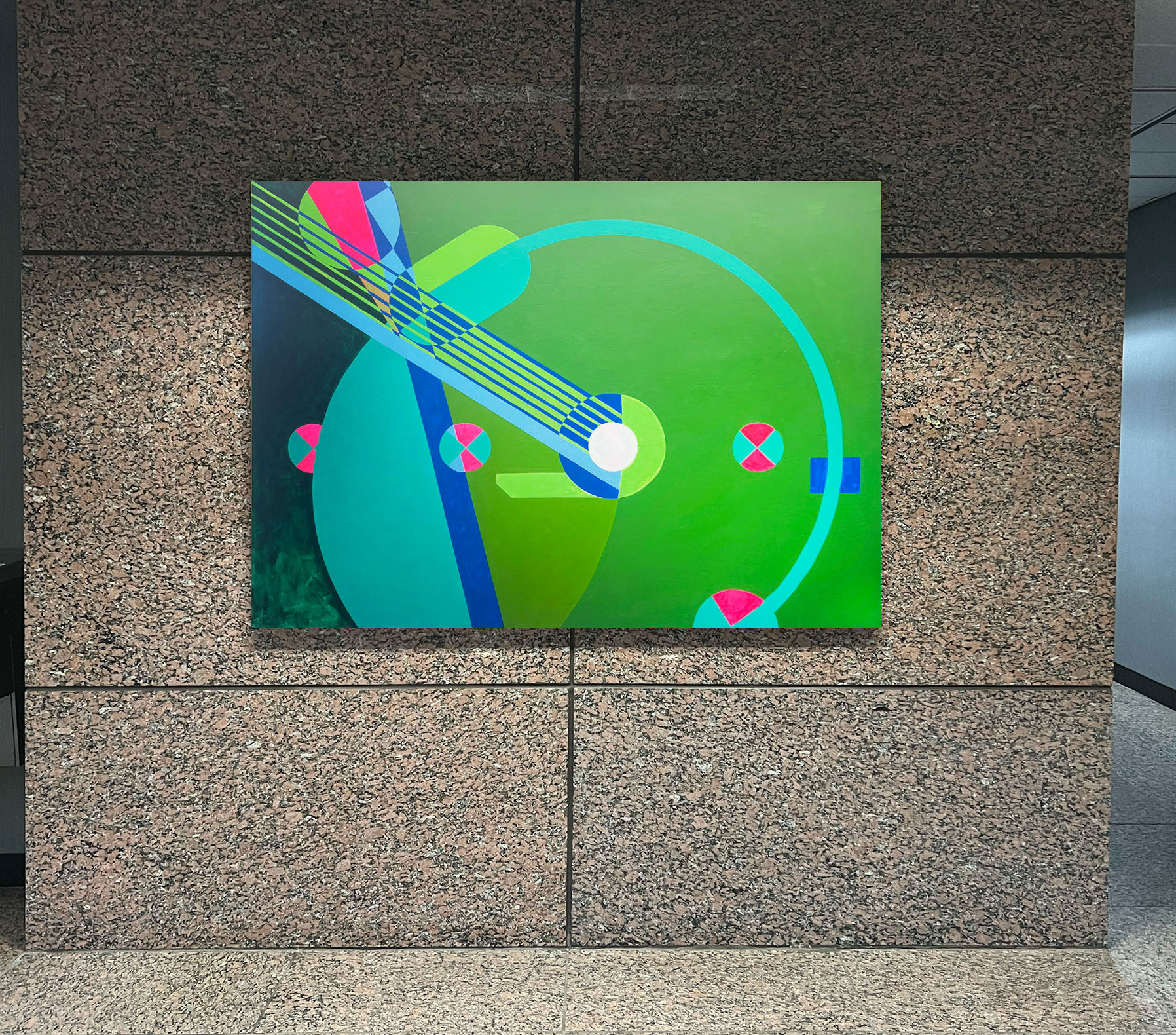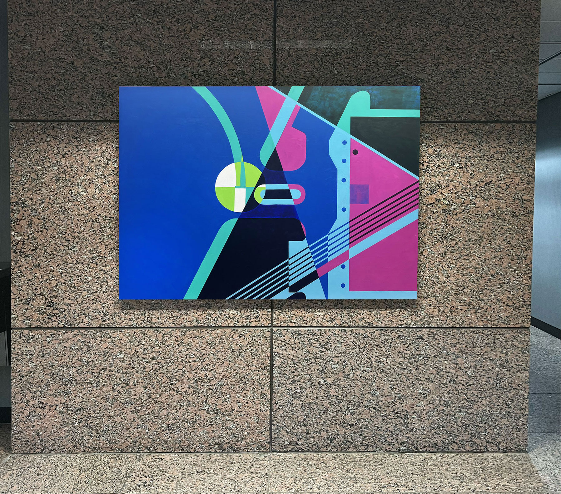 A series of commissioned paintings for 1500 Tower Place, a multi-story office building. They are derived from the building's floor plans. I photographed the floor plans, created a composition digitally by layering them on top of each other, then transferred the line work onto a wood panel, then painted in the shapes the overlapping plans created. Acrylic on wood panel – 4'x5'– March 2024.