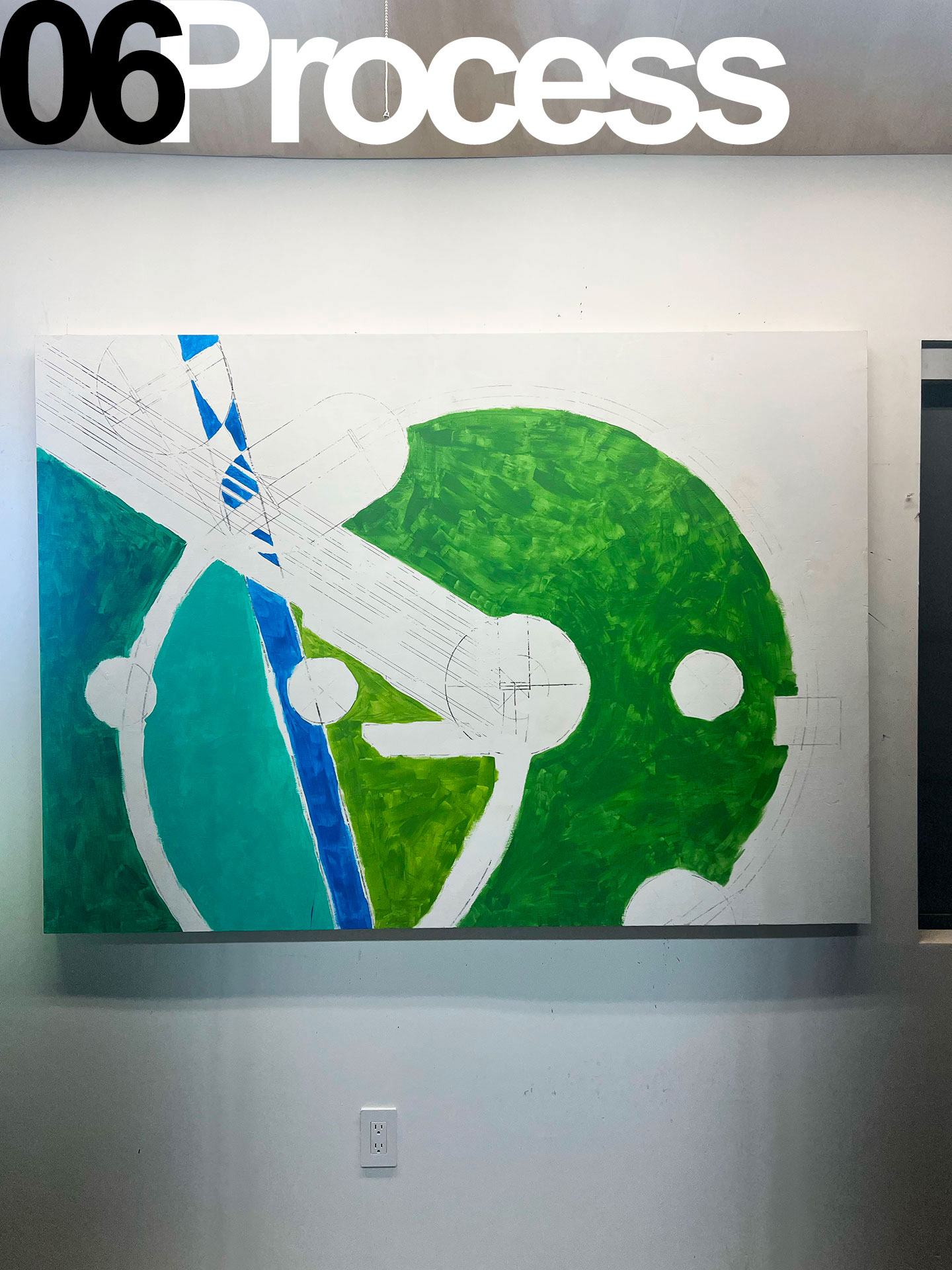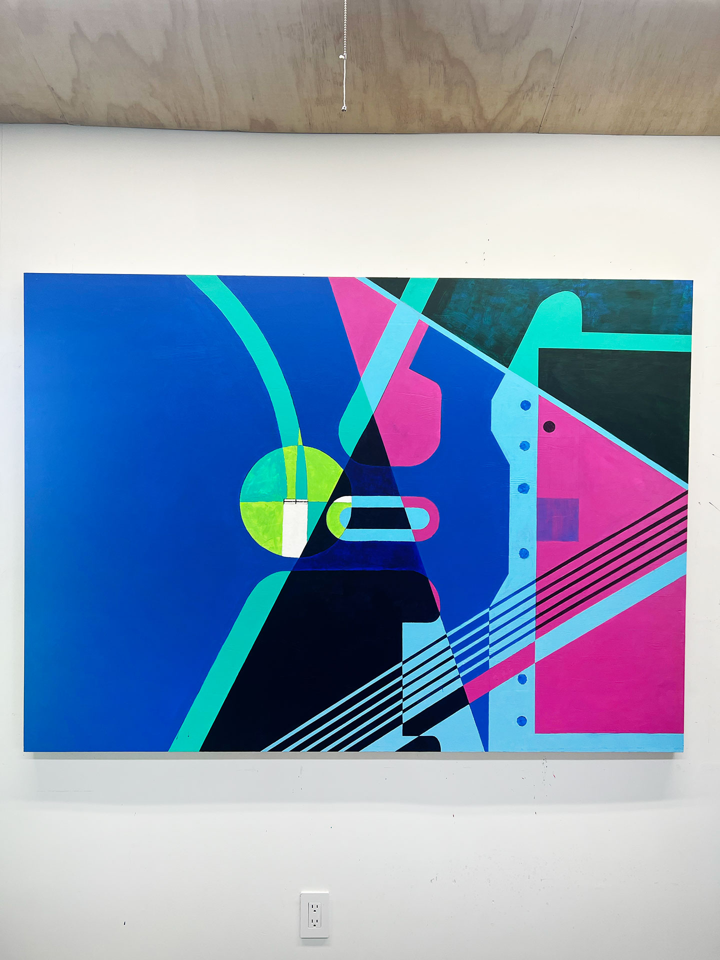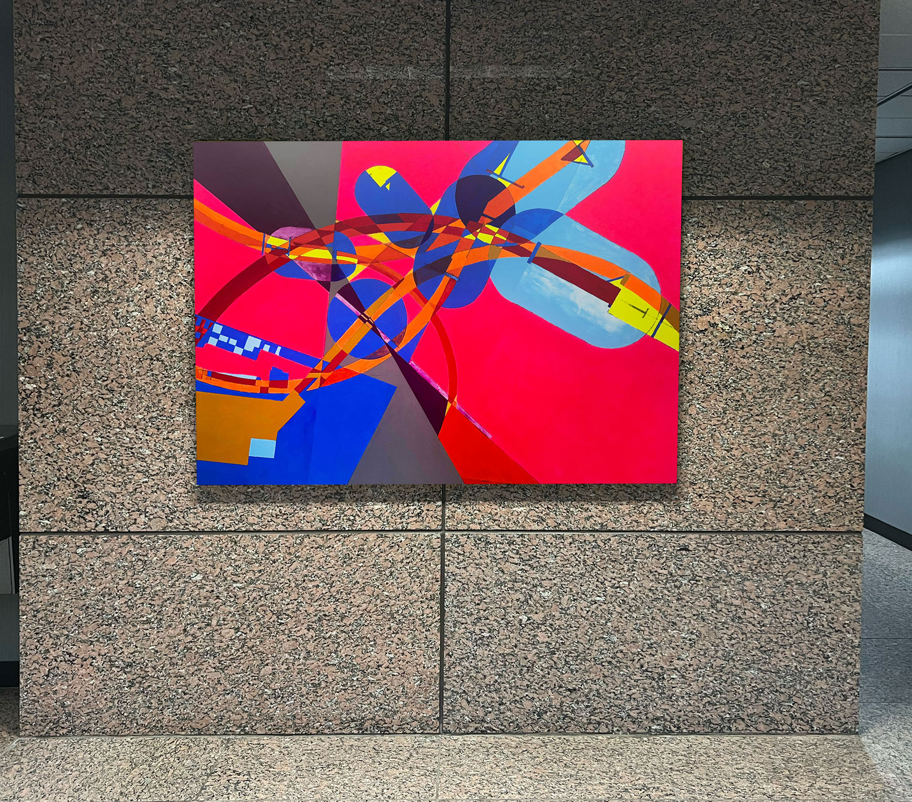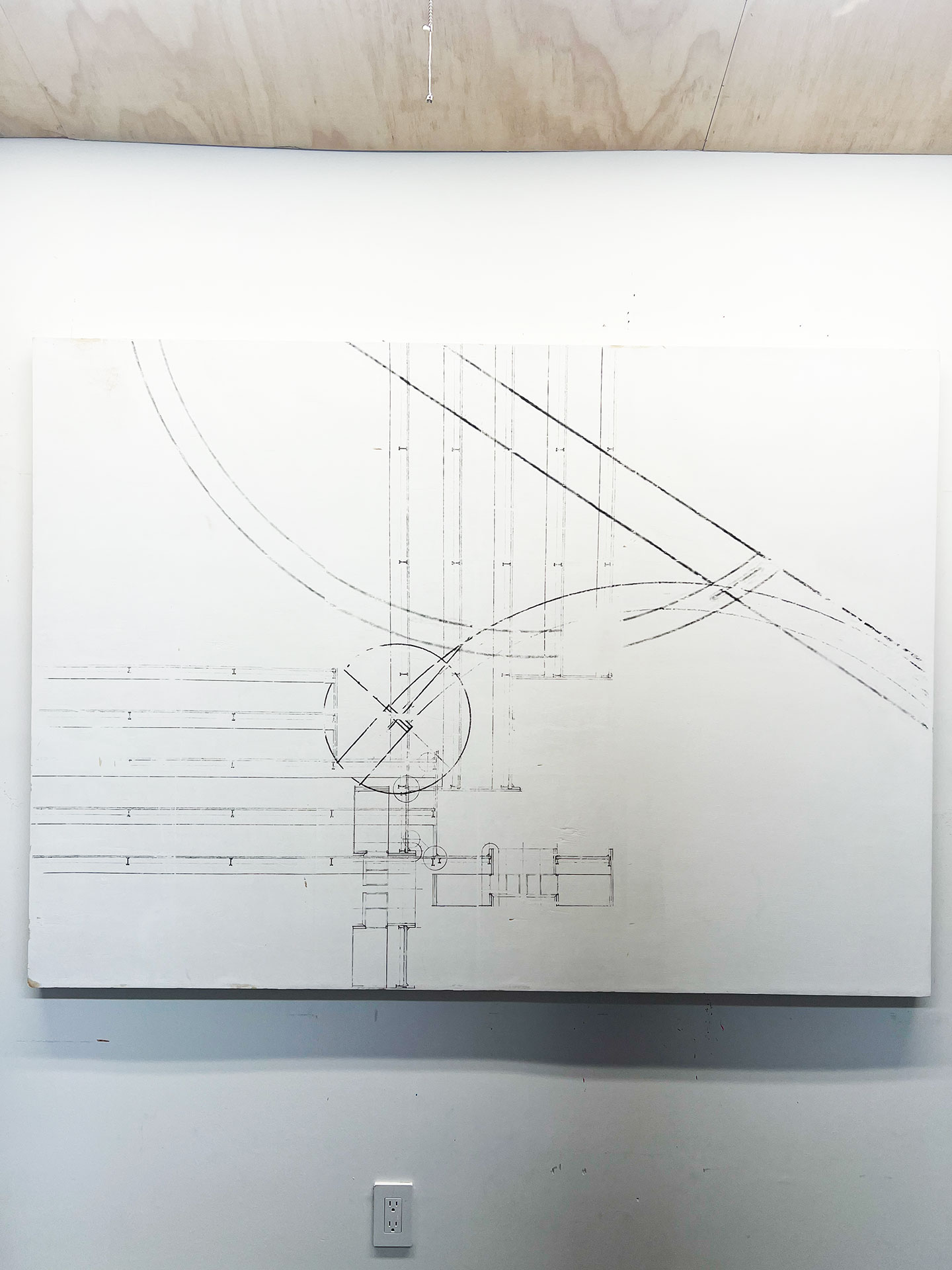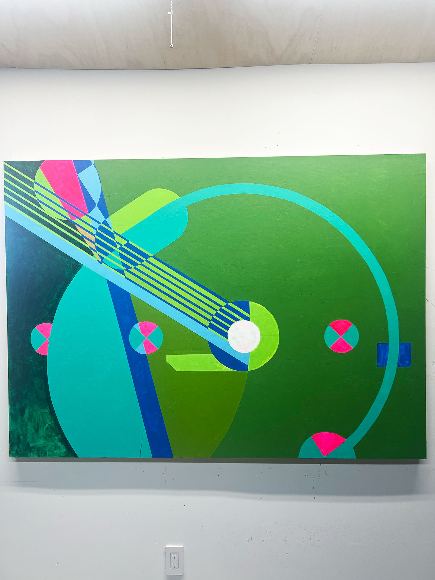 A series of commissioned paintings for 1500 Tower Place, a multi-story office building. They are derived from the building's floor plans. I photographed the floor plans, created a composition digitally by layering them on top of each other, then transferred the line work onto a wood panel, then painted in the shapes the overlapping plans created. Acrylic on wood panel – 4'x5'– March 2024.