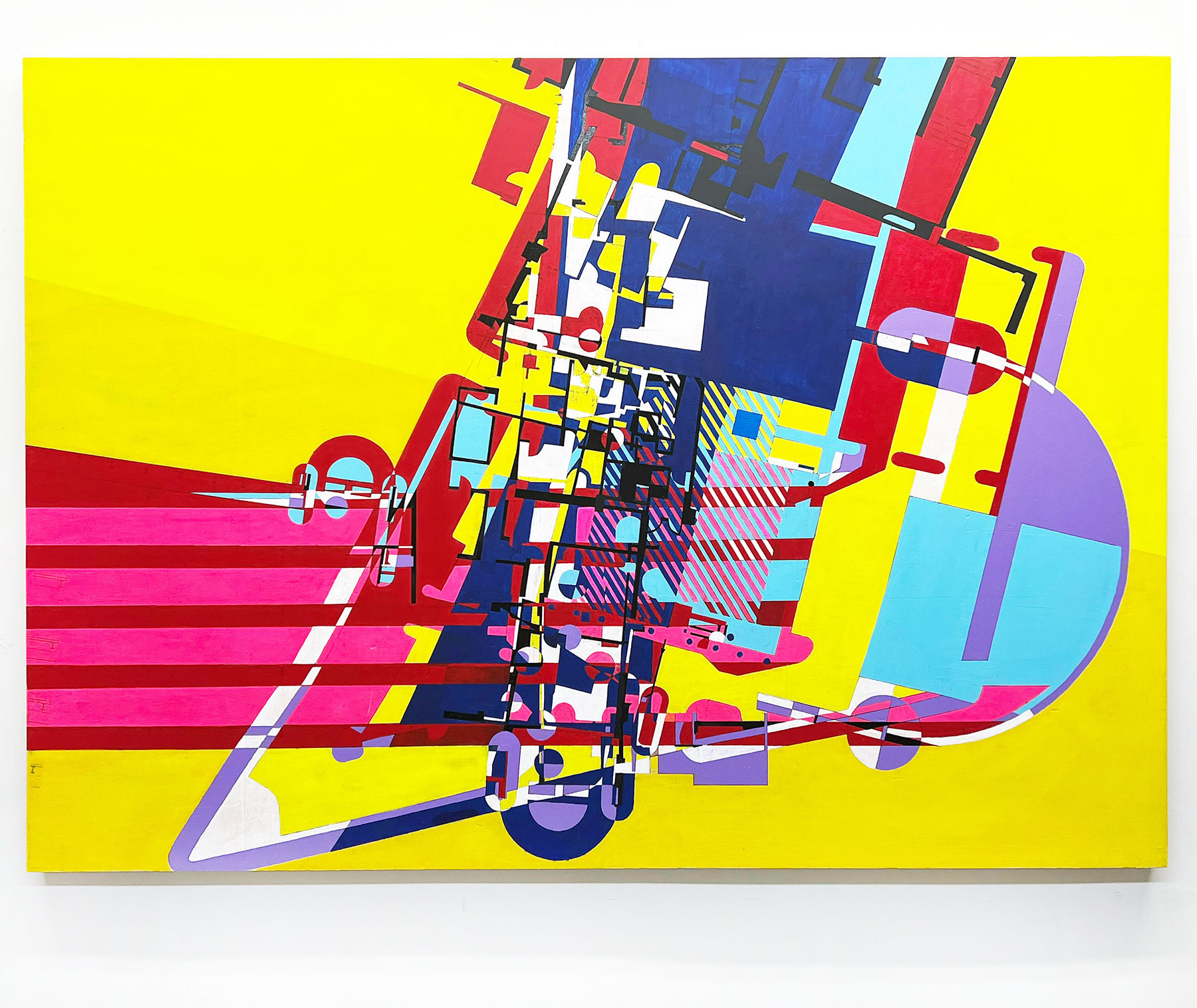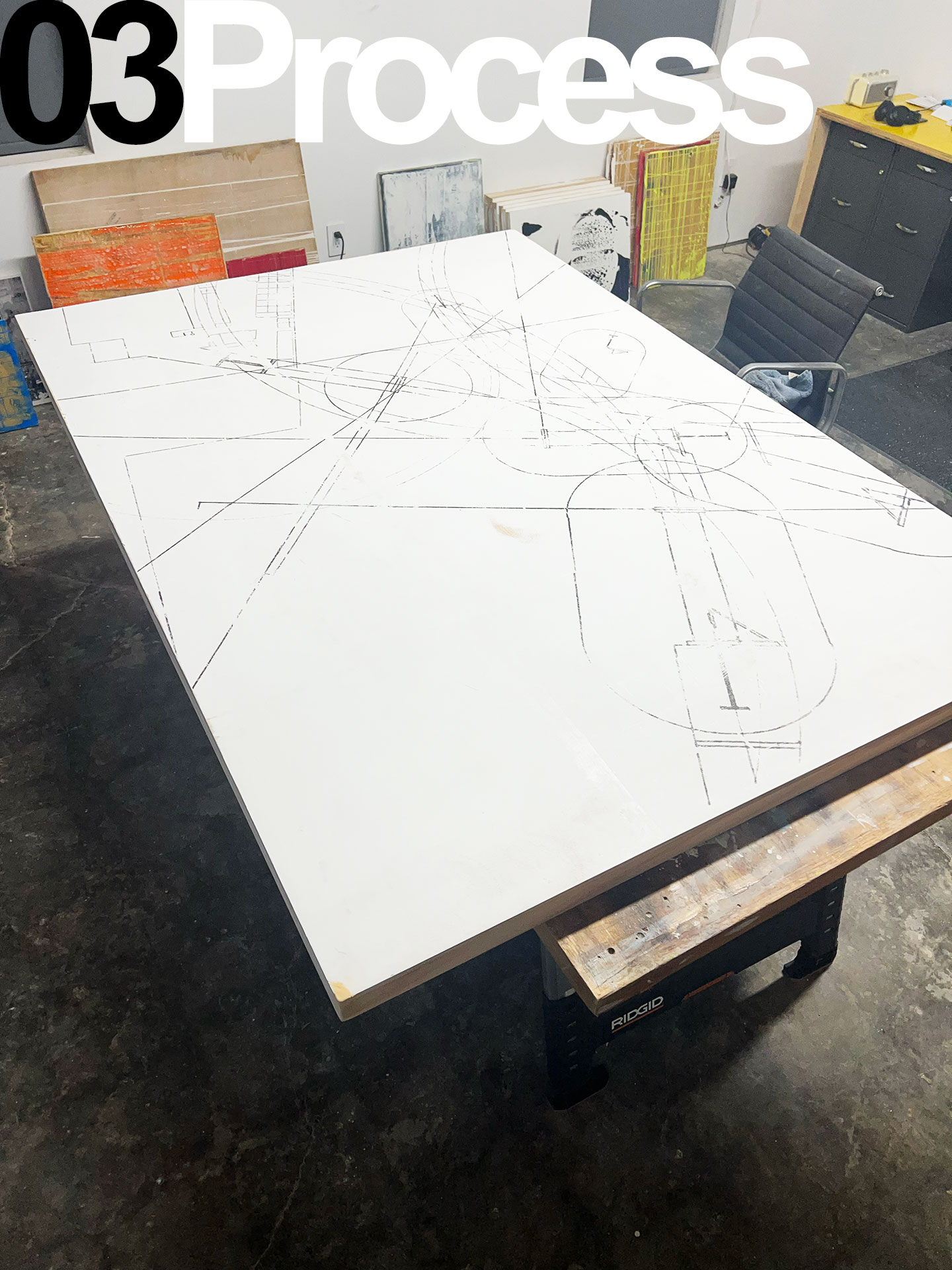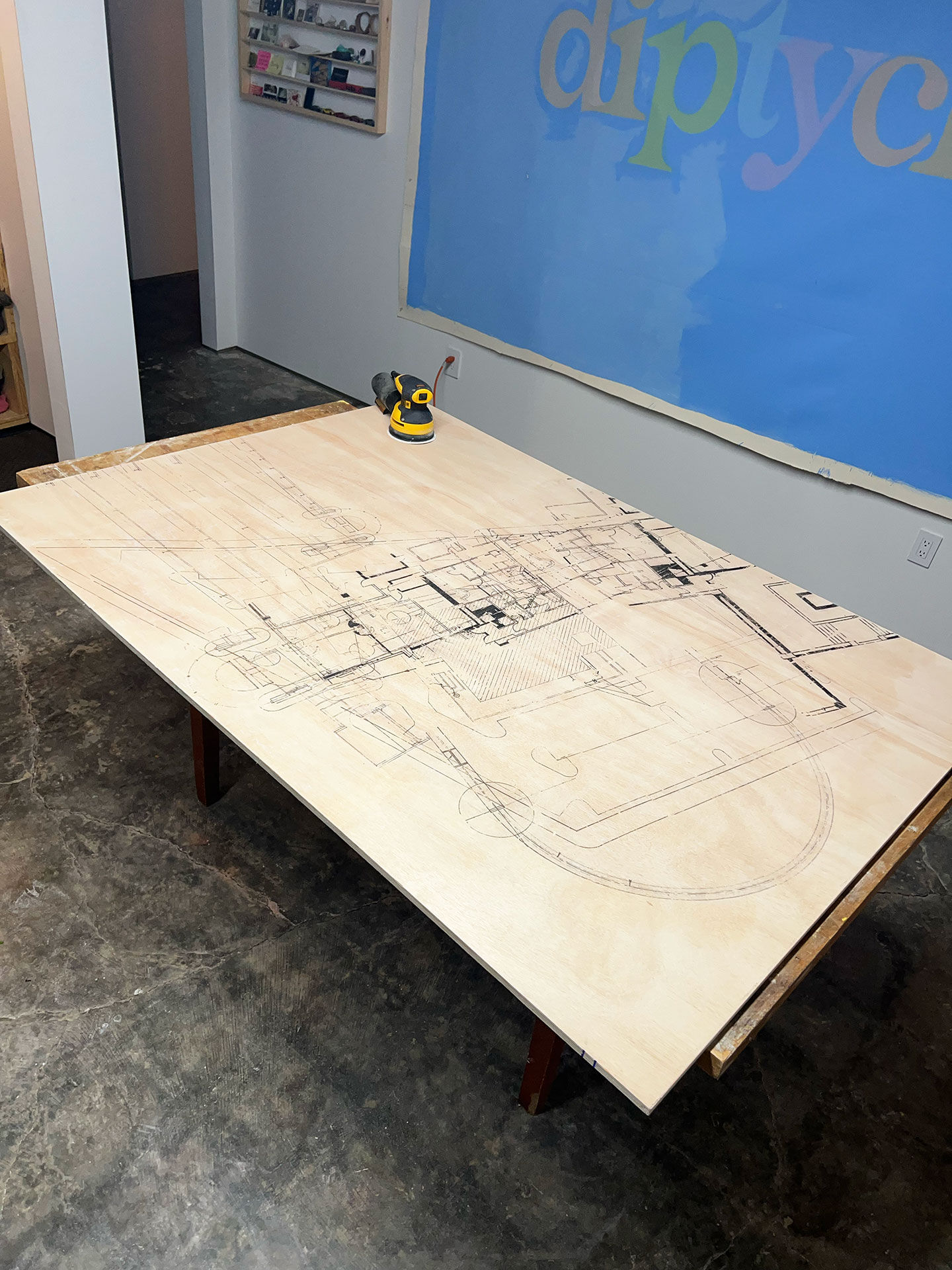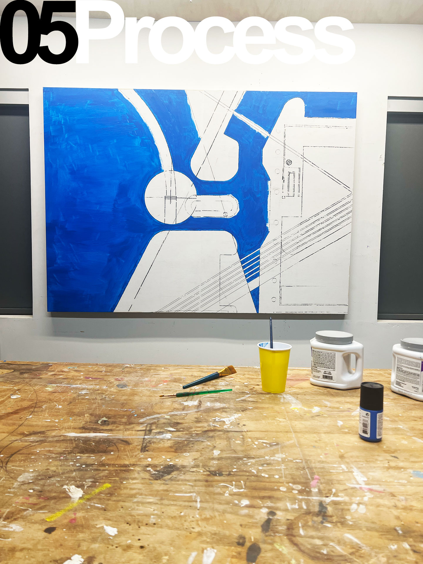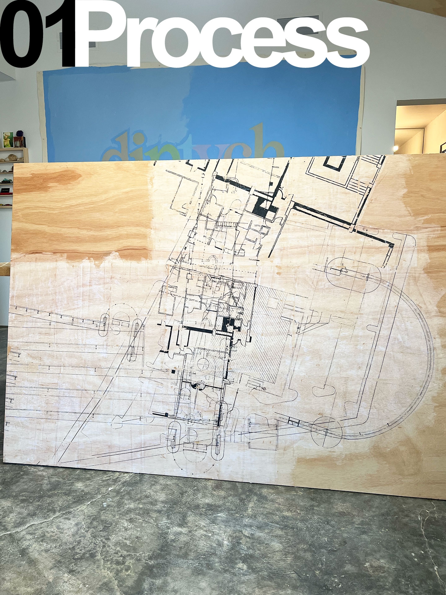 A series of commissioned paintings for 1500 Tower Place, a multi-story office building. They are derived from the building's floor plans. I photographed the floor plans, created a composition digitally by layering them on top of each other, then transferred the line work onto a wood panel, then painted in the shapes the overlapping plans created. Acrylic on wood panel – 4'x5'– March 2024.