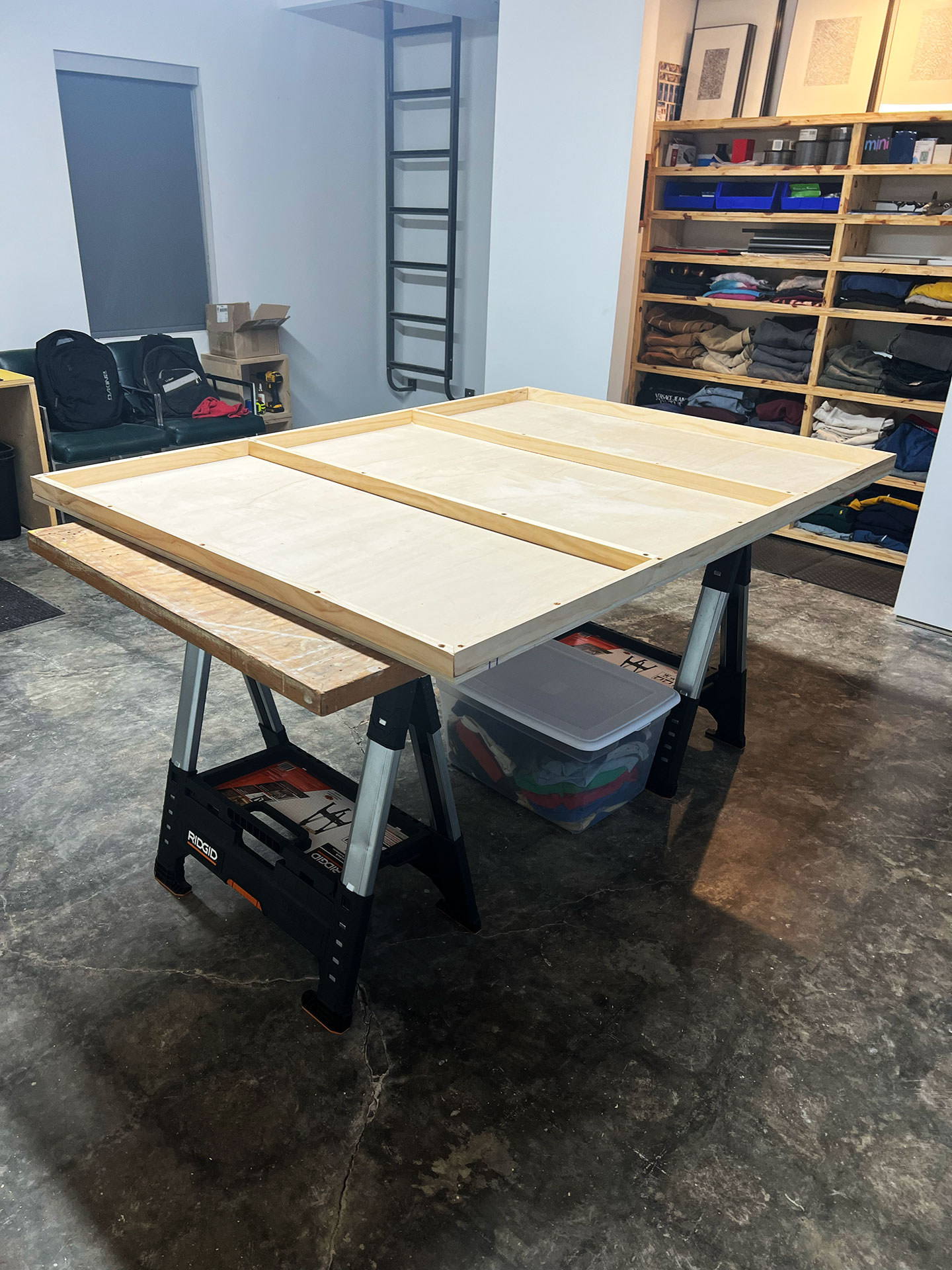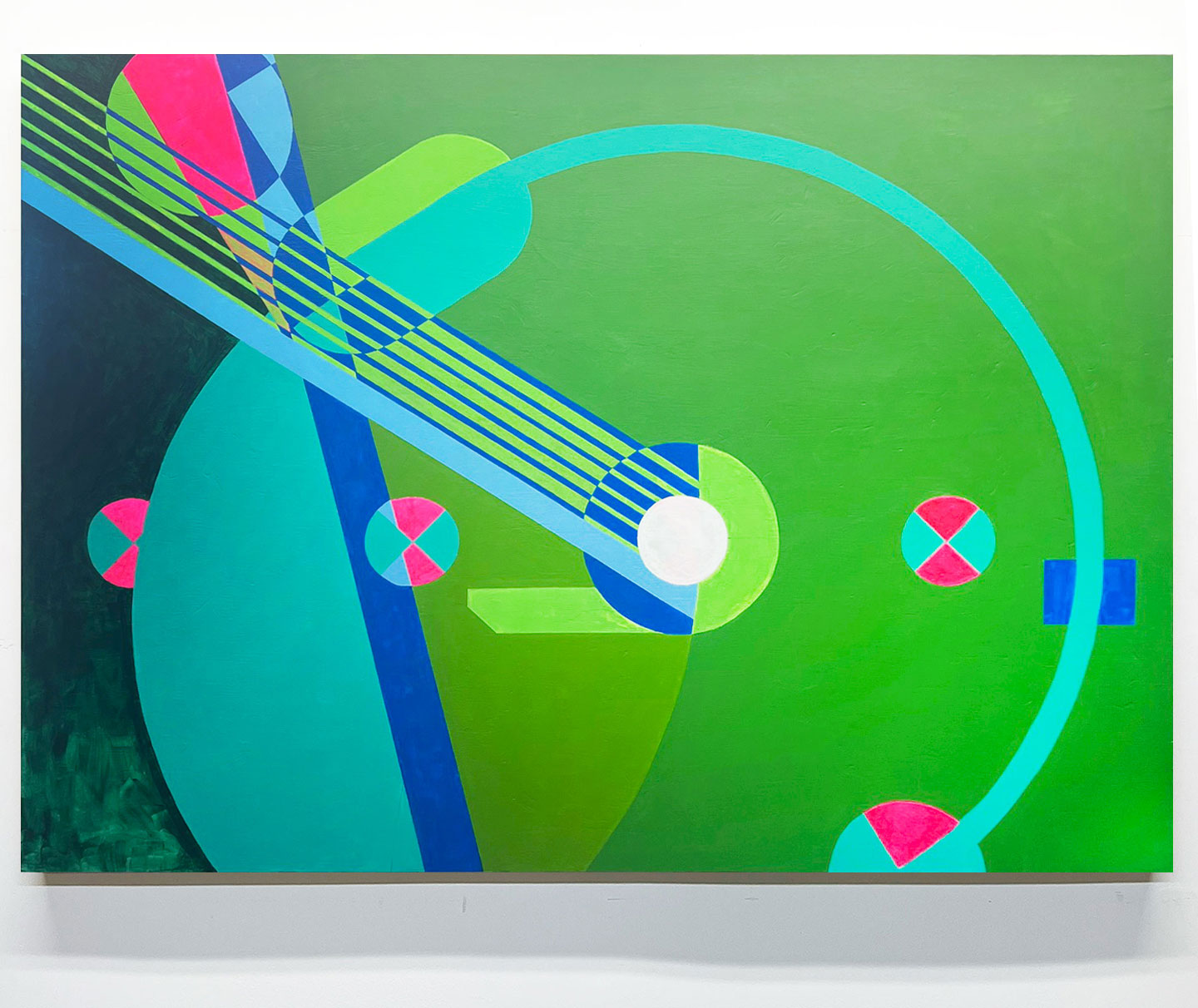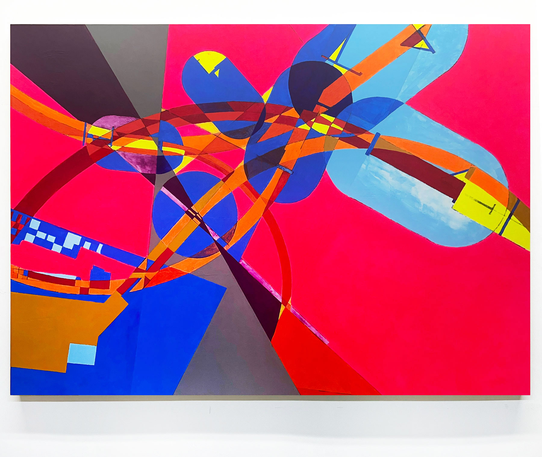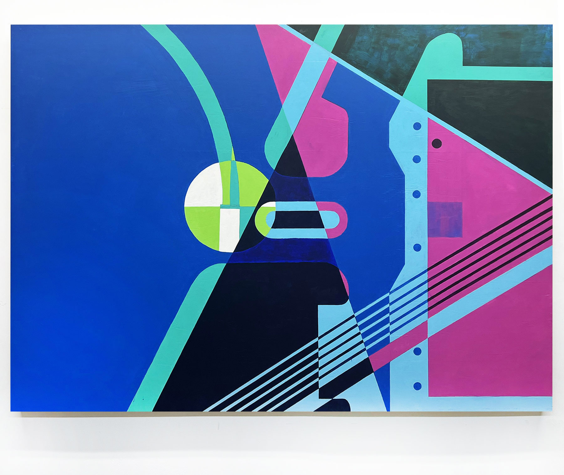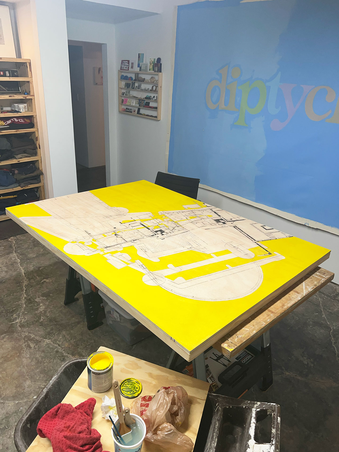 A series of commissioned paintings for 1500 Tower Place, a multi-story office building. They are derived from the building's floor plans. I photographed the floor plans, created a composition digitally by layering them on top of each other, then transferred the line work onto a wood panel, then painted in the shapes the overlapping plans created. Acrylic on wood panel – 4'x5'– March 2024.