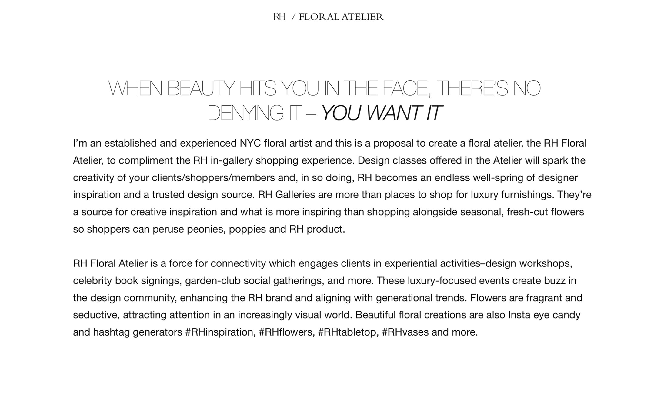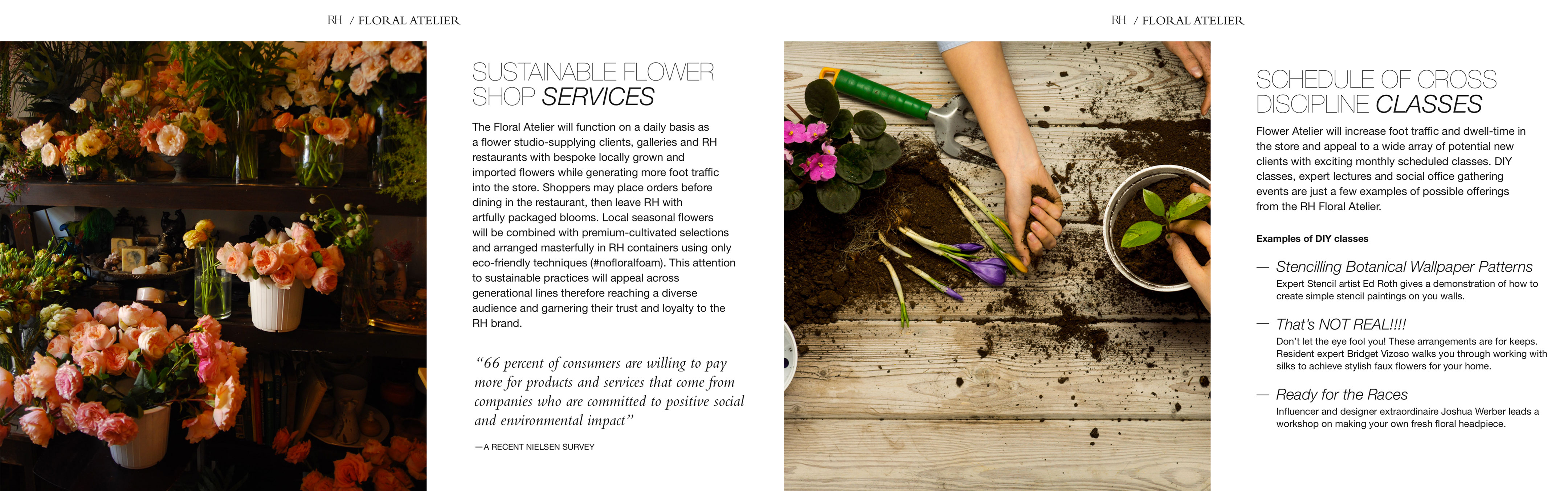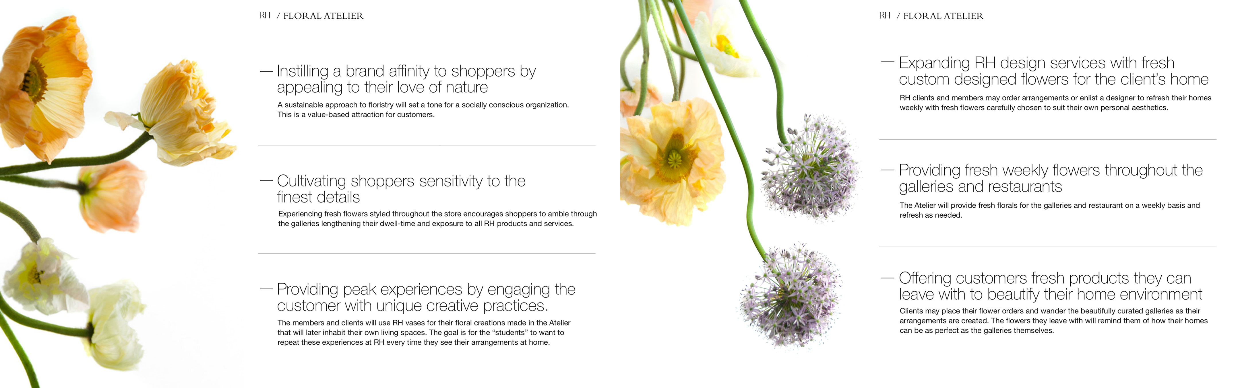 A pitch presentation for floral retailer Bridget Vizoso Designs to Restoration Hardware. The pitch proposes an in-store Floral Atelier.