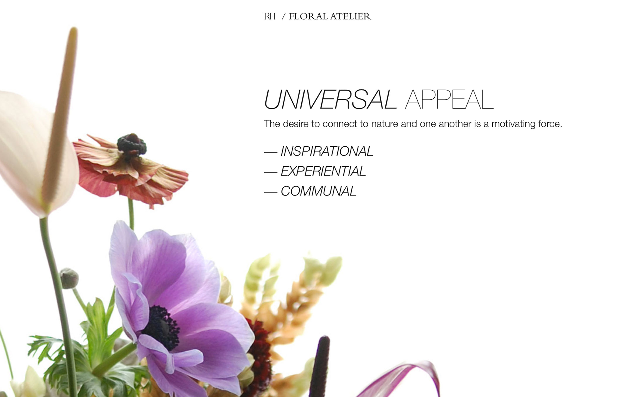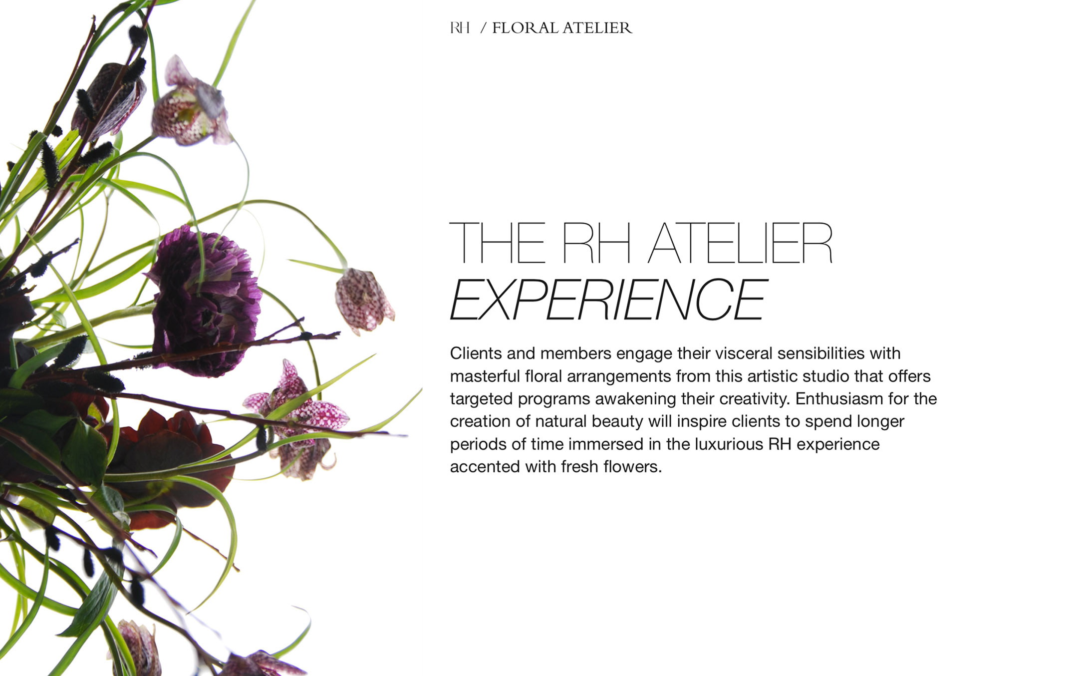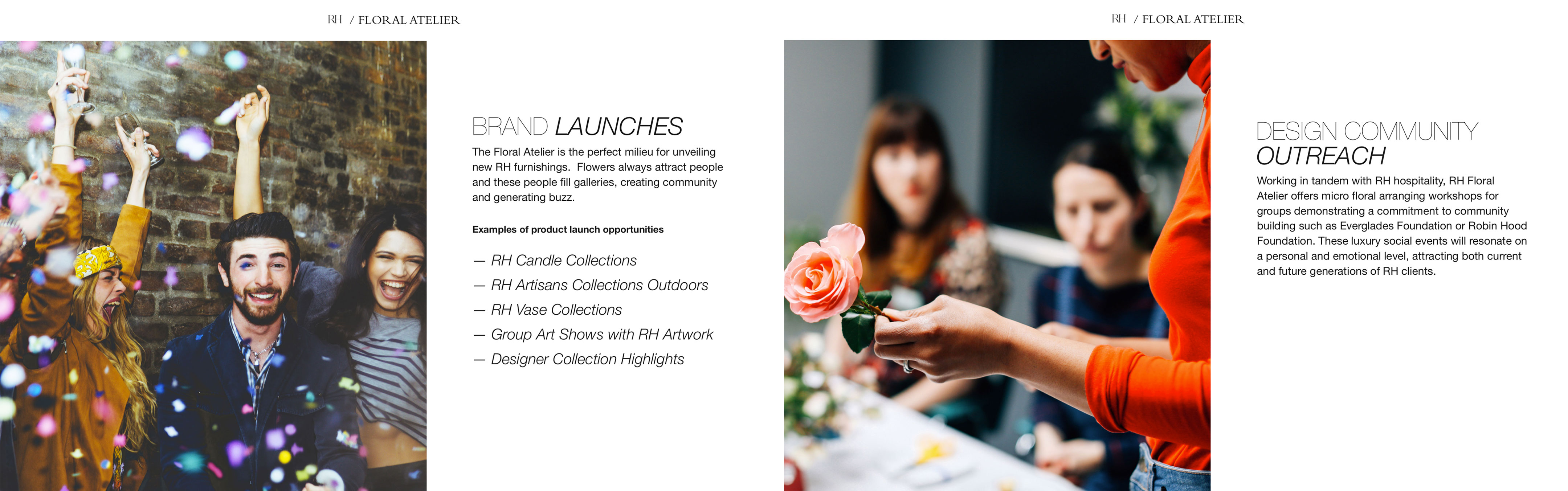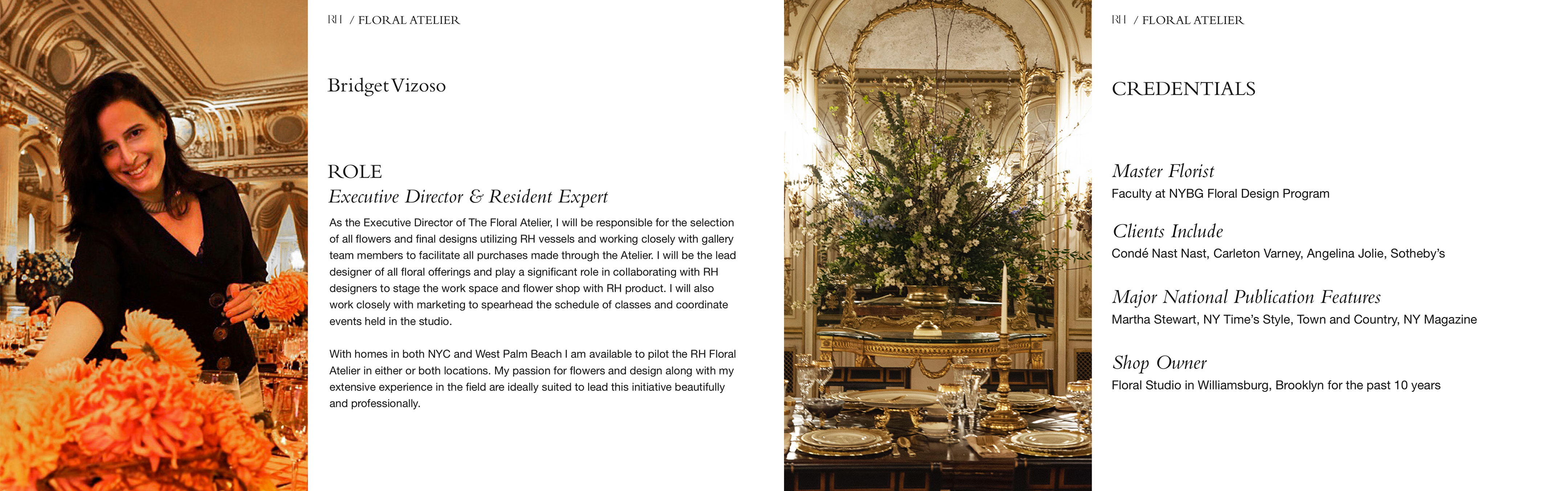 A pitch presentation for floral retailer Bridget Vizoso Designs to Restoration Hardware. The pitch proposes an in-store Floral Atelier.