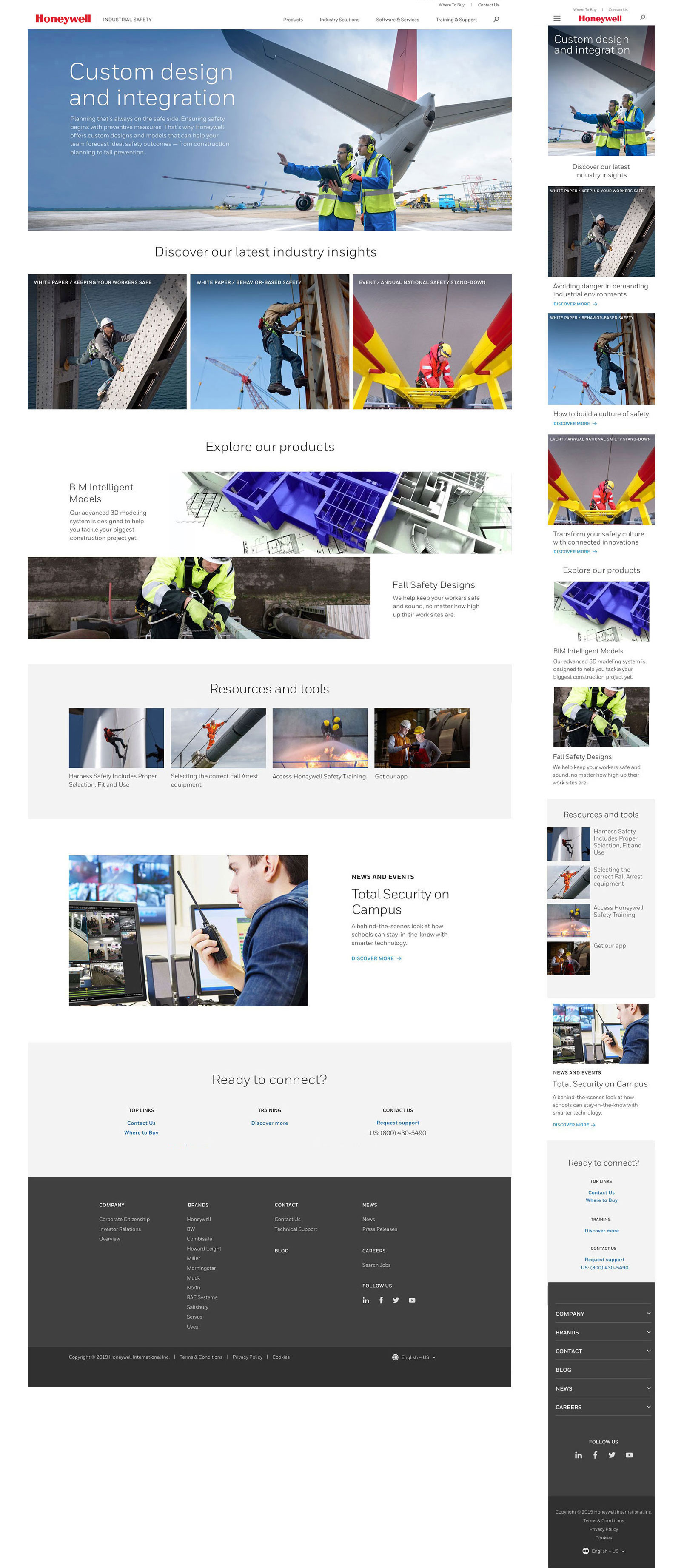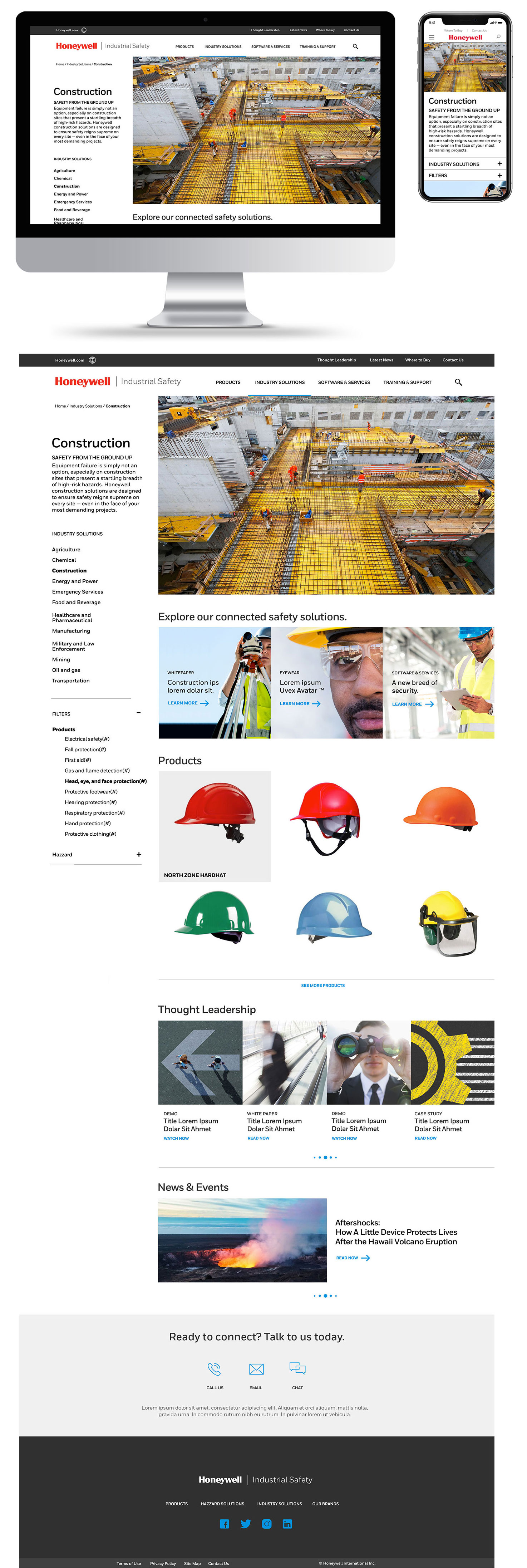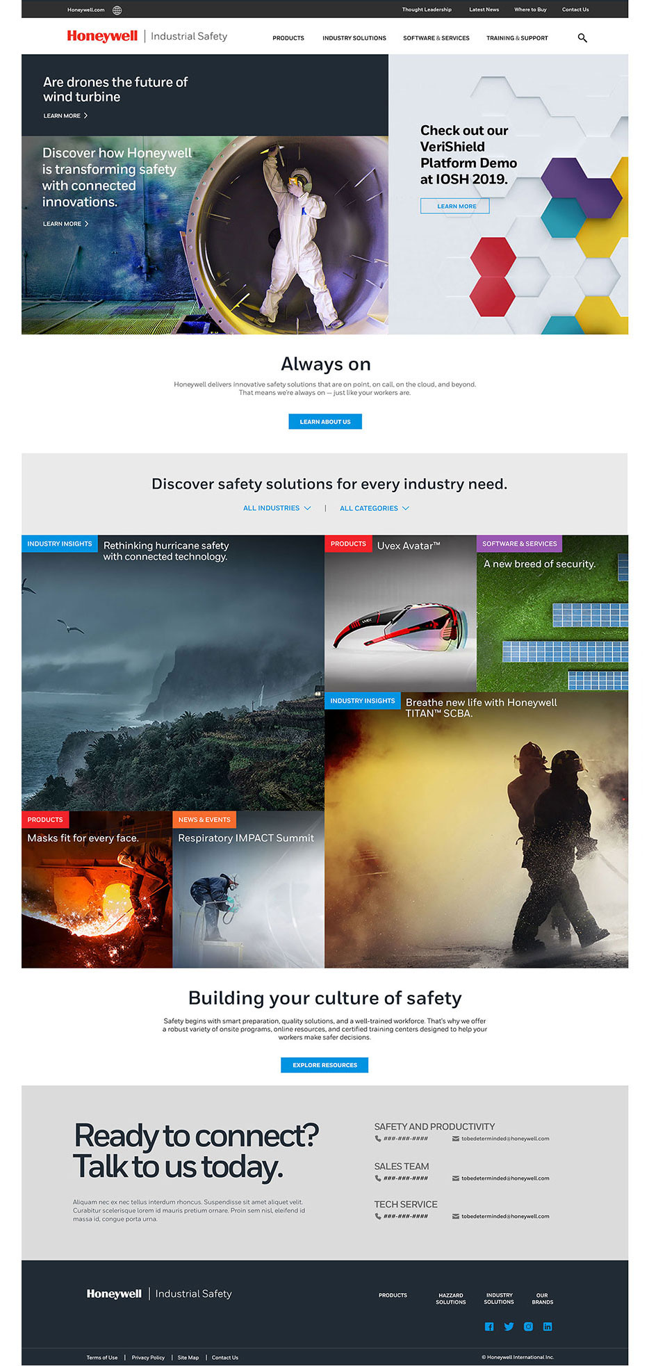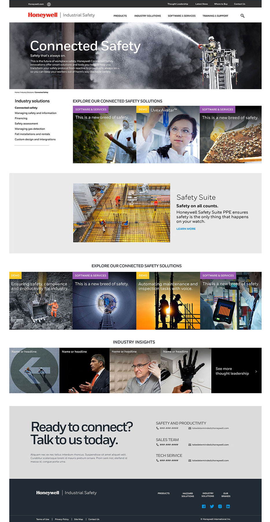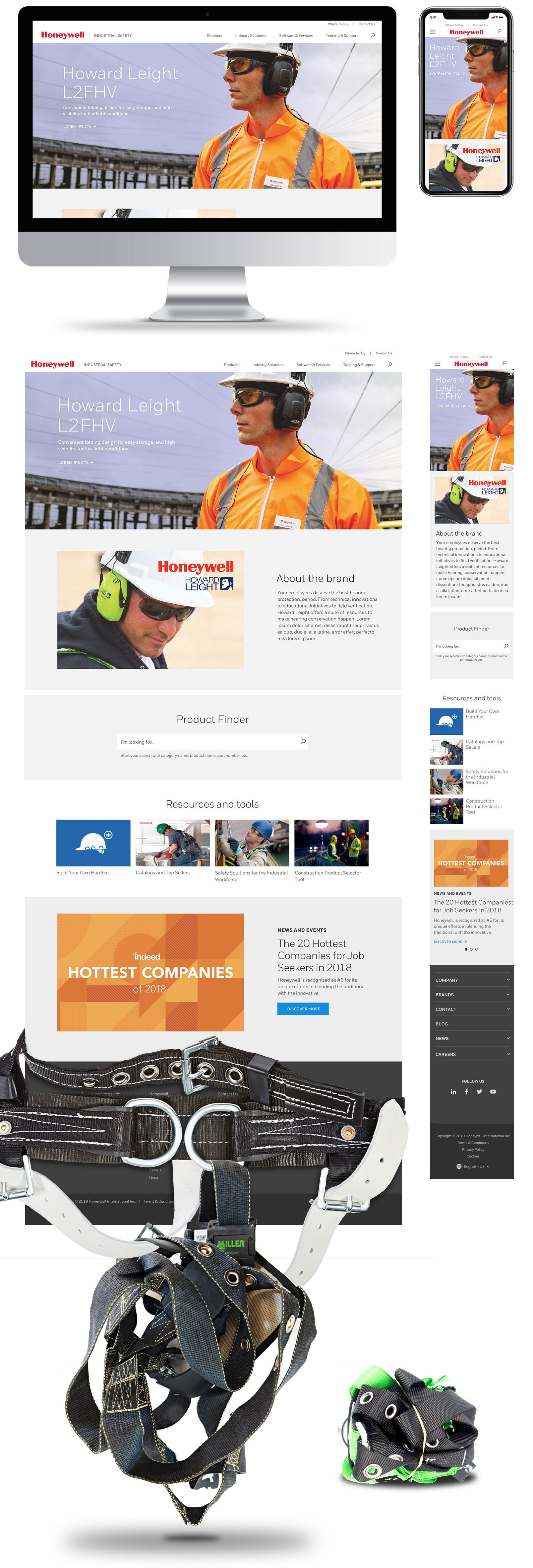 The redesign of Honeywell's industrial safety website, a division of Honeywell that specializes in everything safety related, including clothing, industrial solutions, and software and services solutions.
