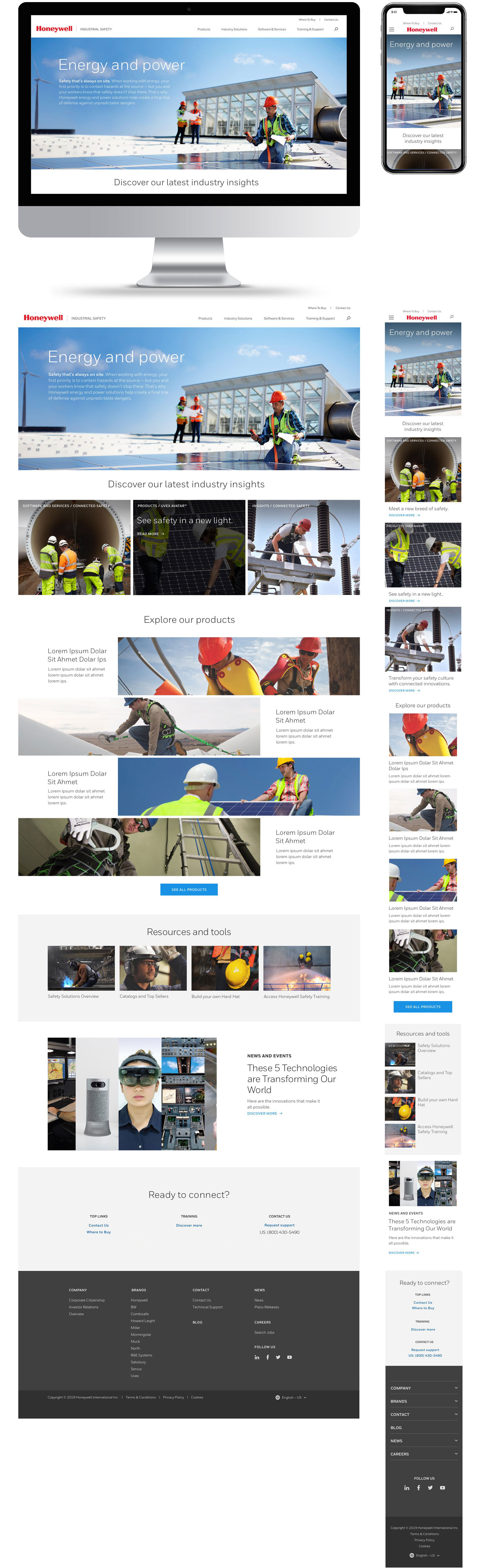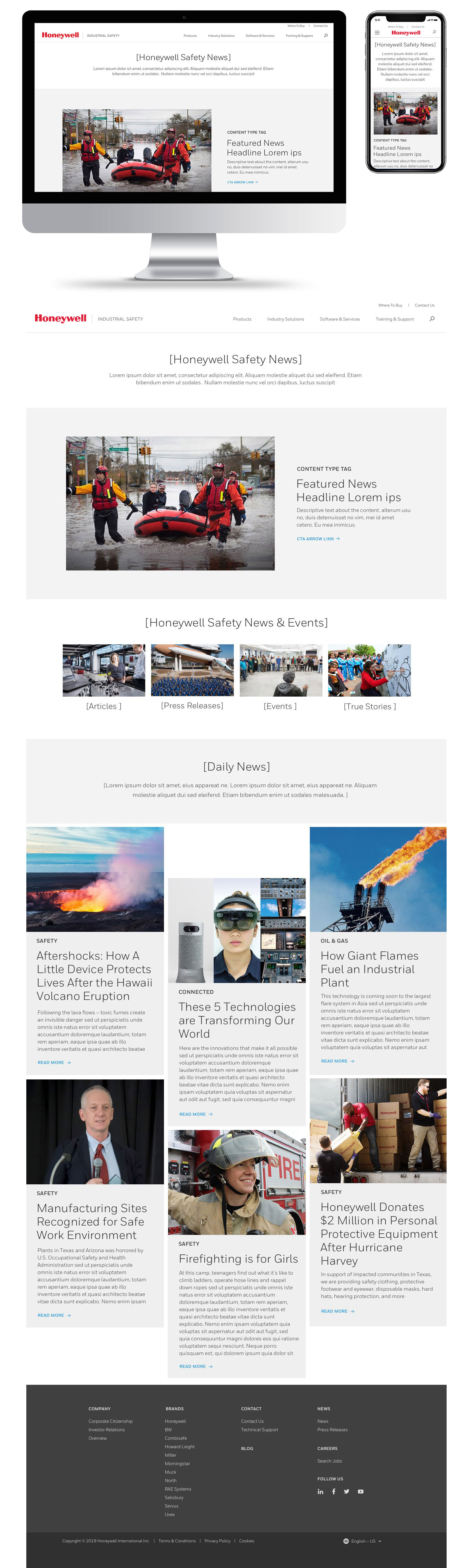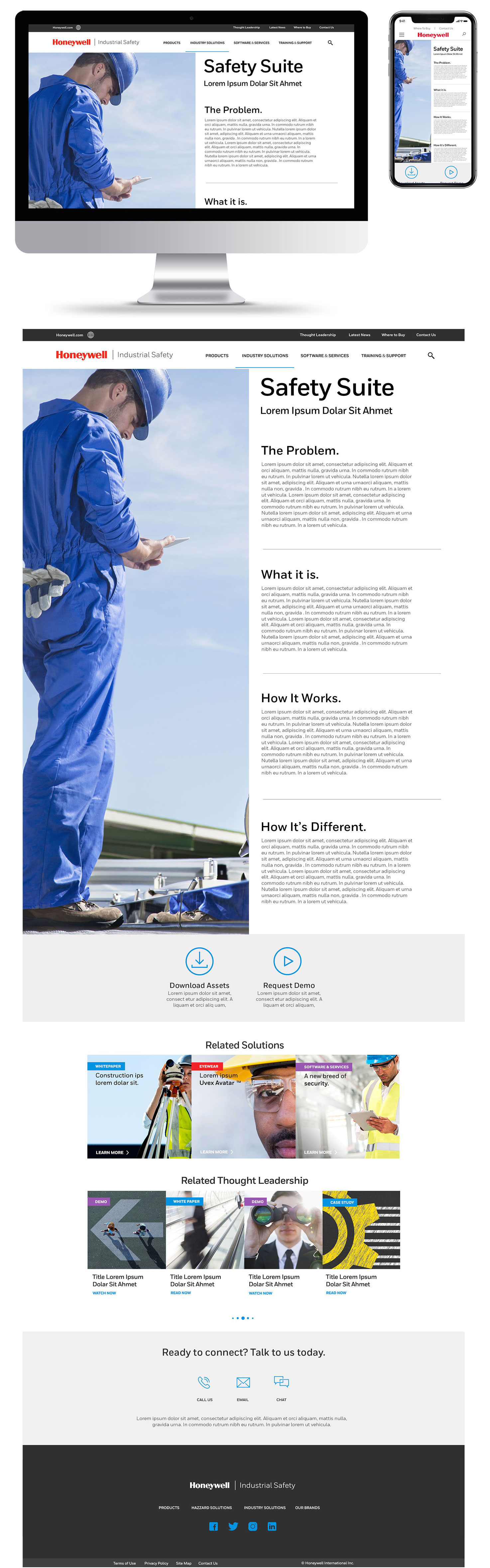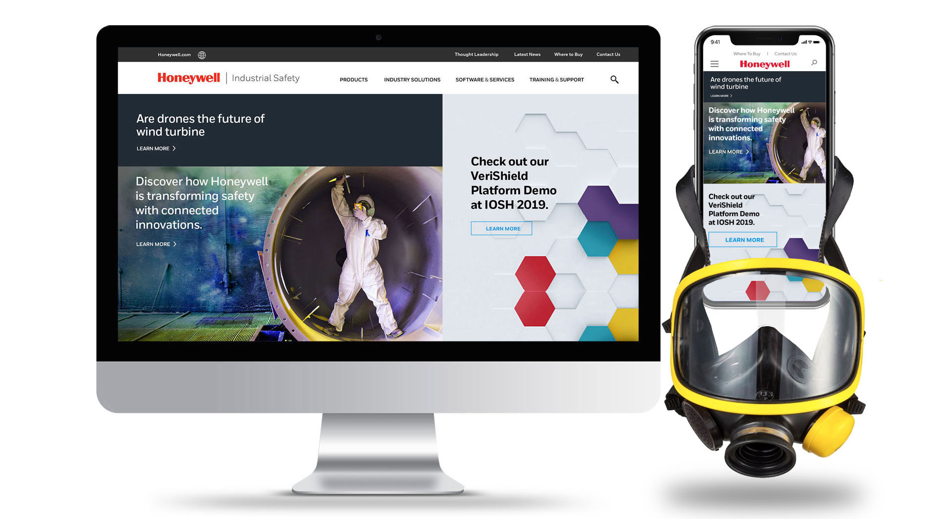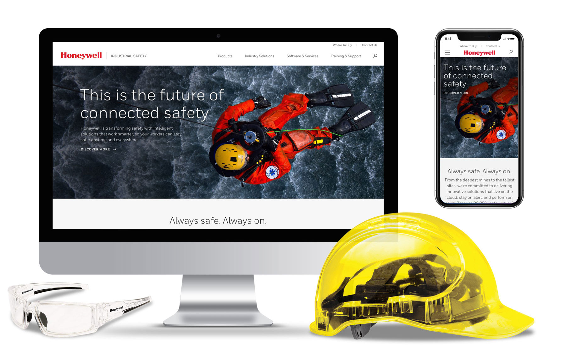 The redesign of Honeywell's industrial safety website, a division of Honeywell that specializes in everything safety related, including clothing, industrial solutions, and software and services solutions.