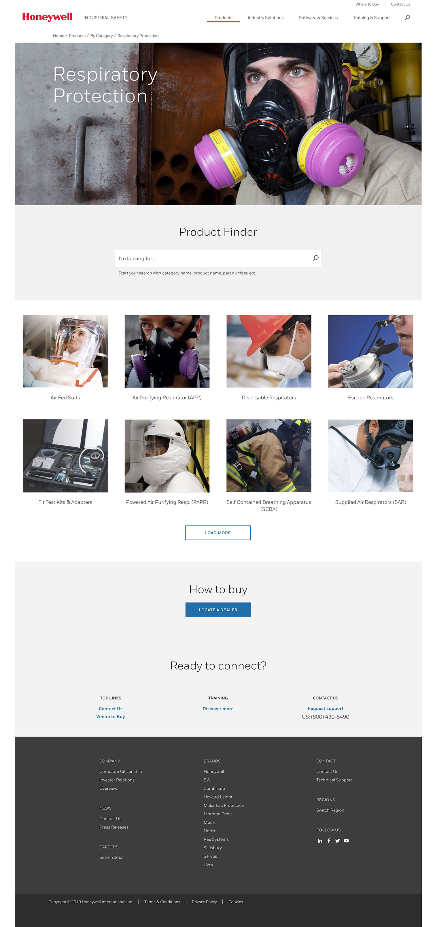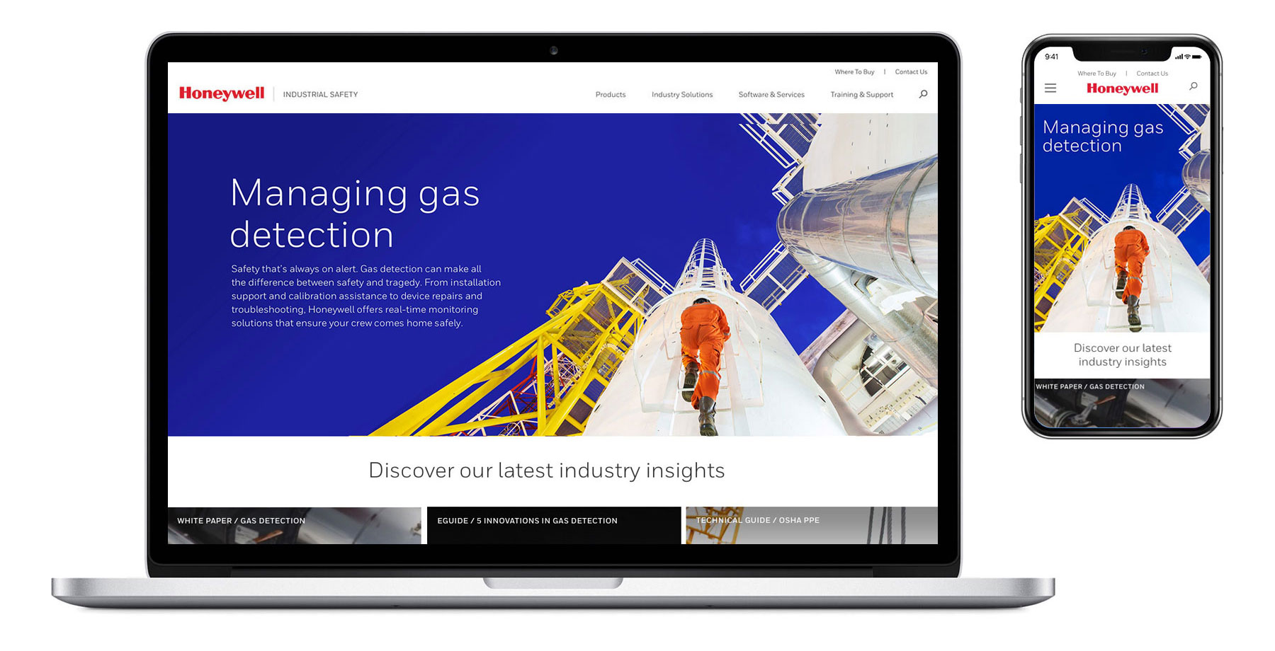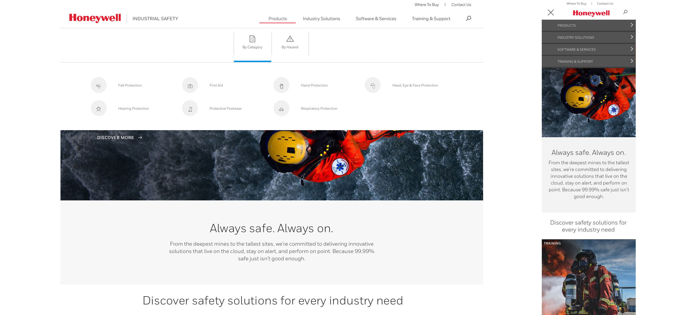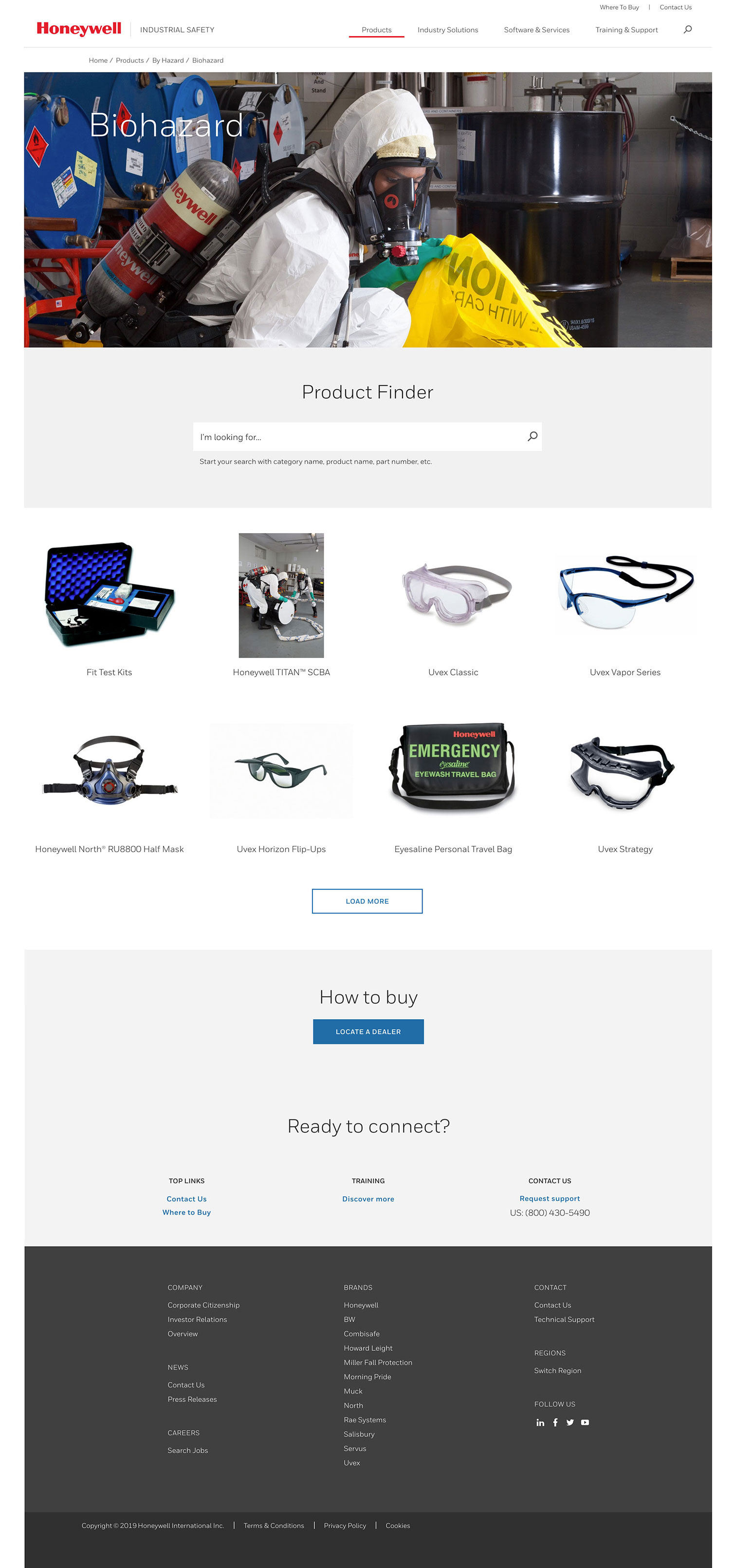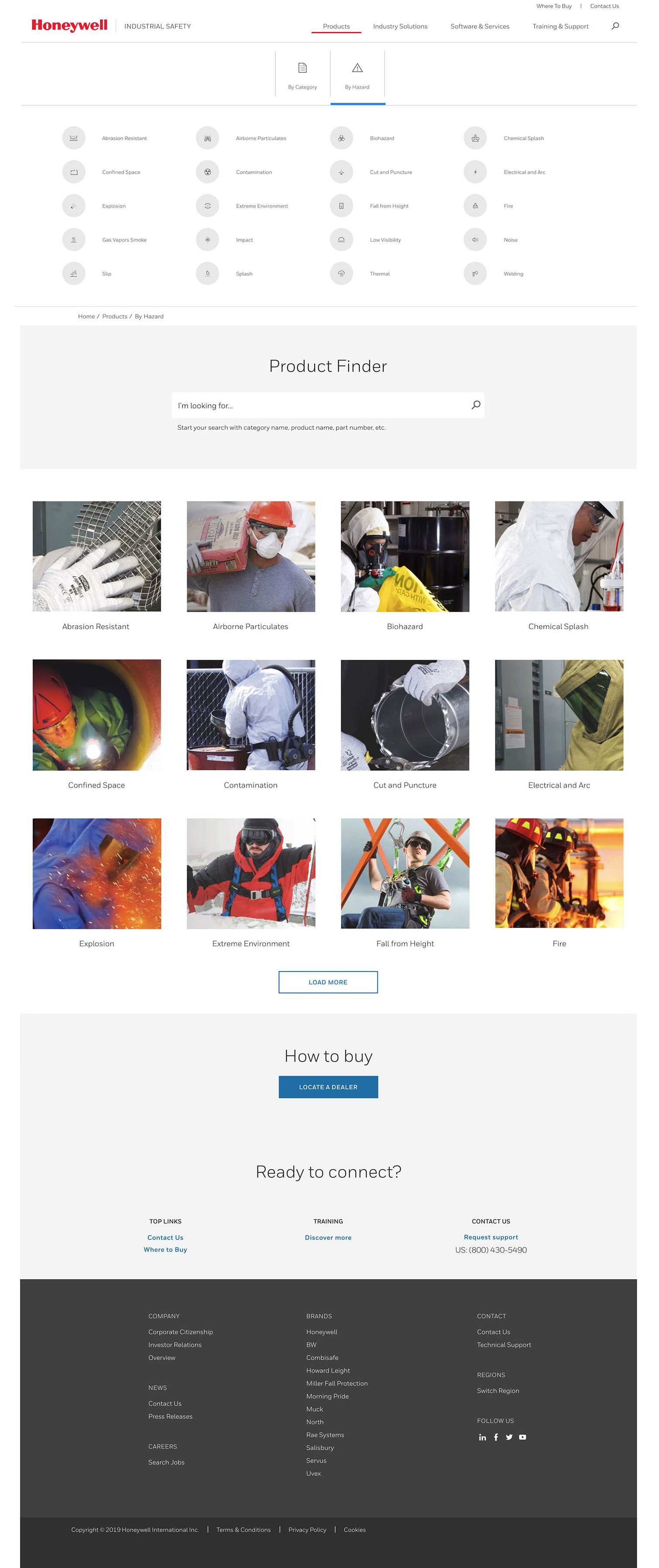 The redesign of Honeywell's industrial safety website, a division of Honeywell that specializes in everything safety related, including clothing, industrial solutions, and software and services solutions.