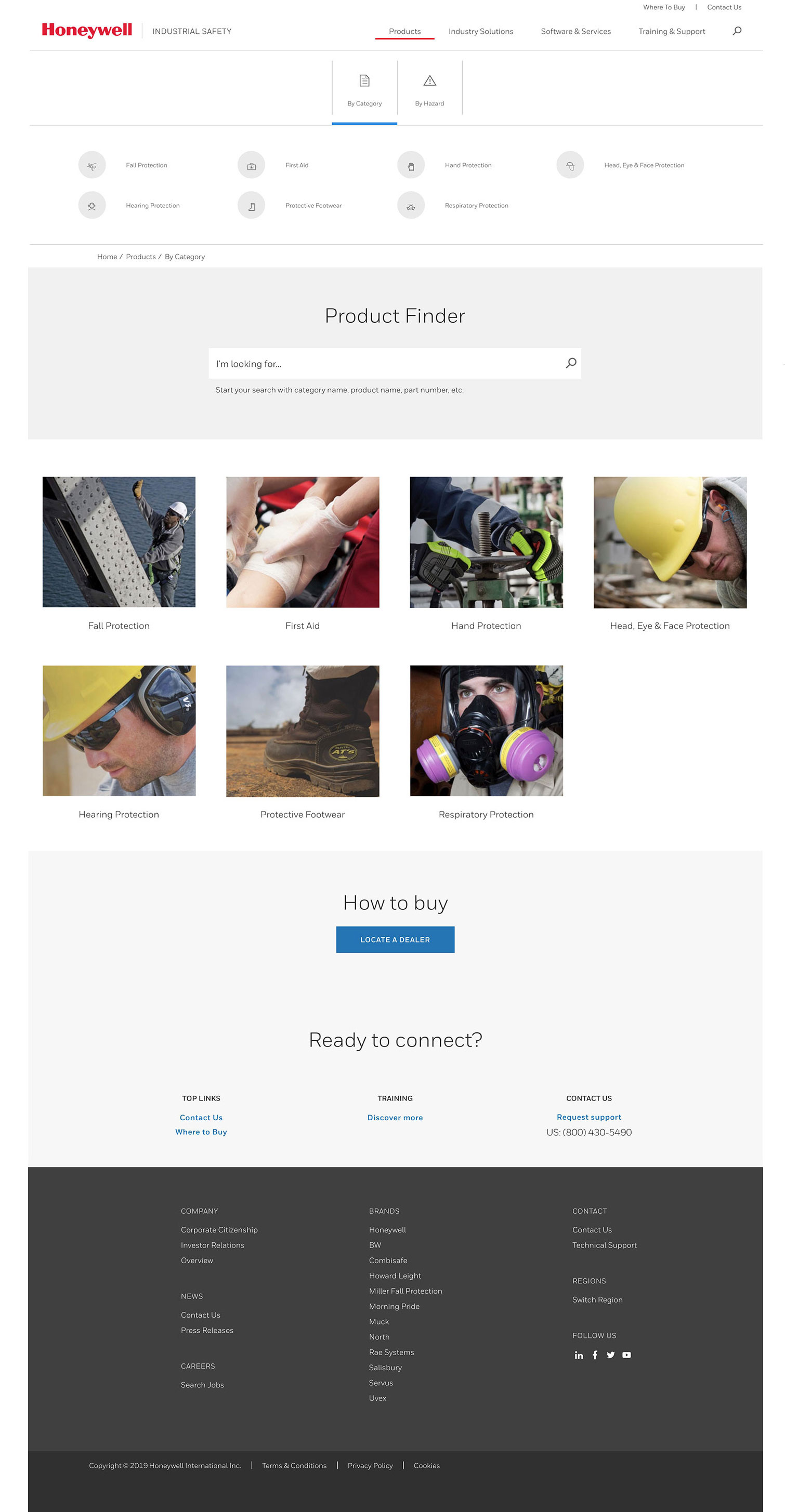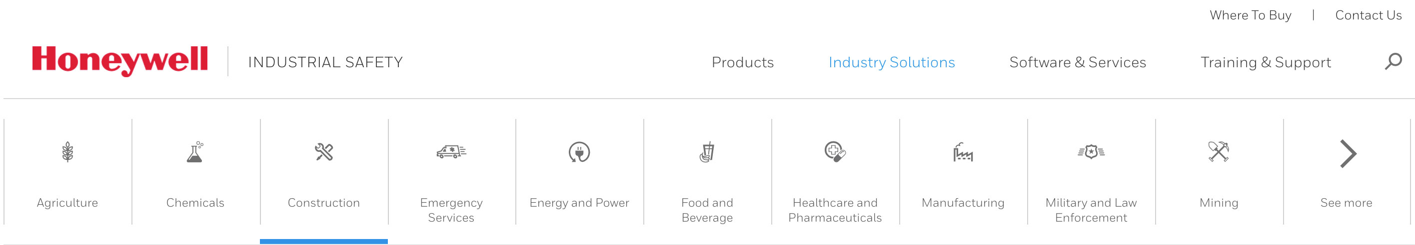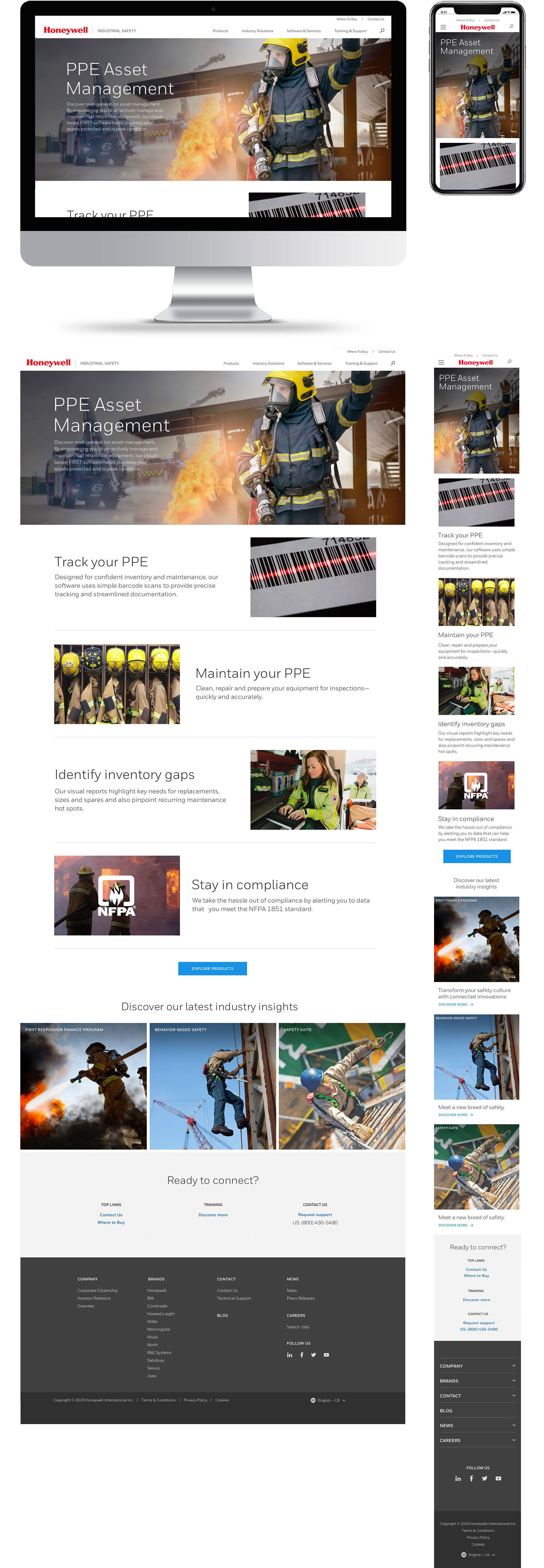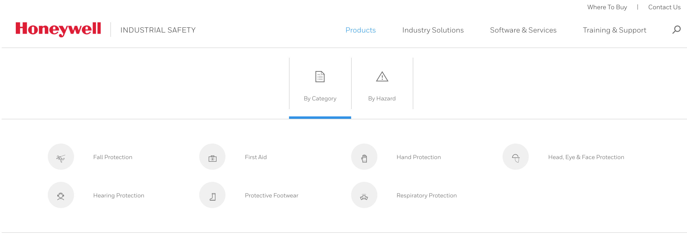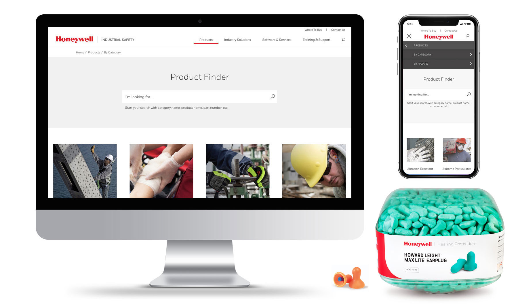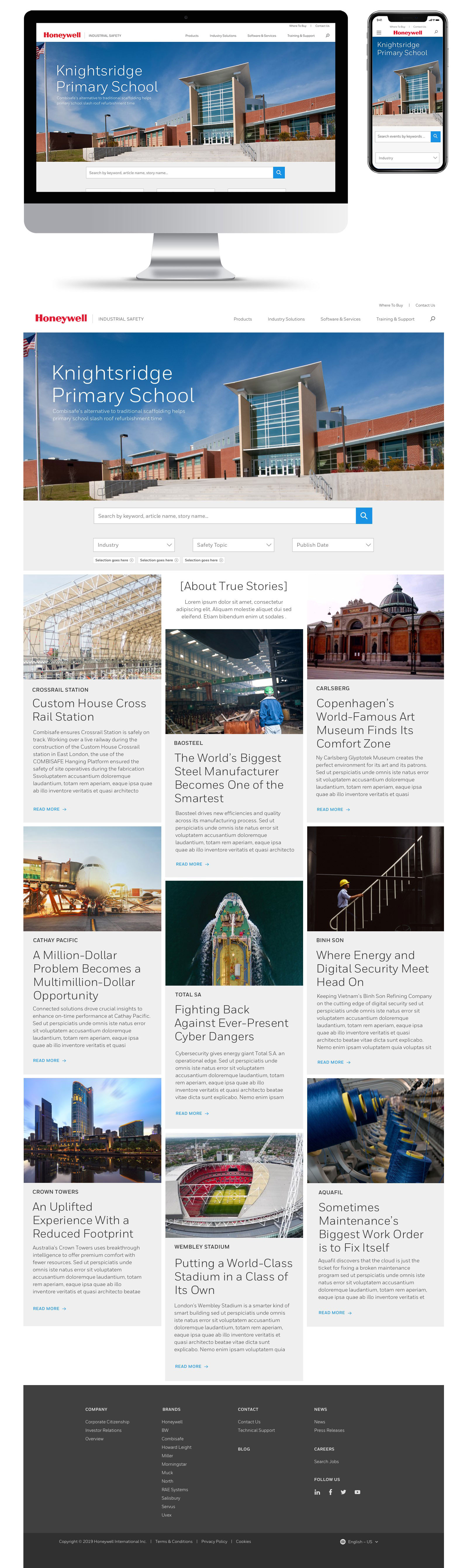 The redesign of Honeywell's industrial safety website, a division of Honeywell that specializes in everything safety related, including clothing, industrial solutions, and software and services solutions.