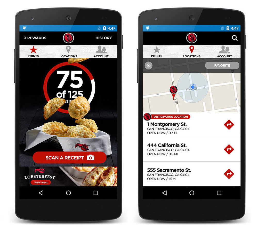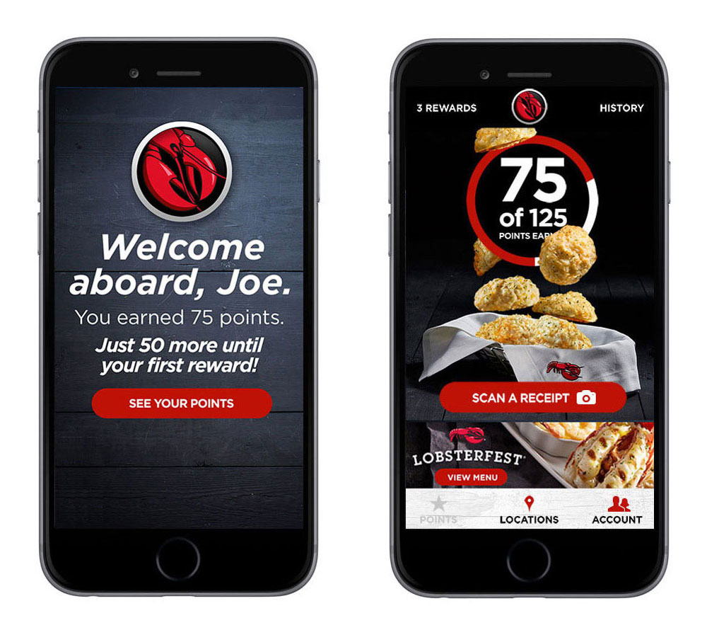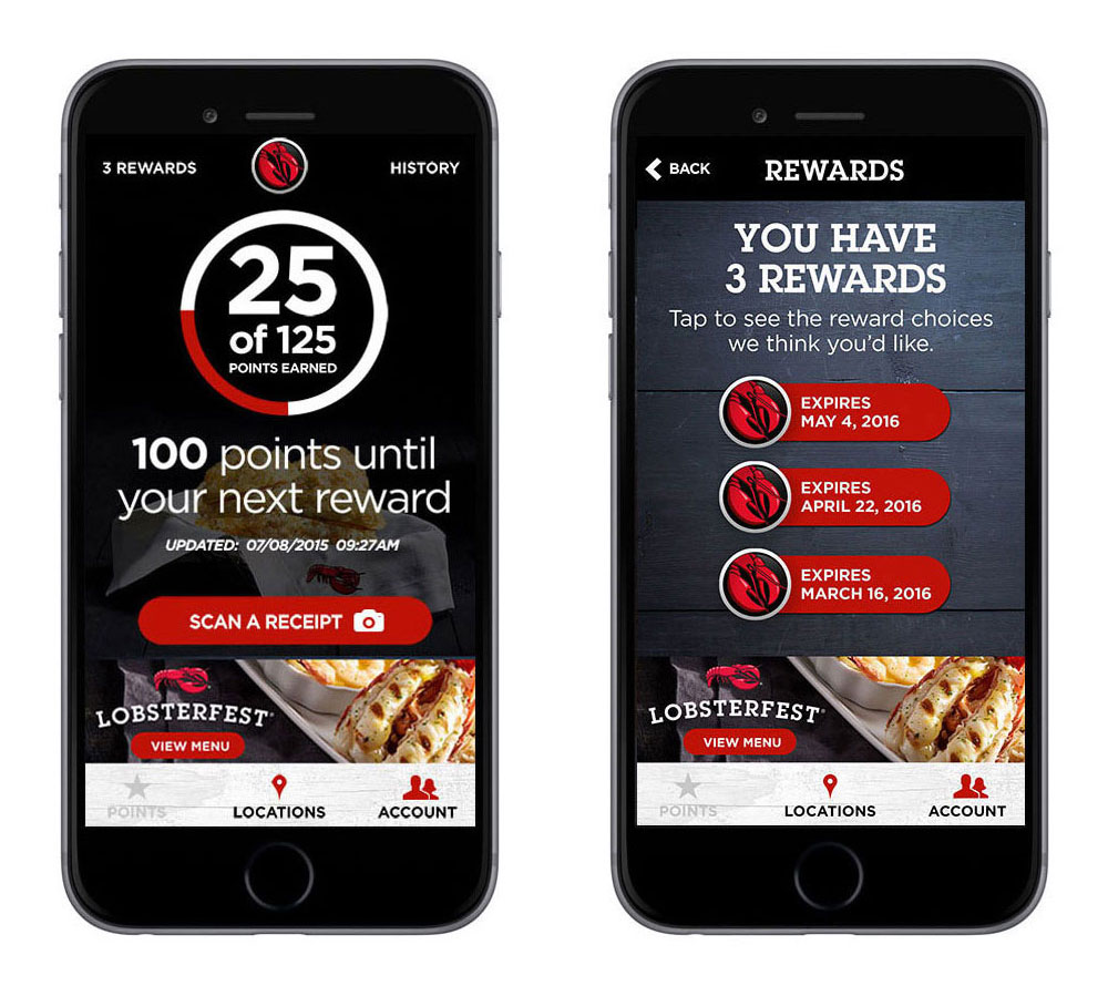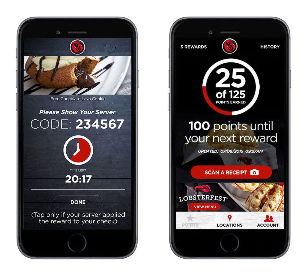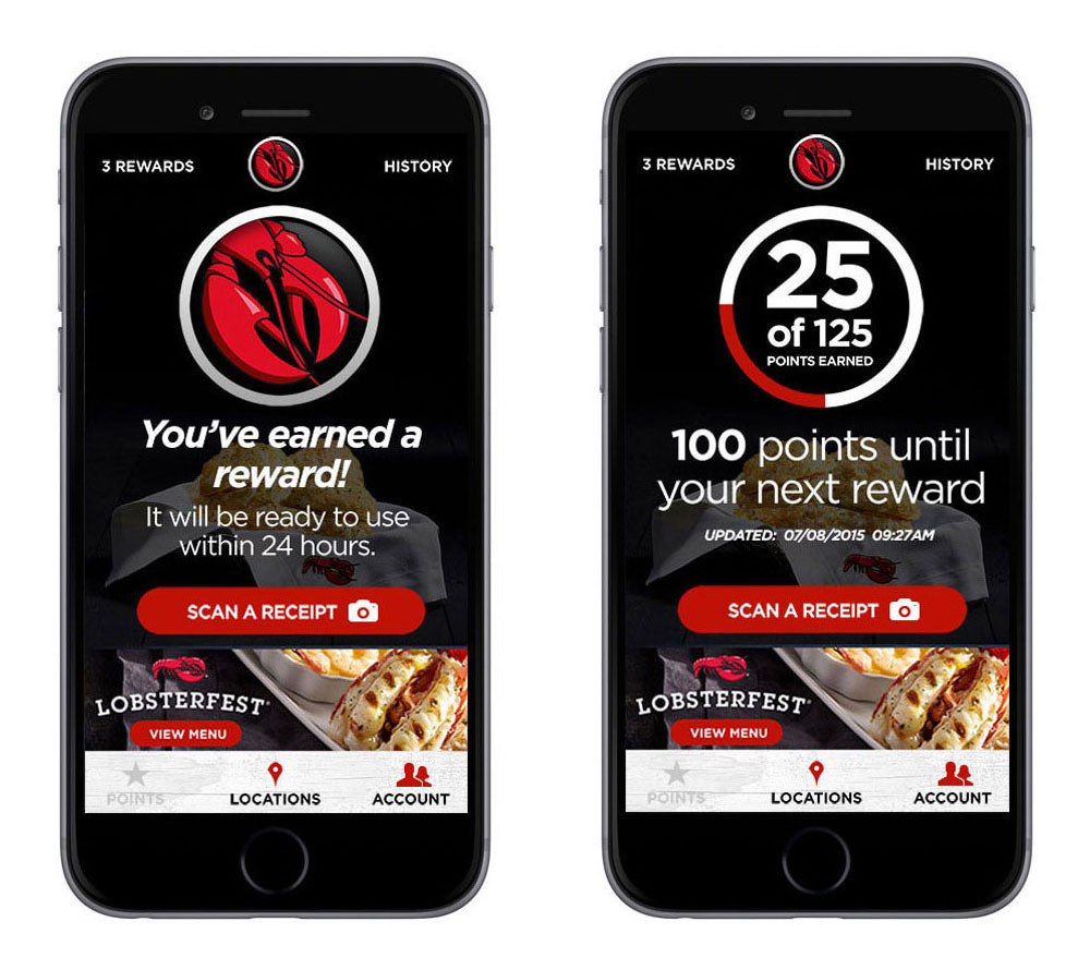 Logo and app visualized for Red Lobster for iOS and Android platform. It enables a Loyalty Program patron to scan a receipt each time they eat at Red Lobster to accumulate points. Each time 125 points is reached, a reward is earned.