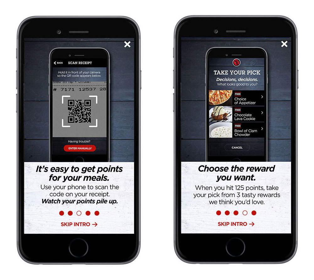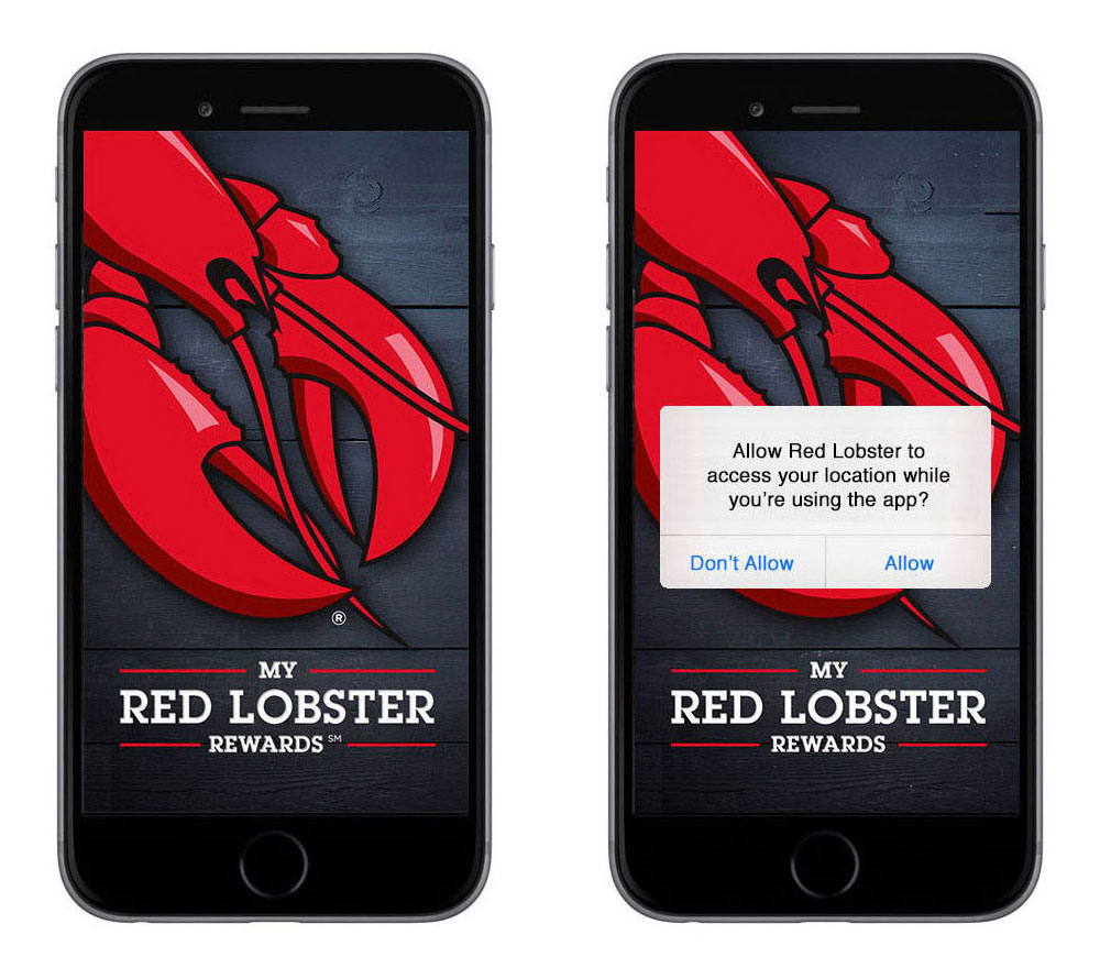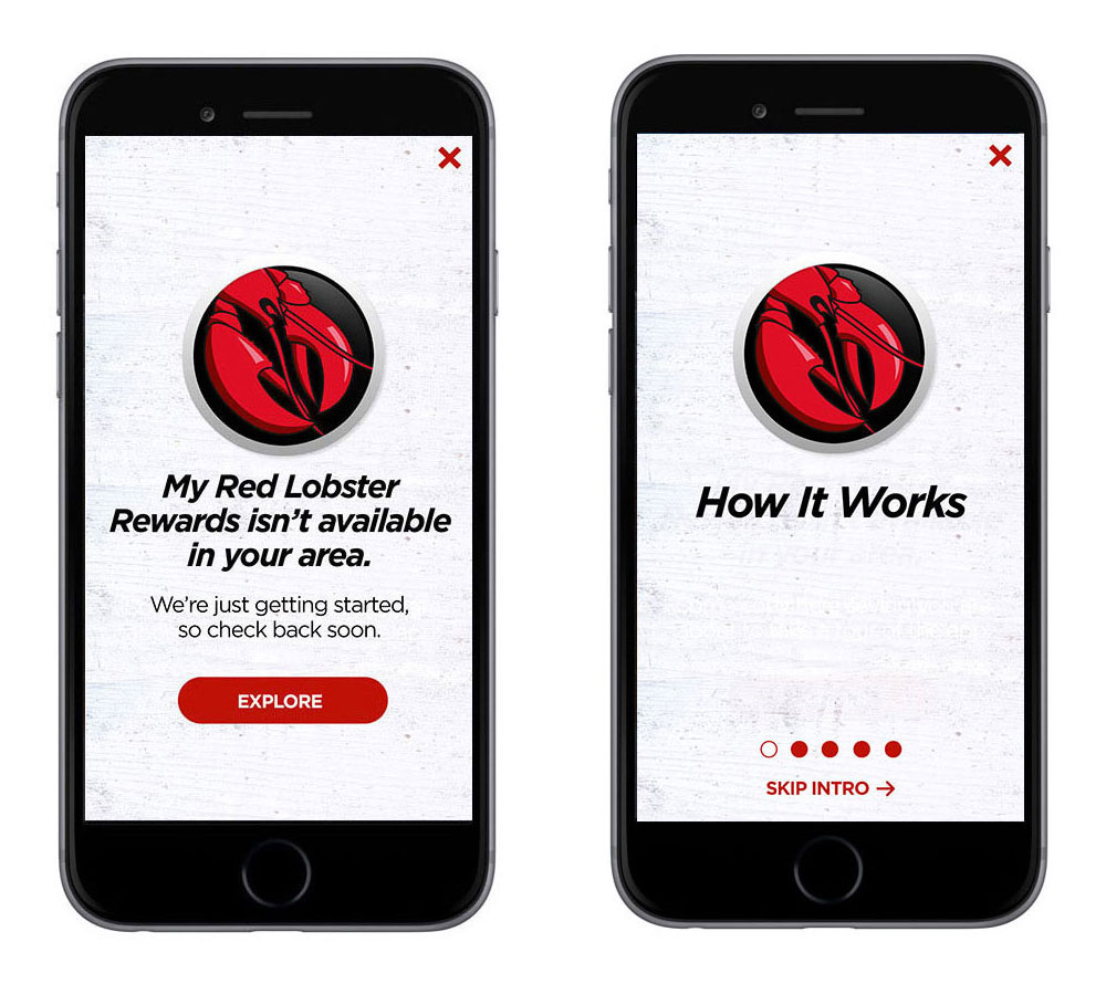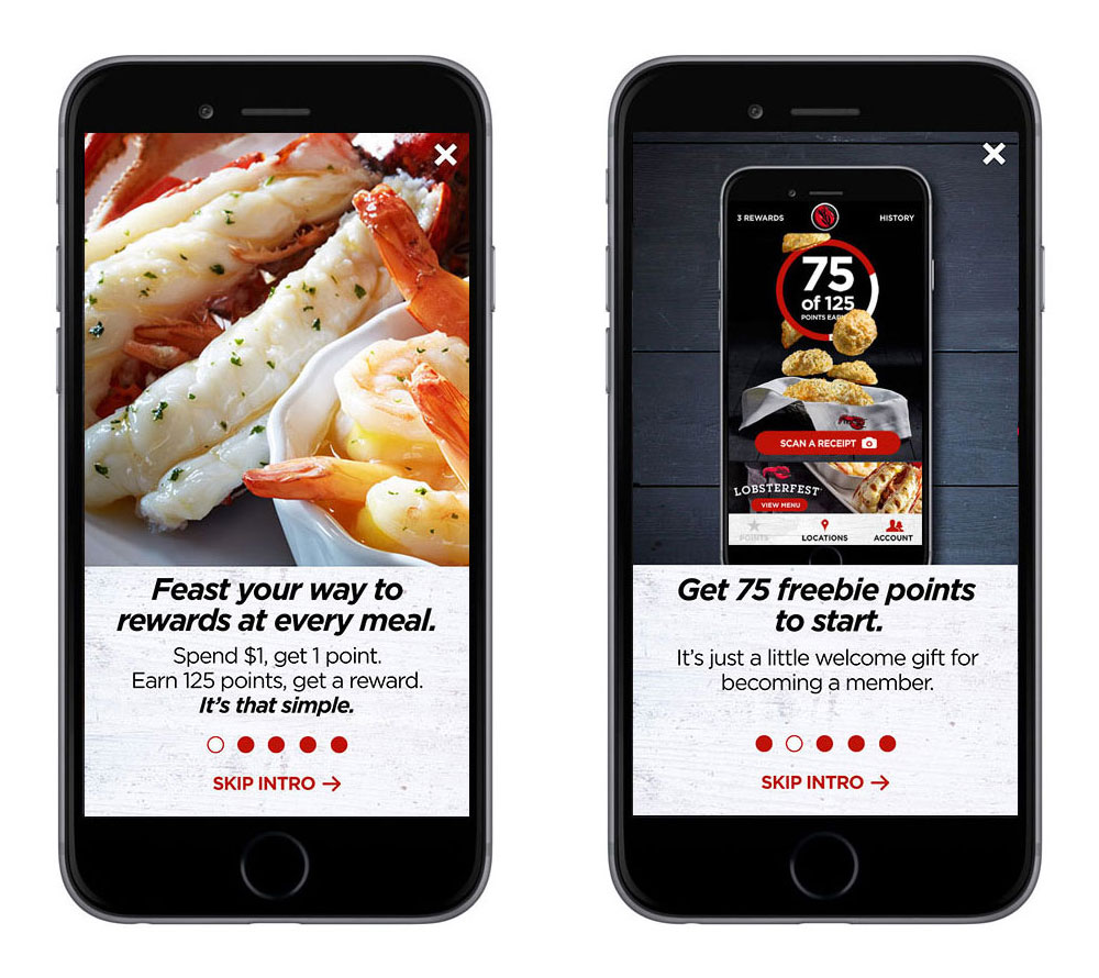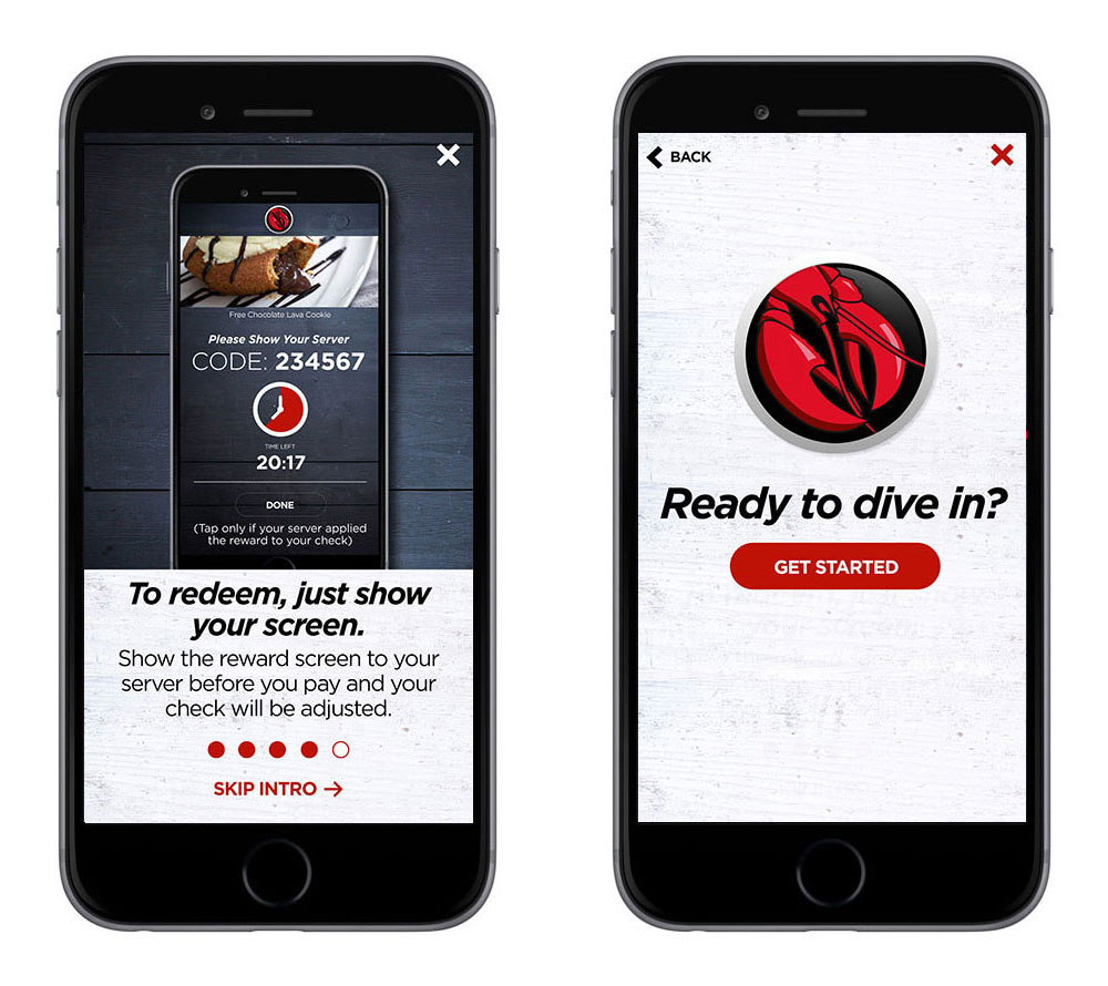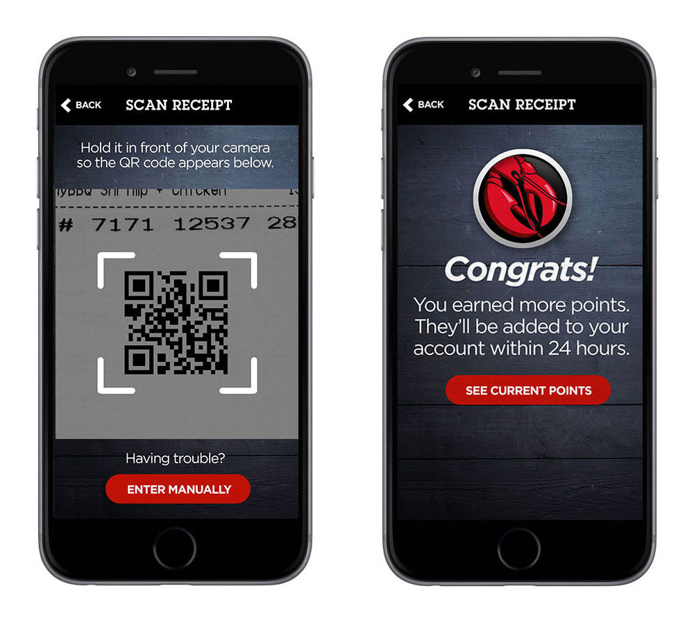 Logo and app visualized for Red Lobster for iOS and Android platform. It enables a Loyalty Program patron to scan a receipt each time they eat at Red Lobster to accumulate points. Each time 125 points is reached, a reward is earned.