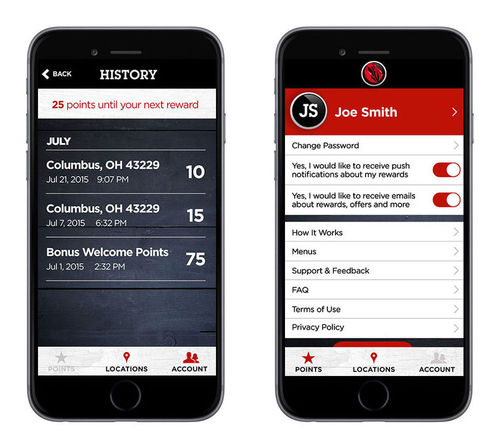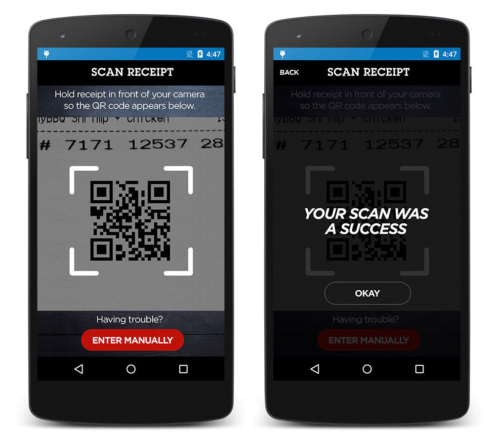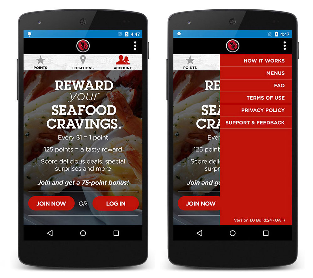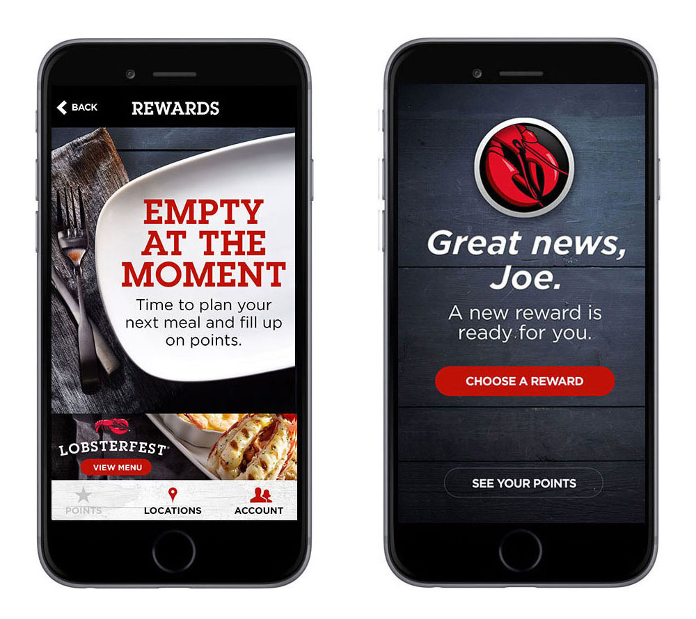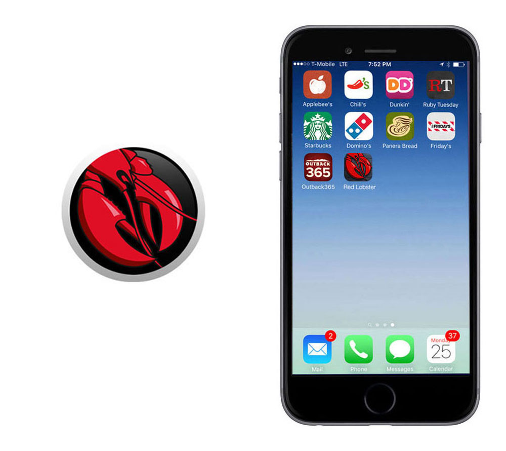 Logo and app visualized for Red Lobster for iOS and Android platform. It enables a Loyalty Program patron to scan a receipt each time they eat at Red Lobster to accumulate points. Each time 125 points is reached, a reward is earned.
