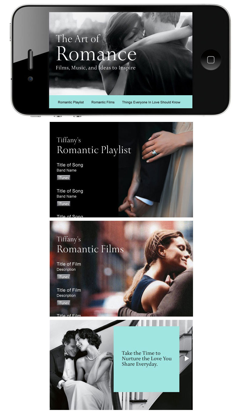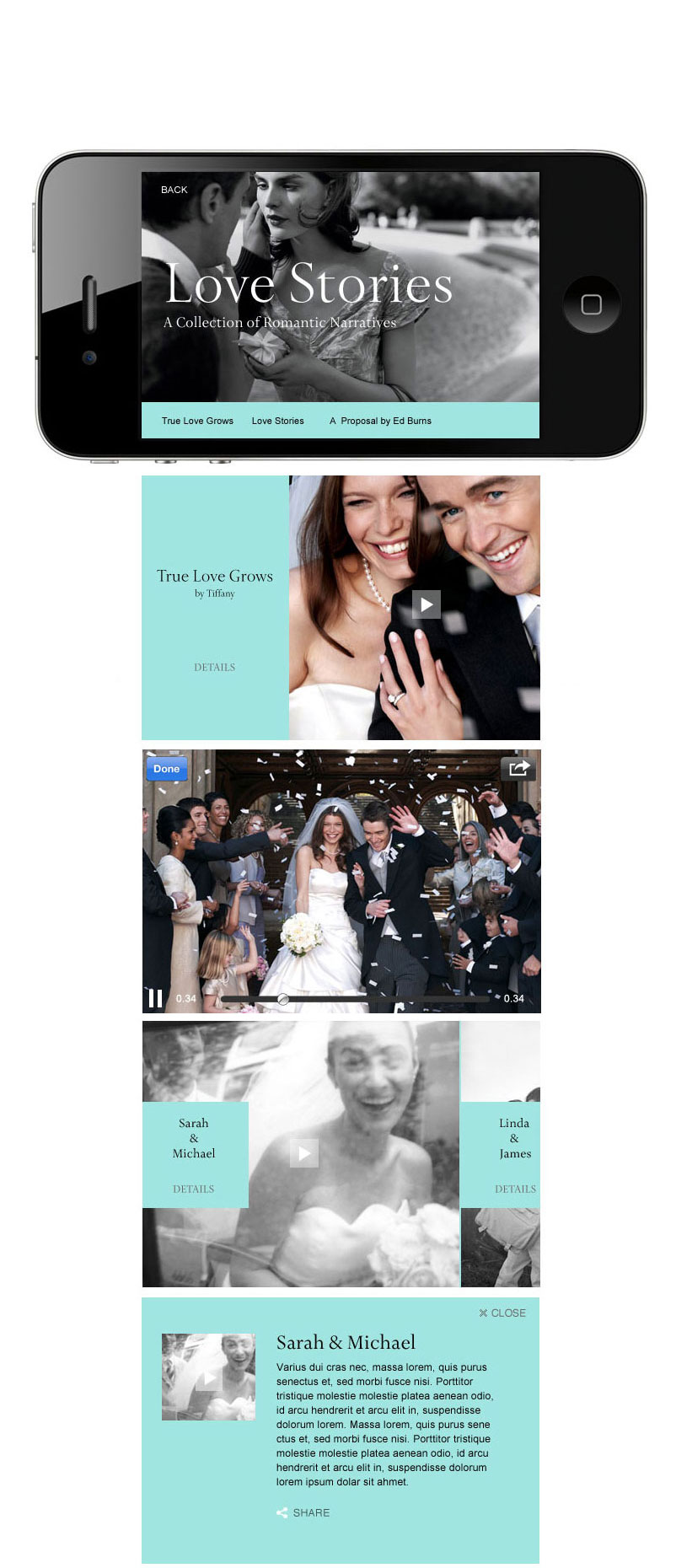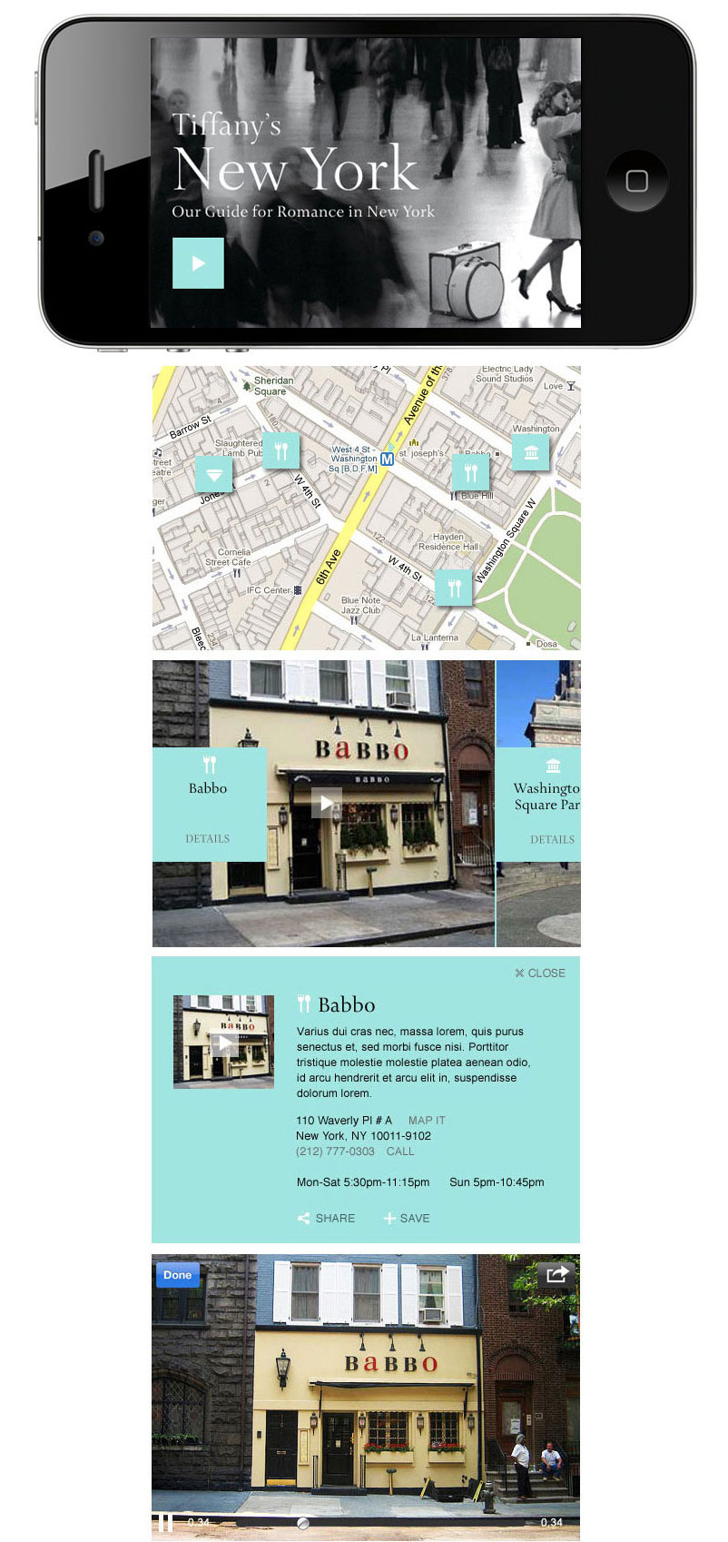 Design direction for iPhone app for Tiffany & Co. called What Makes Love True that gives a “Tiffany recommends” tour of New York City and allows users to digitally place love notes around the city.