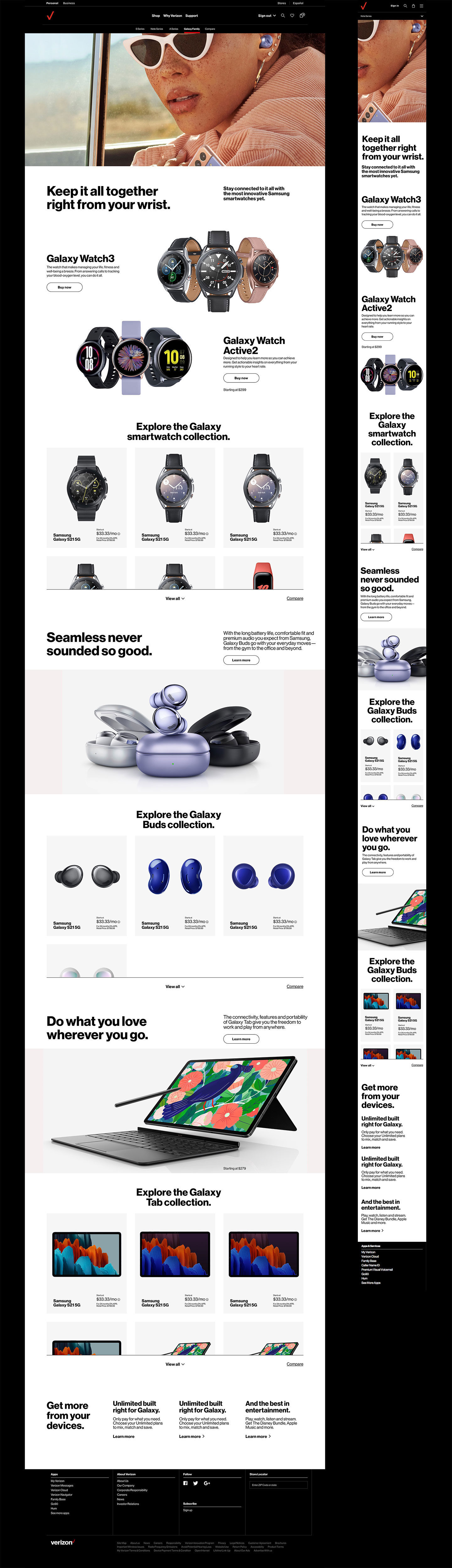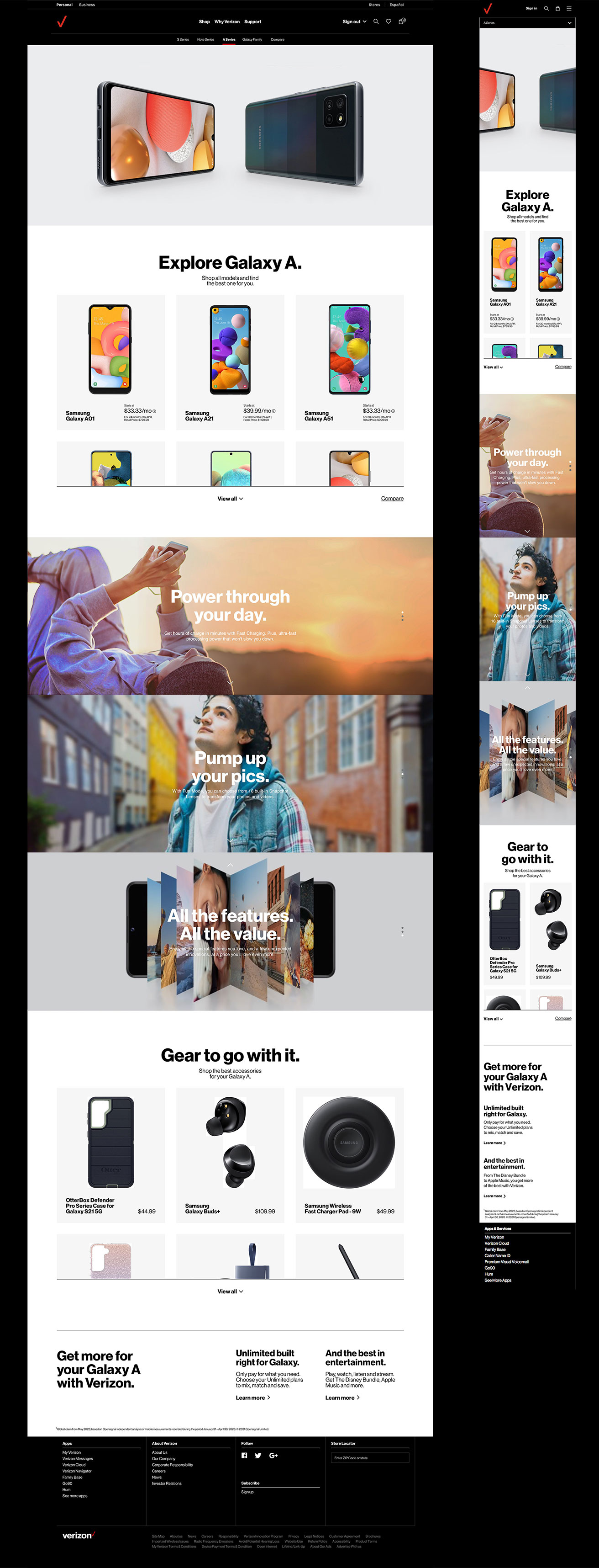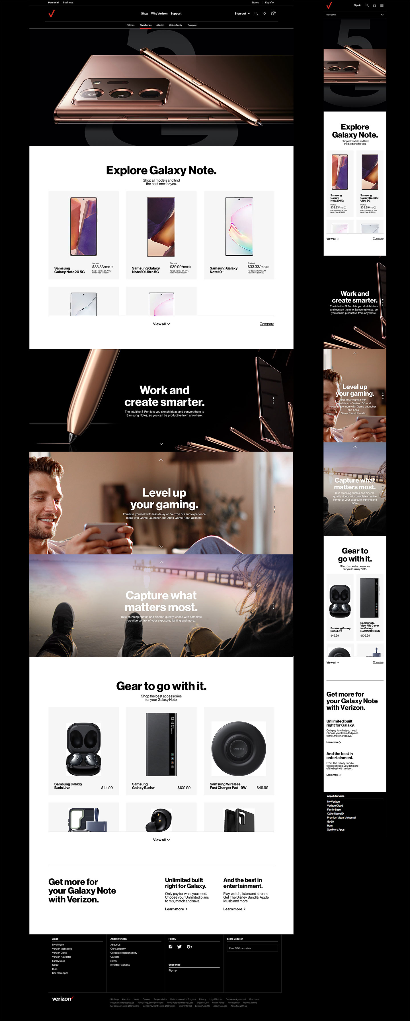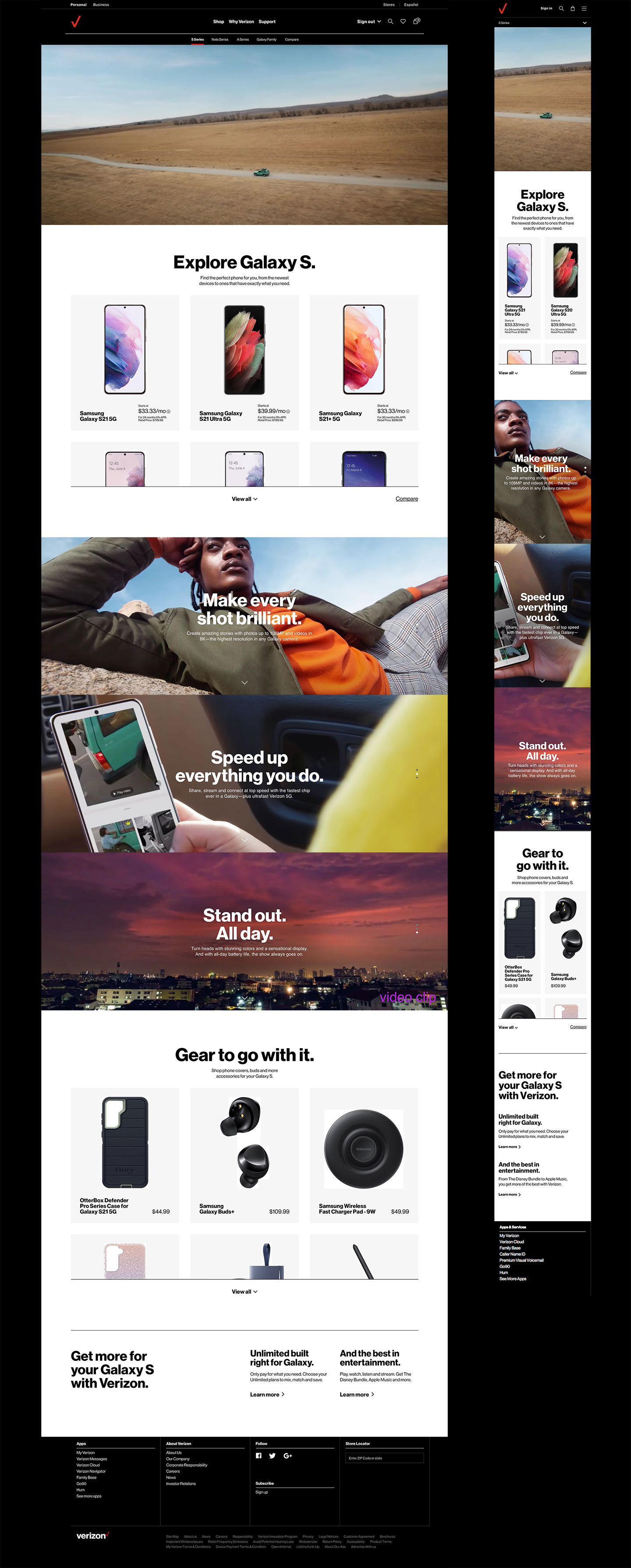 Design of intro sequences and landing pages for the Samsung Galaxy Spring 2021 campaign. Pages include the Note, A and S Series phones and the Galaxy Family page that includes watches, ear buds and tablets.