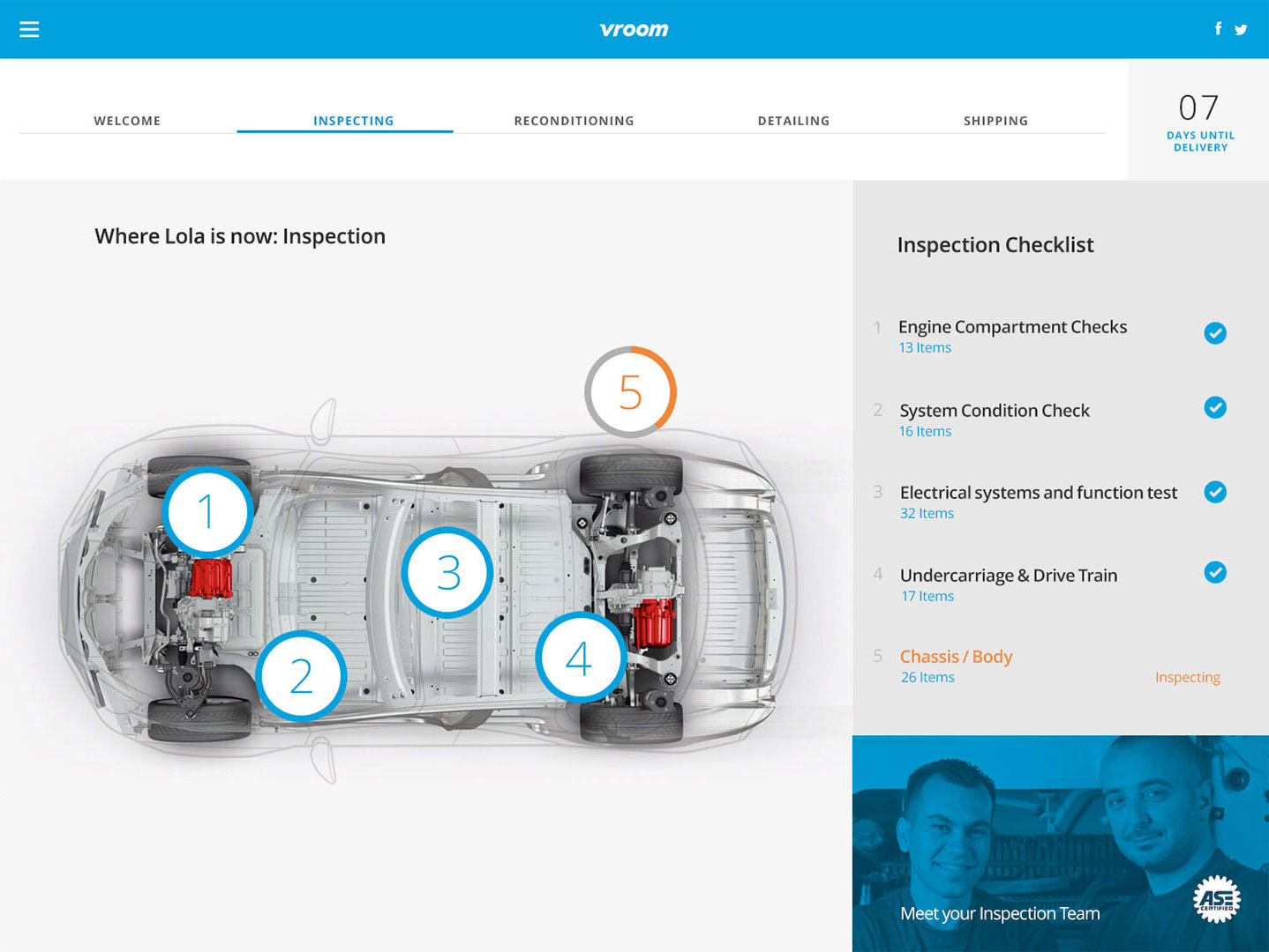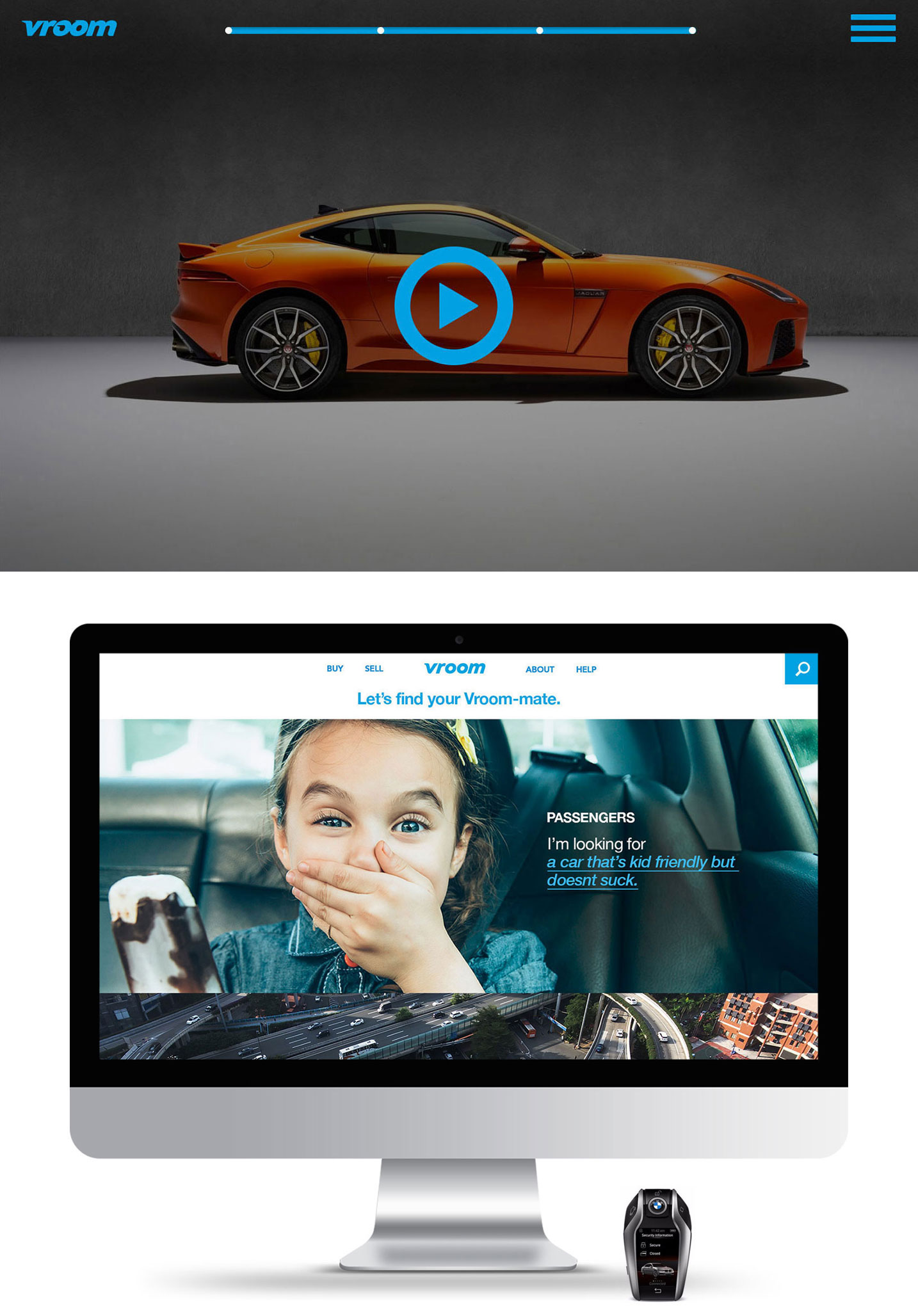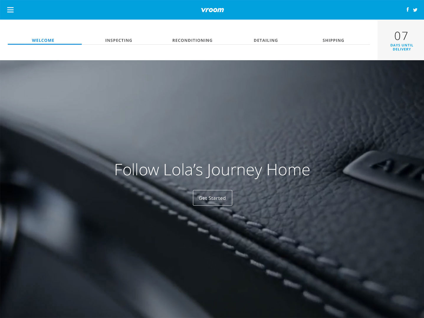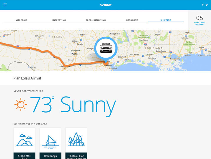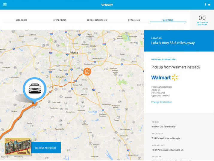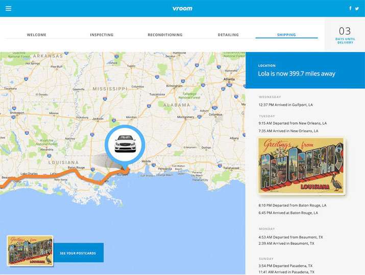 A pitch for an online car dealership called Vroom. The concept is the idea of buying your dream car and watching it's journey to your driveway. Check the status from purchase to inspection, reconditioning, detailing and finally shipping. Once shipped, you can follow the car's route via map to pinpoint exactly where it is and when it will arrive in your driveway.
